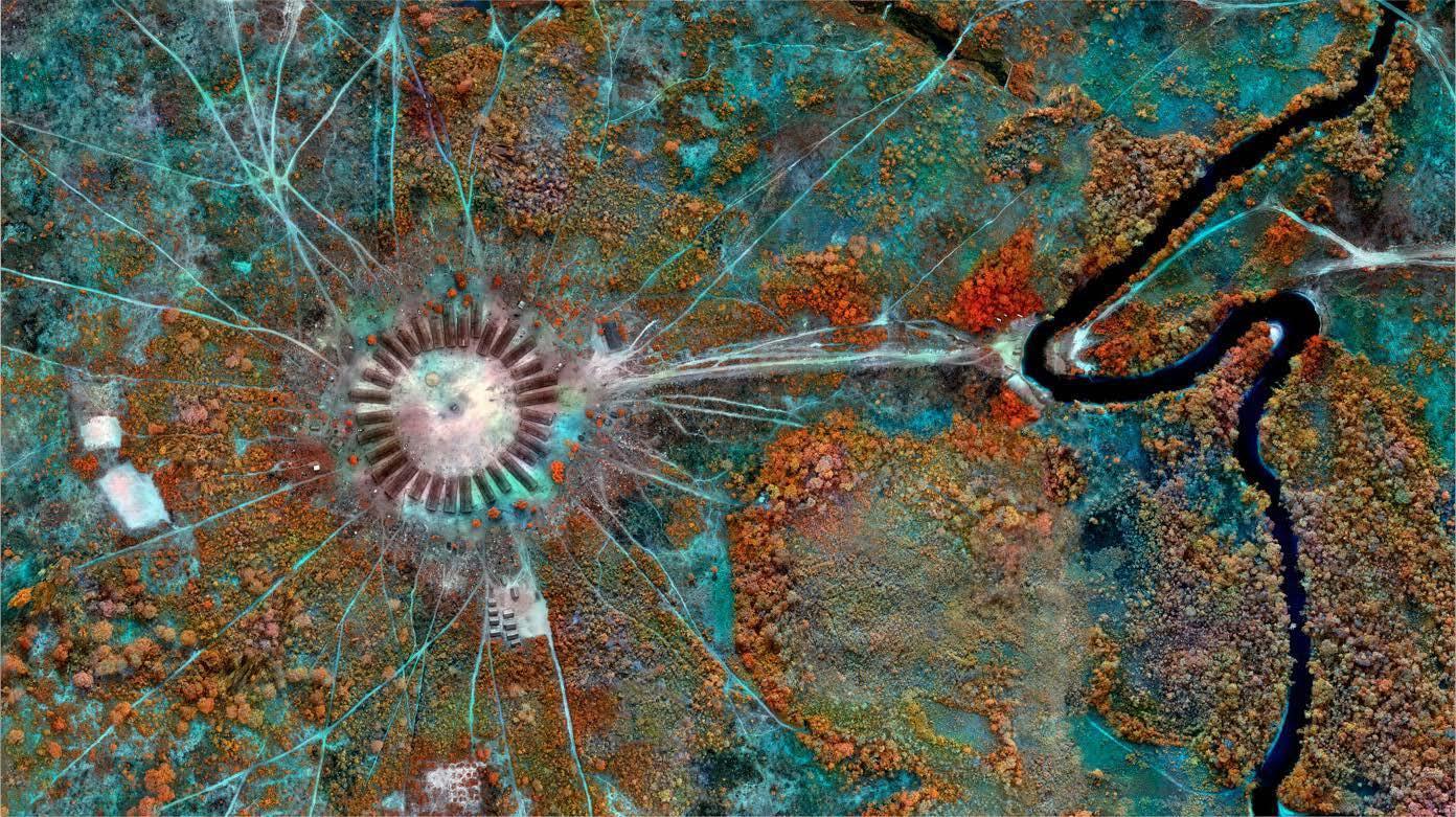 This multispectral GIS map shows the abandoned infrastructure of an oil plant built by Occidental Petroleum on Kichwa Indigenous Territory in the mid1970s, allegedly without their consent. This infrastructure was abandoned fifty years later in 2015. Yet, the corroding pipes were never maintained or dismantled, and numerous oil spills and toxic swamps have begun to appear, contaminating the forest and rivers with heavy metals. Details from this map show abandoned oil storage tanks that