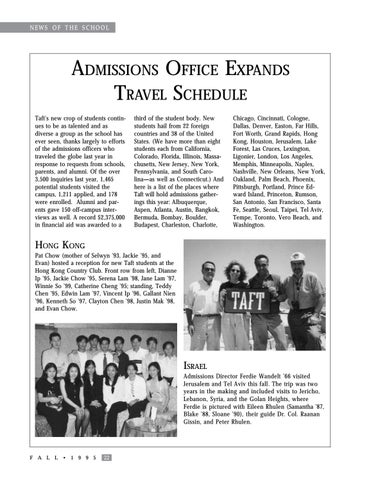 ADMISSIONS OFFICE EXPANDS TRAVEL SCHEDULE Taft’s new crop of students continues to be as talented and as diverse a group as the school has ever seen, thanks largely to efforts of the admissions officers who traveled the globe last year in response to requests from schools, parents, and alumni. Of the over 3,500 inquiries last year, 1,465 potential students visited the campus, 1,211 applied, and 178 were enrolled. Alumni and parents gave 150 off-campus interviews as well. A record $2,375,000 in financial aid was awarded to a