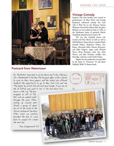 Students and their families were treated to performances of Moss Hart’s and George Kaufman’s well-loved comedy You Can’t Take It With You on the February Parents Weekend. Directed by Helena Fifer, the play’s fabulous set sent audiences back to 1936, at the Manhattan home of patriarch Martin Vanderhof, played by Javier Garcia ’05. The cast also included seniors Lily Cowles and Mac Morris (at left) as well as Nell Maltman, Spenta Kutar, Camden Flath, Donald Molosi, Madeleine Dubus, Eric Roper, Alexandra Kelly, Monica Raymunt, and Mike Negron; upper mids Michael Davis, Brian Romaine, John Ale, Matt Nelsen, and Skye Priestley; middler Sara Partridge, and lower mid Charlie Fraker. Support for the production was provided by the James G. Franciscus ’53 and James Hollyday Webb ’92 theater funds.