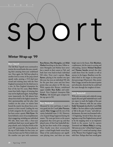 sport Winter Wrap-up ‘99 Boys’ Squash The Taft Boys’ Squash team continued to rewrite the record books this year, extending their amazing three-year undefeated run. Once again, the Taft boys played at another level in terms of the prep school squash ranks, posting a 19-0 dual meet record and running away with the New England tournament for the third year in a row. As New England champions for four of the last five years, Peter Frew’s teams have built a legacy of winning that may not be duplicated again. And perhaps more importantly, the Taft players have always been held in the highest esteem for their sportsmanship and fair play; their conduct on the court, no matter how heated the match, has always been as impressive as their record. Leading the way in both categories for the past four years has been senior captain Nick Kyme. He leaves behind a career of accomplishments that is staggering, including one individual NE title, three team titles, a four-year undefeated dual meet record against NE prep schools, and a 2nd place finish at this year’s NE tournament. He has played at the top of Taft’s ladder for four years, yet it has not been easy for Nick to hold onto the number one spot with teammates