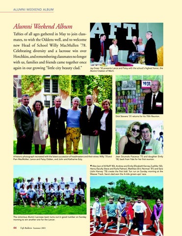 Alumni Weekend Album Tafties of all ages gathered in May to join classmates, to wish the Oddens well, and to welcome new Head of School Willy MacMullen ’78. Celebrating diversity and a lacrosse win over Hotchkiss, and remembering classmates no longer with us, families and friends came together once again in our growing “little city beauty clad.”