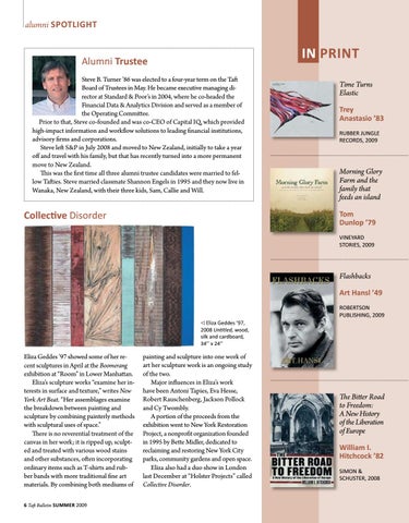 Eliza Geddes ’97 showed some of her recent sculptures in April at the Boomerang exhibition at “Room” in Lower Manhattan. Eliza’s sculpture works “examine her interests in surface and texture,” writes New York Art Beat. “Her assemblages examine the breakdown between painting and sculpture by combining painterly methods with sculptural uses of space.” There is no reverential treatment of the canvas in her work; it is ripped up, sculpted and treated with various wood stains and other substances, often incorporating ordinary items such as T-shirts and rubber bands with more traditional fine art materials. By combining both mediums of 6 Taft Bulletin SUMMER 2009