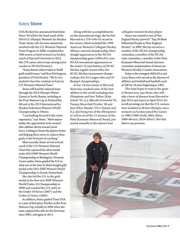 Katey Stone USA Hockey has announced that Katey Stone ’84 will be the head coach of the 2014 U.S. Olympic Women’s Ice Hockey Team. Stone, who became extensively involved with the U.S. Women’s National Team Program in 2006, completed her 18th season as head women’s ice hockey coach at Harvard University in 2012. Her 378 career wins is tops among active coaches in NCAA Division I. “Katey knows what it takes to build gold-medal teams,” said Ron DeGregorio, president of USA Hockey. “We’re very excited to have her continue to lead our U.S. Women’s National Team.” Stone will lead the national team through the 2014 Olympic Winter Games in Sochi, Russia, including at the Four Nations Cup in Finland this fall and at the 2013 International Ice Hockey Federation Women’s World Championship in Ottawa. “I am looking forward to the entire experience,” says Stone. “Most importantly, the opportunity to be around elite athletes driven toward excellence. Getting to know the players better and helping them strive to achieve their goals, is the best part of coaching.” Most recently, Stone served as head coach of the U.S. Women’s National Team that captured the silver medal at the 2012 IIHF Women’s World Championship in Burlington, Vermont. A year earlier, Stone guided the U.S. to what was at the time its third straight gold medal at the 2011 IIHF Women’s World Championship in Zurich, Switzerland. She also led the U.S. to the gold medal at the first-ever IIHF Women’s World Under-18 Championship in 2008 and coached the U.S. entry in the Under-18 Series (2007) and the Under-22 Series (2006). In addition, Stone guided Team USA to a pair of first-place finishes at the Four Nations Cup, initially in 2008 when the team captured the title for the first time since 2003, and again in 2011.