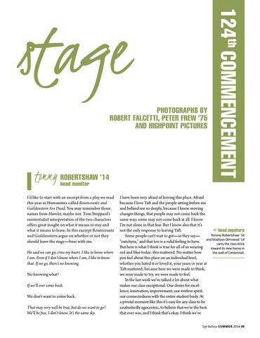 tommy head robertShaw ’14 monitor I’d like to start with an excerpt from a play we read this year in Humanities called Rosencrantz and Guildenstern Are Dead. You may remember those names from Hamlet, maybe not. Tom Stoppard’s existentialist interpretation of the two characters offers great insight on what it means to stay and what it means to leave. In this excerpt Rosencrantz and Guildenstern argue on whether or not they should leave the stage—bear with me. He said we can go, cross my heart. I like to know where I am. Even if I don’t know where I am, I like to know that. If we go, there’s no knowing. No knowing what? If we’ll ever come back. We don’t want to come back. That may very well be true, but do we want to go? We’ll be free. I don’t know. It’s the same sky.