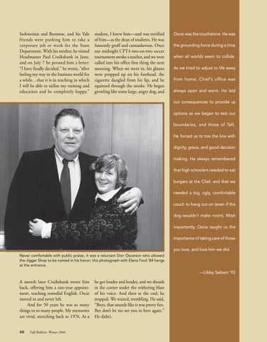 Oscie was the touchstone. He was the grounding force during a time when all worlds seem to collide. As we tried to adjust to life away from home, Chief’s office was always open and warm. He laid out consequences to provide us options as we began to test our boundaries, and those of Taft. He forced us to toe the line with dignity, grace, and good decision making. He always remembered that high schoolers needed to eat burgers at the Chef, and that we needed a big, ugly, comfortable couch to hang out on (even if the dog wouldn’t make room). Most importantly, Oscie taught us the importance of taking care of those you love, and love him we did.