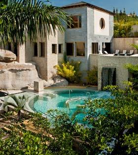 Los acabados de materiales sobrios en toda la casa en general honran el tejido arquitectónico de Los Ángeles de mediados de siglo. Los pisos de estuco, travertino y madera establecen una paleta neutra, honesta y sin adornos rica en texturas, cálida y sensual. El uso abundante de piedra caliza de Jerusalén cincelada es un guiño más específico al cercano Museo J. Paul Getty, que complementa el paisaje de inspiración mediterránea, que al igual que la arquitectura, se adapta bien al clima local y al estilo de vida asociado.