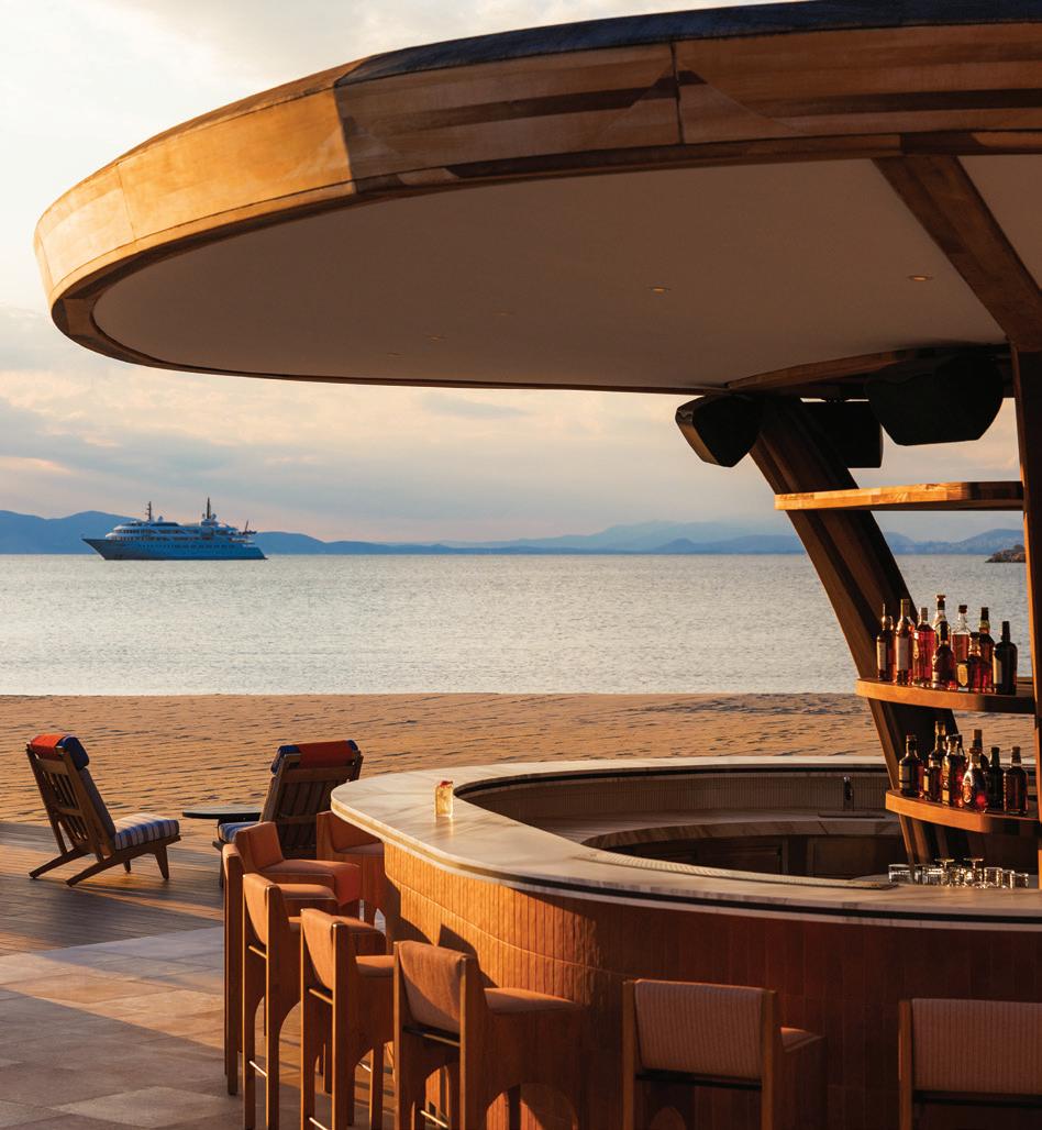 RIVIERA REVIVAL. One&Only Aesthesis was formerly the iconic Asteria beach club, made famous in the Sixties and Seventies as a posh enclave for filmmakers, movie stars, and musicians. Not one, but three architecture firms—AUDO, A6Architects, and K-Studio—along with interior design studio Muza Lab, were commissioned to reimagine the storied site. Greek and French influences abound, anchored by the highly visual poolside, while history and glam are intertwined throughout the property’s aesthetic. The new iteration takes full advantage of the sprawling grounds, which houses just over a dozen guest rooms in the main building, one- and-two-bedroom villas, plus private residences. Culinary standouts include restaurants of master chefs Ettore Botrini and Paco Morales (try them both), who create Italian, Greek, and Moorish artistry, as well as Manko Athens, an indooroutdoor space where day dining easily mingles into night. Also not to miss: Greece’s first Guerlain Spa—a Parisian-inspired respite from city life steeped in the art of wellness, skincare, and customized treatments. Of course the fitness center is also magnificent, while a tennis game at Club One is an experience you’ll never forget.