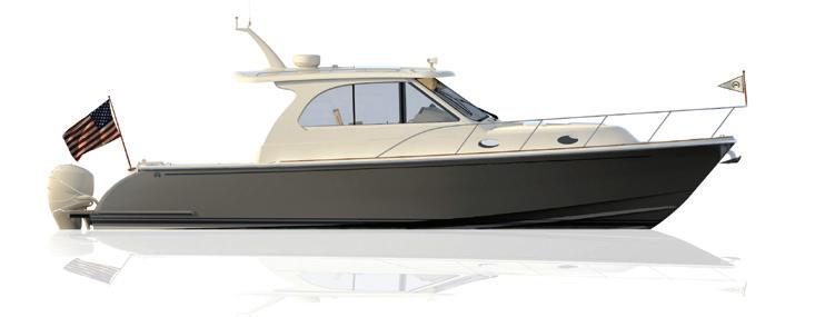 THE HINCKLEY 35 IS A COLLABORATION with the best in the business. Numerous offshore racing trophies and naval architecture awards are what set Michael Peters Yacht Design apart. Its team designed a perfectly balanced hull on the Hinckley 35, optimized for speed and comfort. Peters included optimized chines and strakes to provide lift and stability at the higher speeds associated with outboard propulsion. What’s more, the moderate transom deadrise on the Hinckley 35 and fine entry make her a joy to drive in diverse conditions. On a hull optimized for outboard propulsion, 48 mph has never felt so graceful.