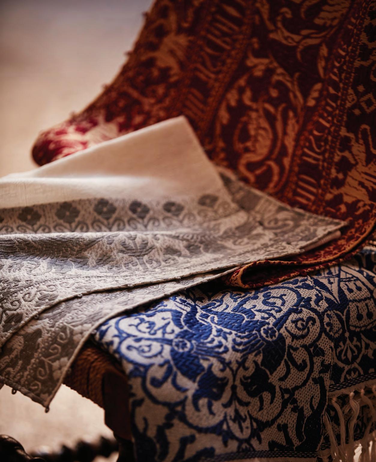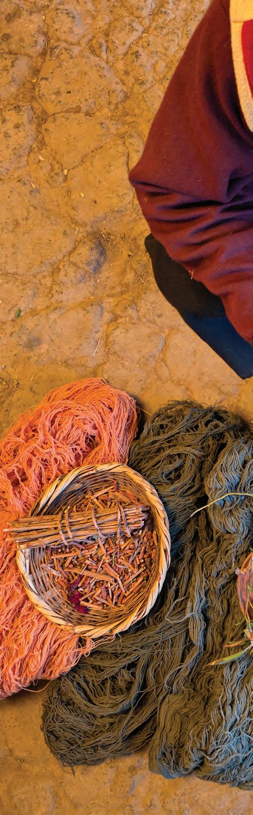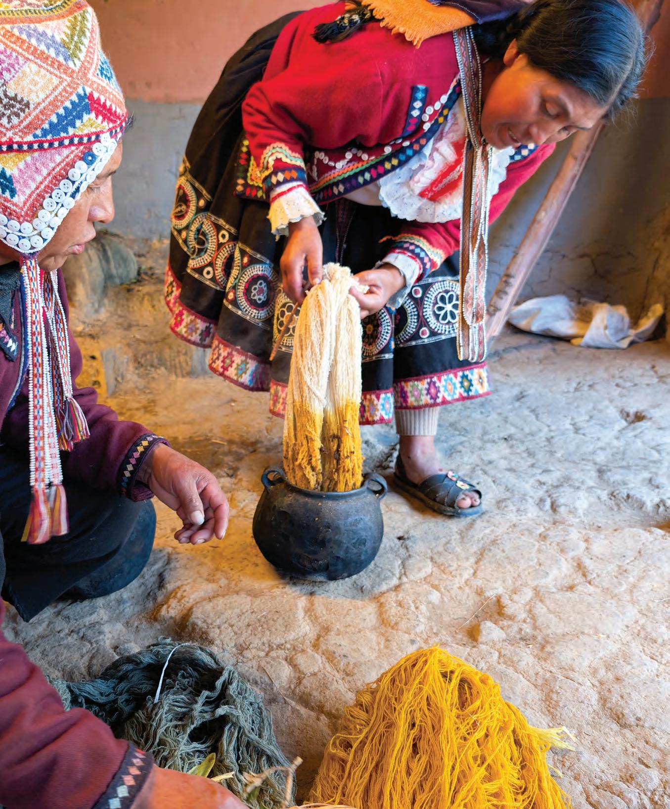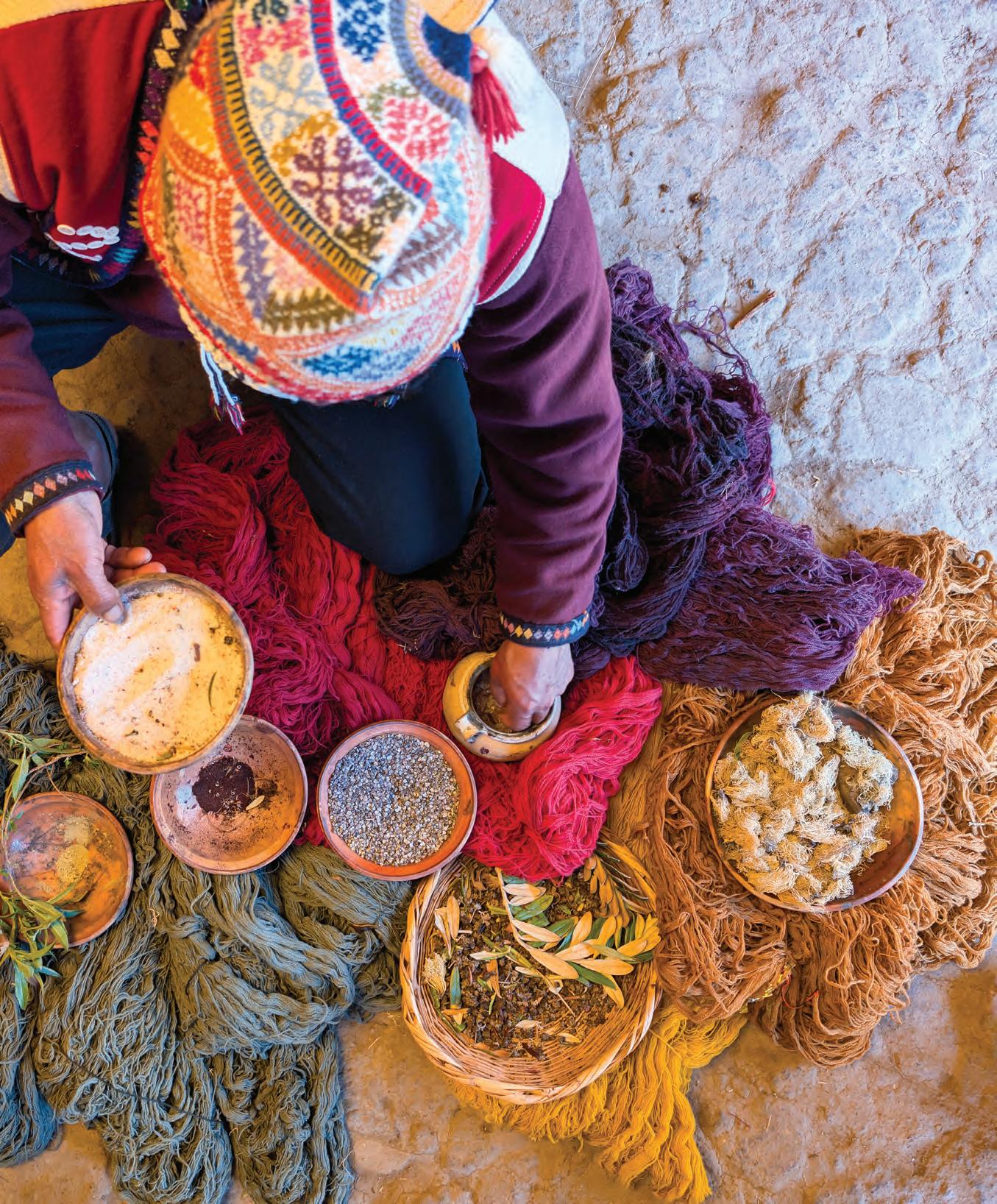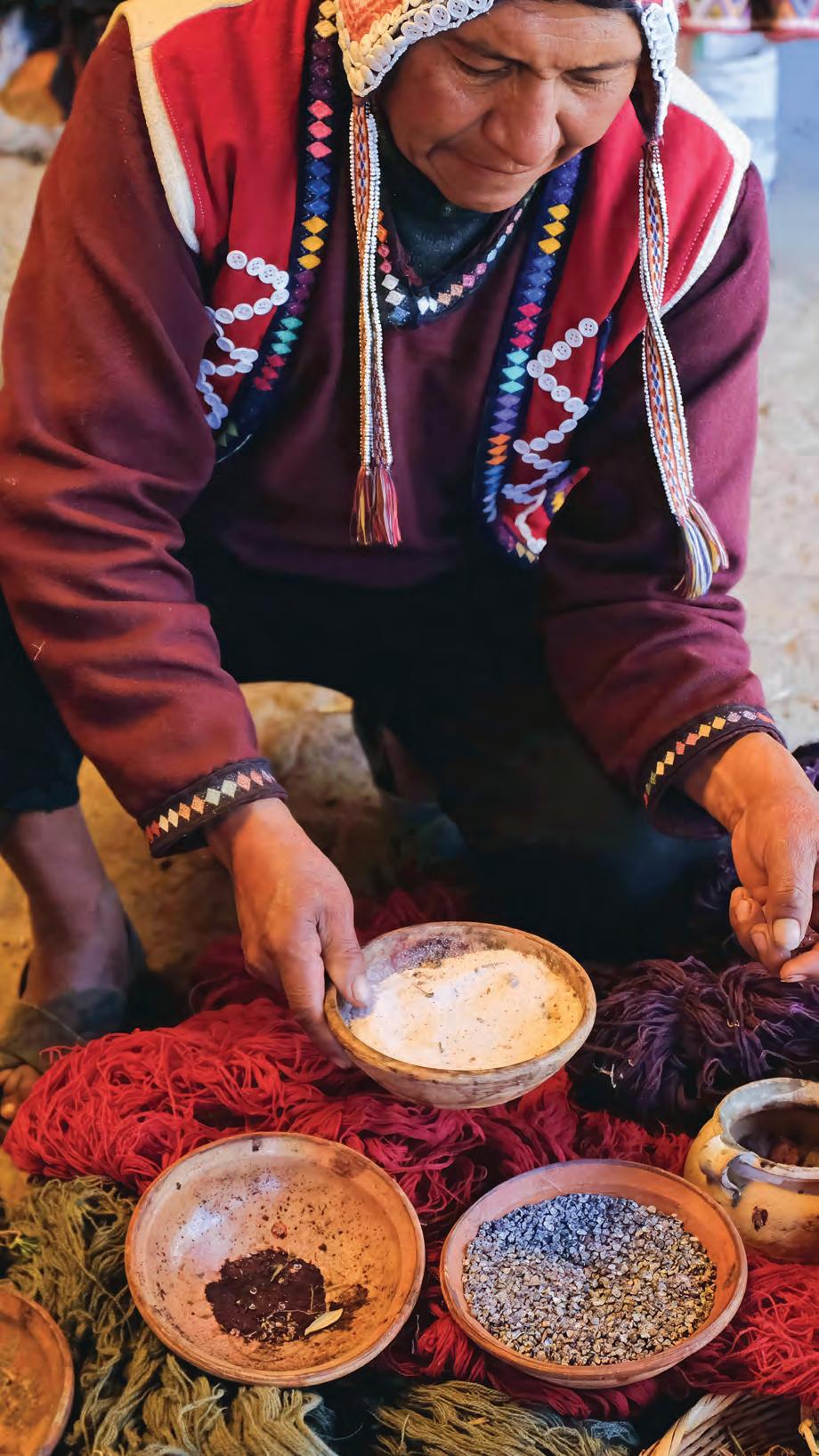 Weaver and natural dye expert Cirilo Yucra Mamani shows us to a bench across the courtyard where a rainbow of hand-spun, hand-dyed alpaca thread hangs from wooden hooks on a wall. Mamani explains in Quechua that while many other Andean artisan communities have embraced the speed and ease of synthetics, the weavers here use earth-derived color recipes handed down from their grandparents and perfected over generations. Ingredients (pictured on the opening page) include blue flower petals sourced from the Amazon rainforest, green leaves from local plants, orange-yellow tree bark and lichens, and bright pink, beetle-like bugs called cochineals. In the workshop today, one of the weavers dips a skein of spun wool into a small iron cauldron, turning it sunflower gold.