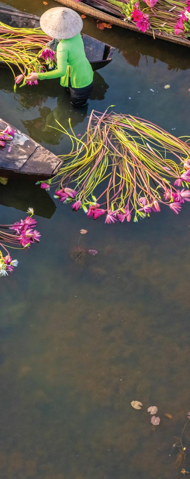 When floodwaters rise in Vietnam’s Mekong Delta, local farmers gather to harvest delicate water lilies from the shimmering wetlands. This ageold tradition fosters a deep bond with the land, preserves cultural identity, and supports ecotourism—selling the blooms in markets, and using them in meals and local ceremonies. Travelers, too, can help protect Vietnam’s river heartland and biodiversity: When journeying with Abercrombie & Kent, guests go deep into the Mekong Delta, gliding by sampan (a flat-bottomed wooden boat) through waterways filled with lotus flowers and water lilies. Guided excursions with community members reveal local markets, riverside villages, and ancient harvesting traditions, providing insight into daily life and cultural continuity.