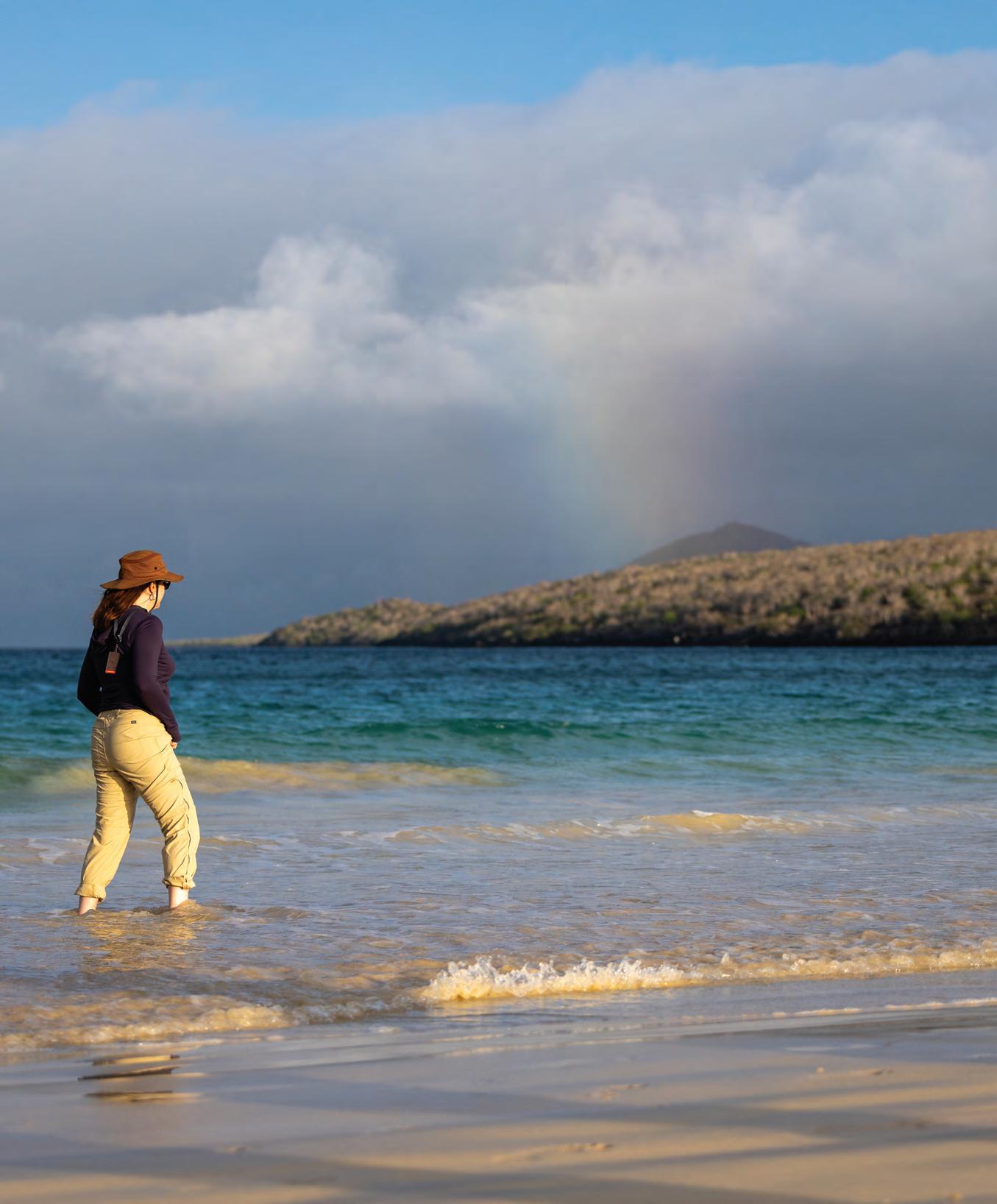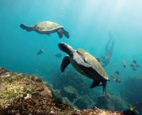 Opposite: A quiet walk on a Galápagos beach. From top: snorkling with turtles; exploring the archipelagos, a view of the pristine region.