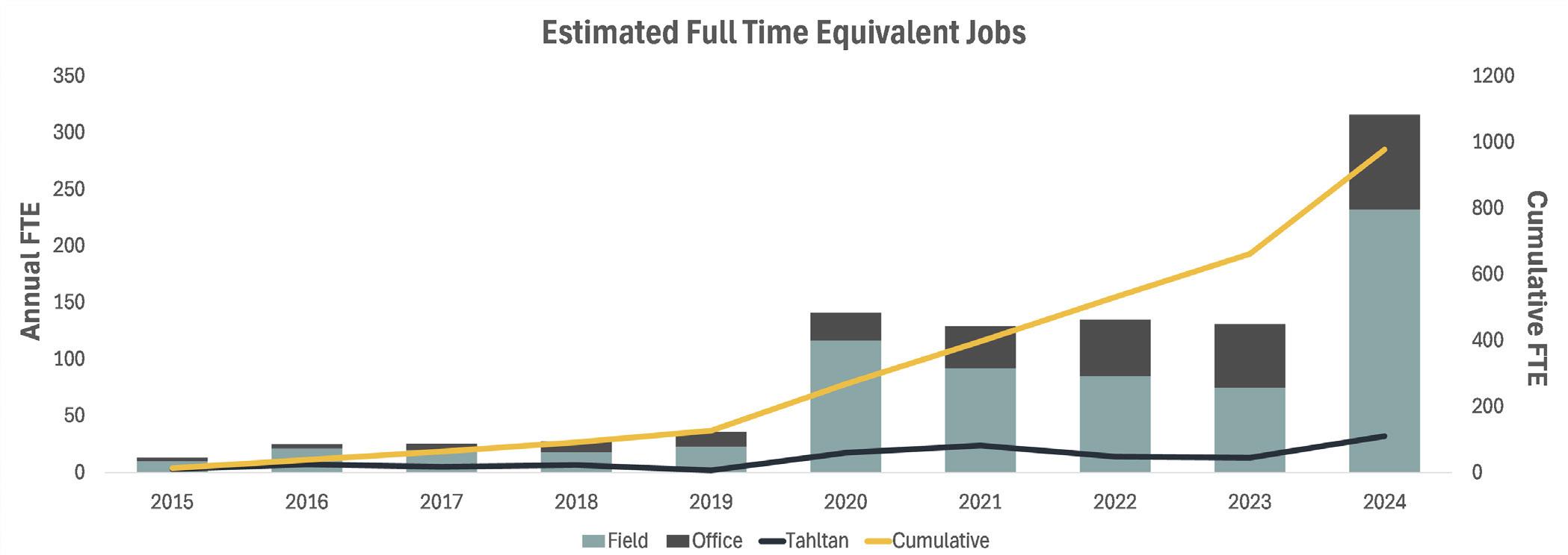 In 2024, Skeena Gold + Silver employed the equivalent of 766 full-time jobs in BC, which includes 450 sitebased contractors and 316 Skeena employees. As Skeena’s flagship asset, Eskay Creek, is located within Tahltan territory, most of these positions were filled by those from rural communities in northwestern British Columbia, such as Dease Lake, Iskut, Telegraph Creek, Terrace, and Smithers.