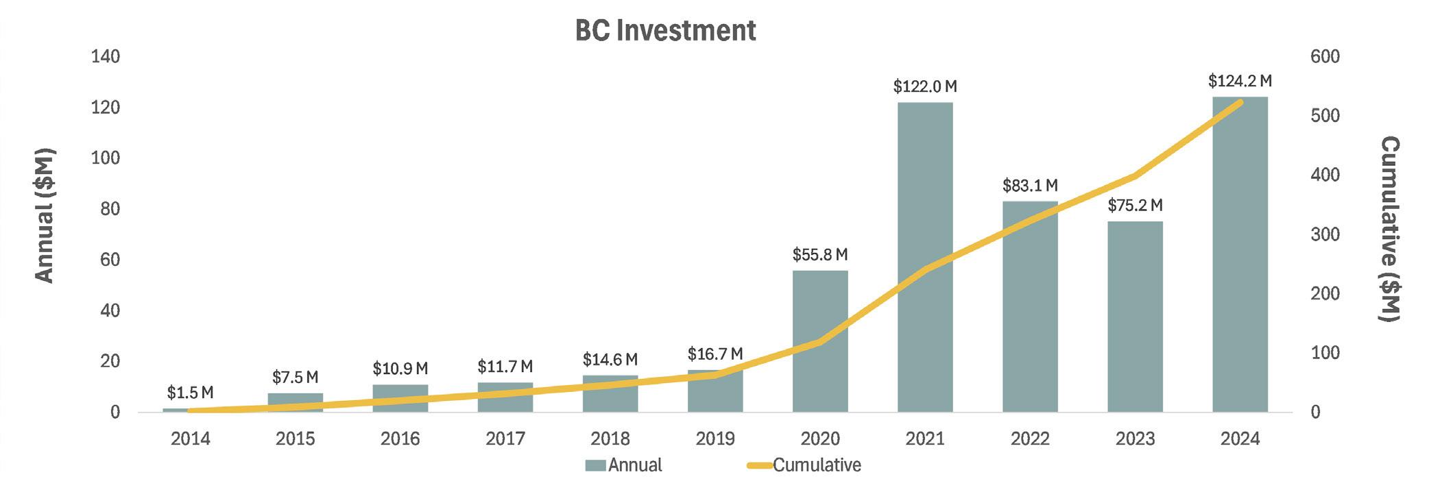 In 2024, Skeena’s annual contribution to the BC economy was more than 81 times greater than what it was when Skeena first focused work activities in BC in 2014. Skeena’s total expenditures in BC from 2014 to 2024 are over $523 million. In 2024 alone, Skeena invested more than $124* million in British Columbia, with over 42% of that sum going towards wages, service providers, and small businesses in the northwest region of BC.