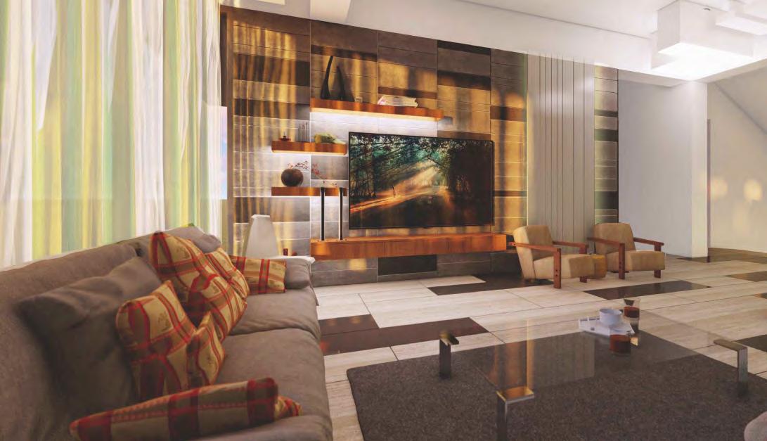 An influential role was played by the layout of floor tiles and the design of the reflective ceiling in the interior. The common areas were covered with natural and walnut-colored wooden tiles, while the living room was dominated by marble to present an elegant atmosphere.