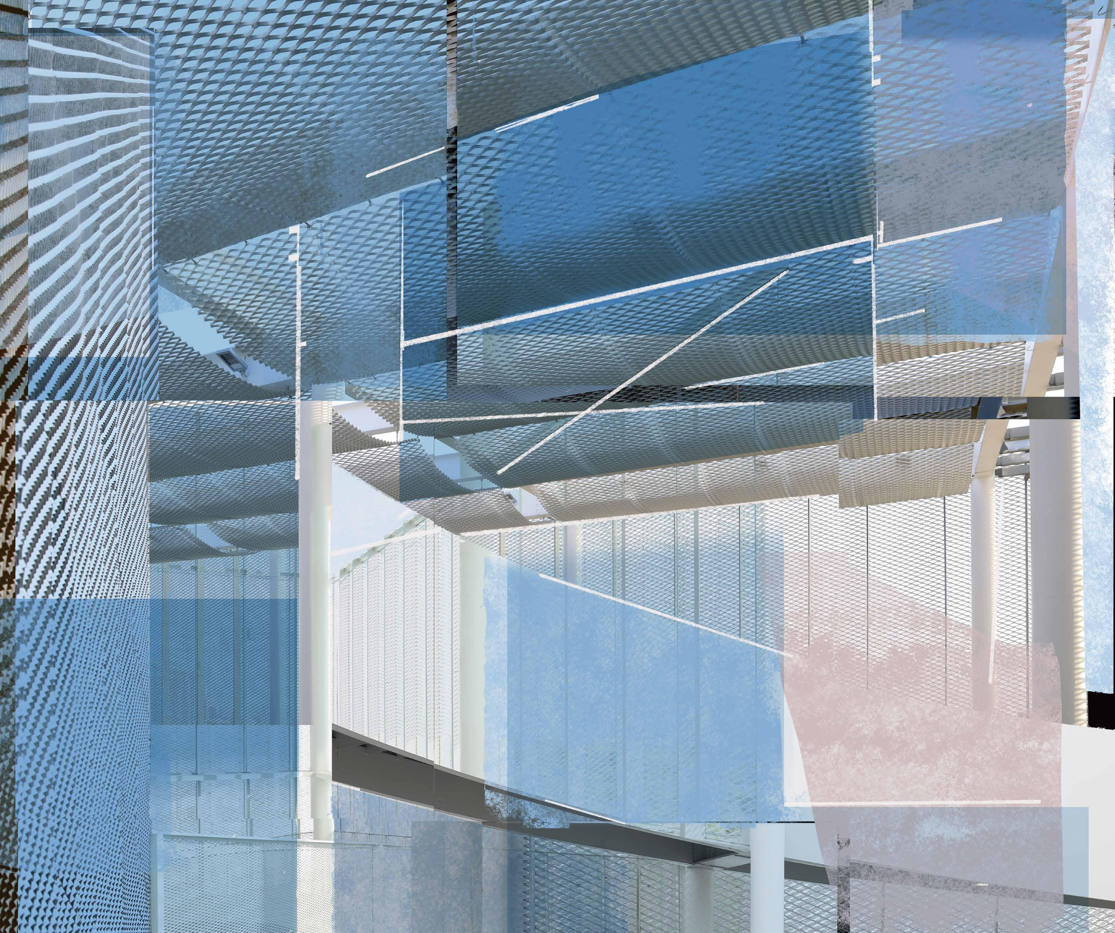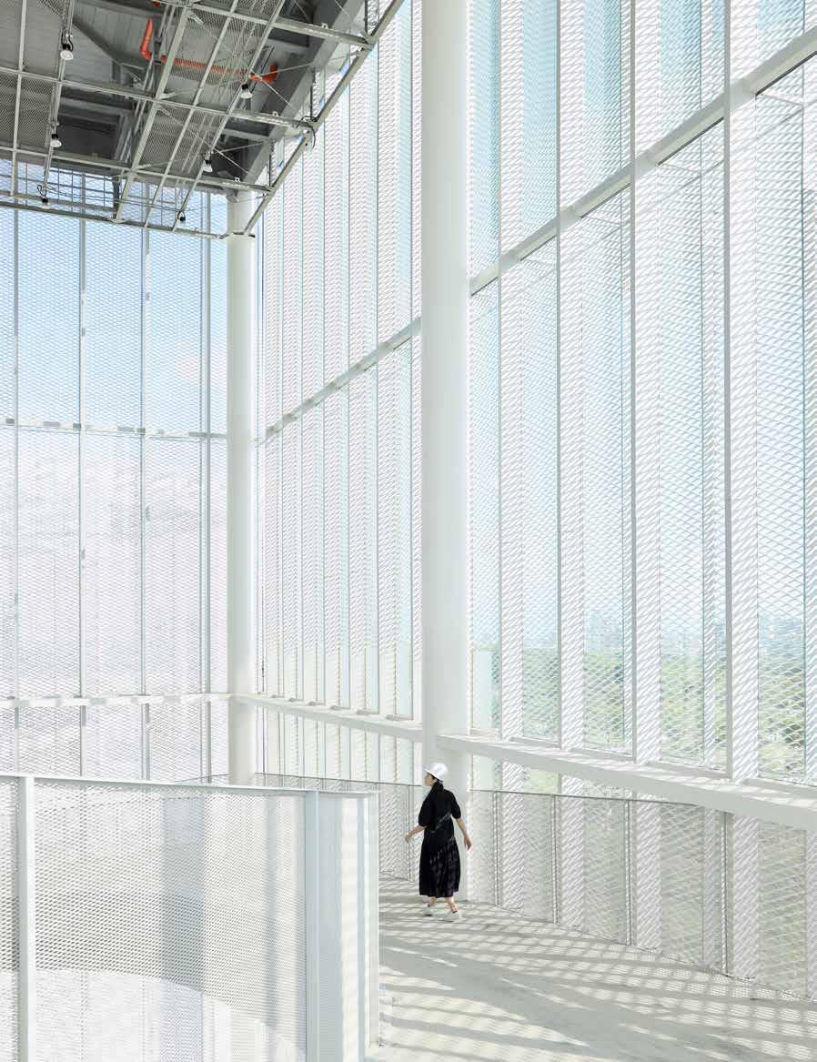 glass, and expanded metal mesh curtain walls to promote visual lightness and transparency while ensuring structural stability. The angles of the expanded metal meshes were calculated to allow in external light and views of the park while regulating sun exposure, contributing to the concept of green architecture and gently modulating the temperature differences between the buildings and the park, a feature to be perceived by people upon entering the Taichung Green Museumbrary’s lobby.