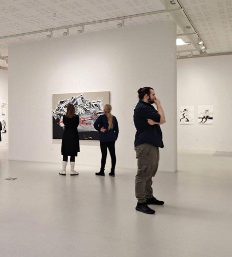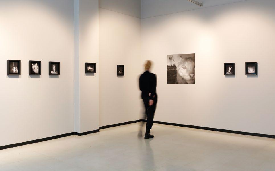 Nykyajan kuukausittain vaihtuvat näyttelyt nostavat esiin valokuva- ja videotaidetta. Tässä kuvassa ihaillaan Juha Suonpään näyttelyä Metsän kissa.