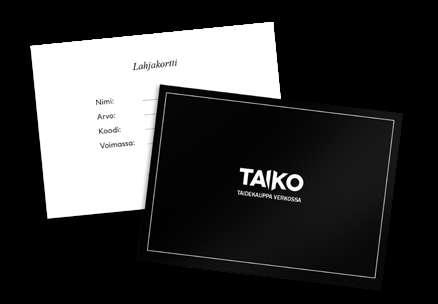 Miten ostan taidetta Taikosta?Taiko on maailman laajin suomalaisen kuvataiteen markkinapaikka, jossa sadat suomalaiset ammattitaiteilijat myyvät ja esittelevät teoksiaan. Taikossa on tarjolla laaja valikoima maalauksia, grafiikkaa, valokuvataidetta ja veistoksia eri hintaluokissa. Ostaja voi etsiä taidetta monipuolisen hakutoiminnon avulla. Siinä haun voi rajata esimerkiksi hinnan, koon, aiheen, värin ja tekniikan perusteella. Taikon ainutlaatuisen kuvatoiminnon Taiko Testin avulla ostaja voi kokeilla, miltä teos näyttää omassa kodissa tai toimistossa ennen ostopäätöksen tekemistä.