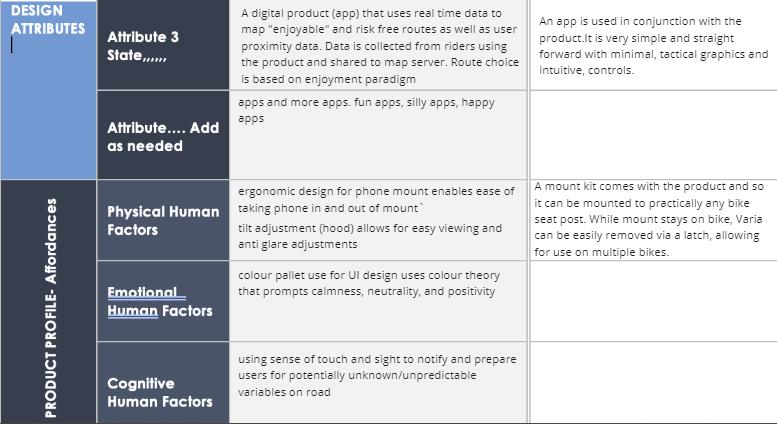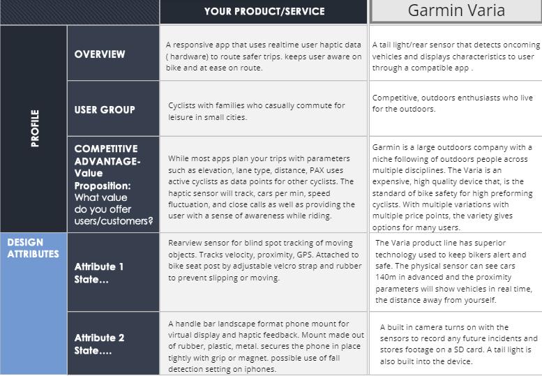 Parents, age 45 to 65, ride their bicycle significantly less over their past 20 years, due to increased fear of fatality with others on the shared the road. Keeping and feeling healthy is a crucial aspect in their busy lives but is drastically inhibited by this looming anxiety. The Varia: PAX foundations, put focus on navigation, to aid their physical and mental health. Our hybrid product combines a digital application with a physical phone accessory that will support an informed, and aware cycling experience. The responsive routing system will choose for them, the safest path to their destination, while the rear-view sensor tracks, plots and alerts them with approaching vehicles during the journey, eliminating the hesitation prior to, and the anxiety felt during a ride. With more users on the road over longer periods of time, the data points will only become more frequent and more accurate. Systems like Waze, use data to find efficient ways to beat traffic. PAX prioritize safety. By expanding opportunities with the outdoor brand Garmin, the superior technology used with the Varia product line, provides a reliable base for a new and engaging navigation system. With more users, we can build safer streets, safer communities, and more health in their lives.