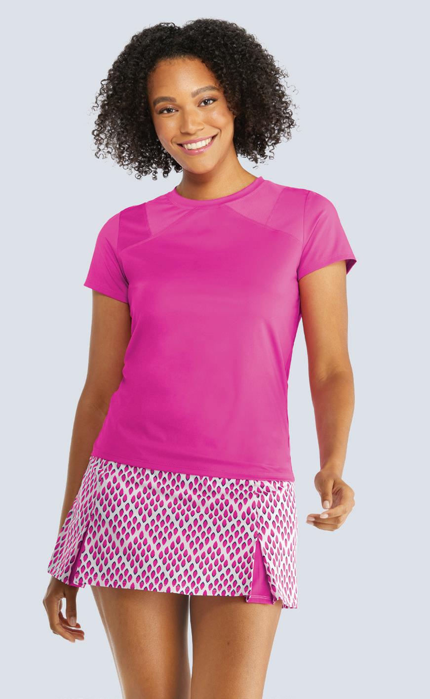 Oval Mesh, Short Sleeve, Crewneck Boxy Top, 21” Length, 88.3% Polyester, 11.7% Spandex