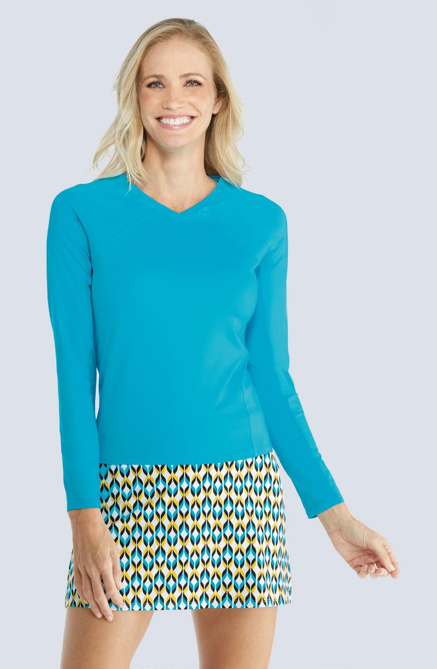 These sun protection crop tops feature UPF 50+, blocking 98% of harmful UVA and UVB rays. The sun protection is inherent to the fabric, so it won’t wear off or wash off.