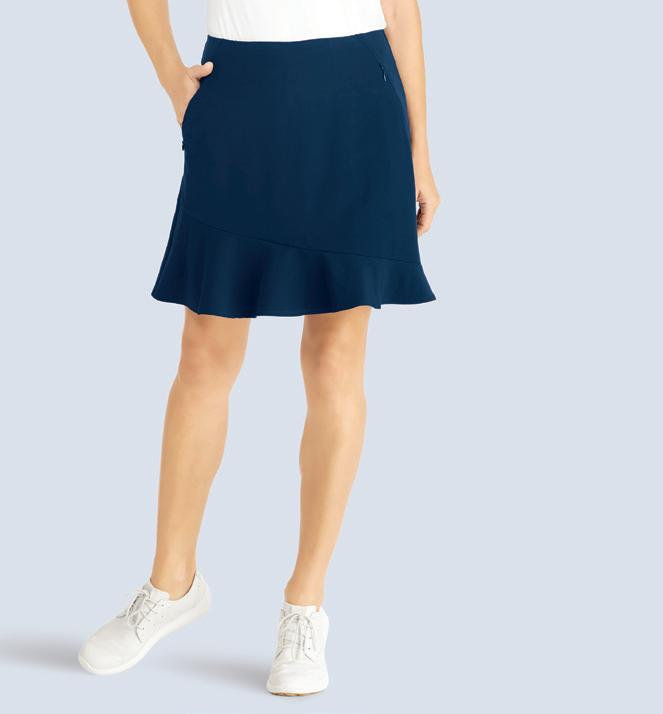 Luxe Impact Jersey (solids), Impact Jersey (print), Pull-On Skort, Pockets, Rib Trims, Shorties, 17” Outseam, UPF 50+