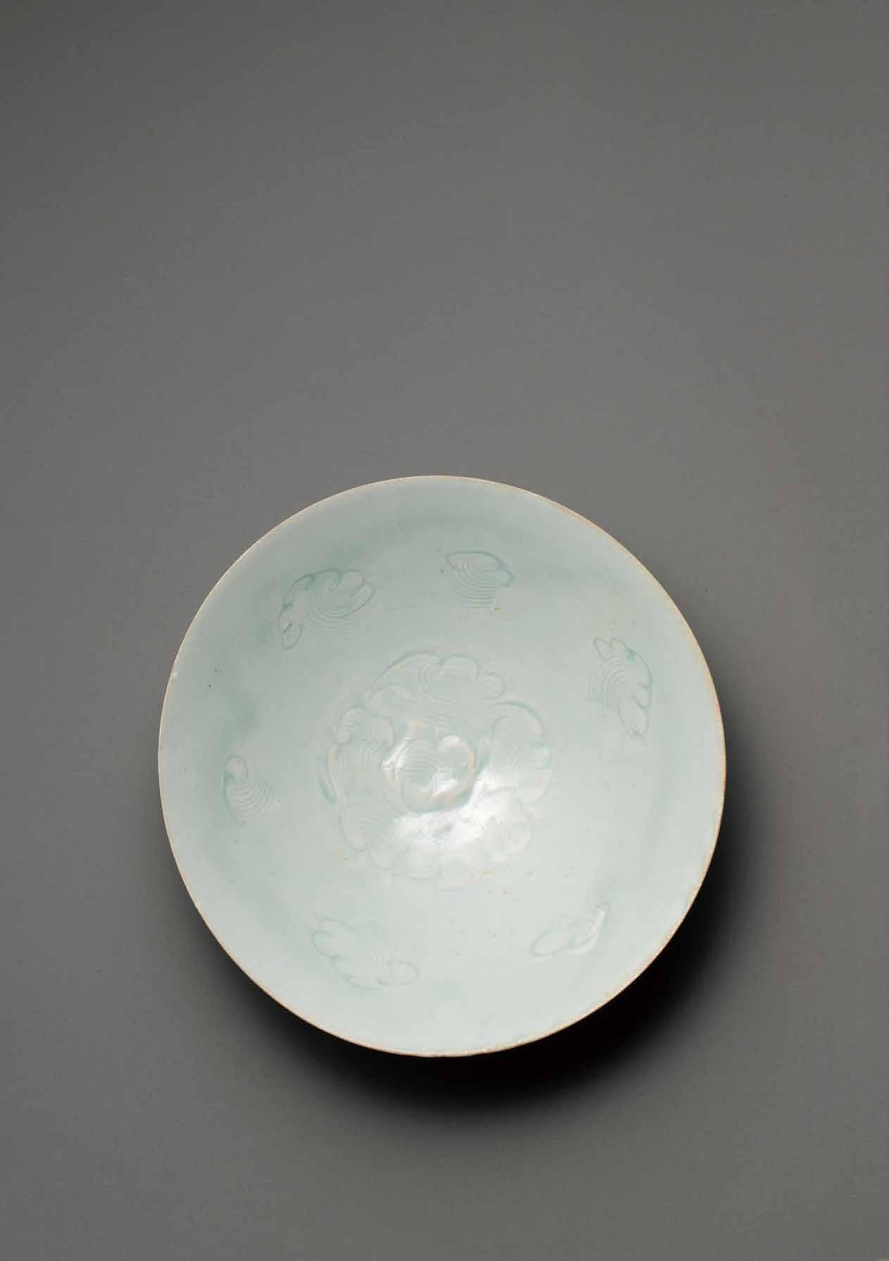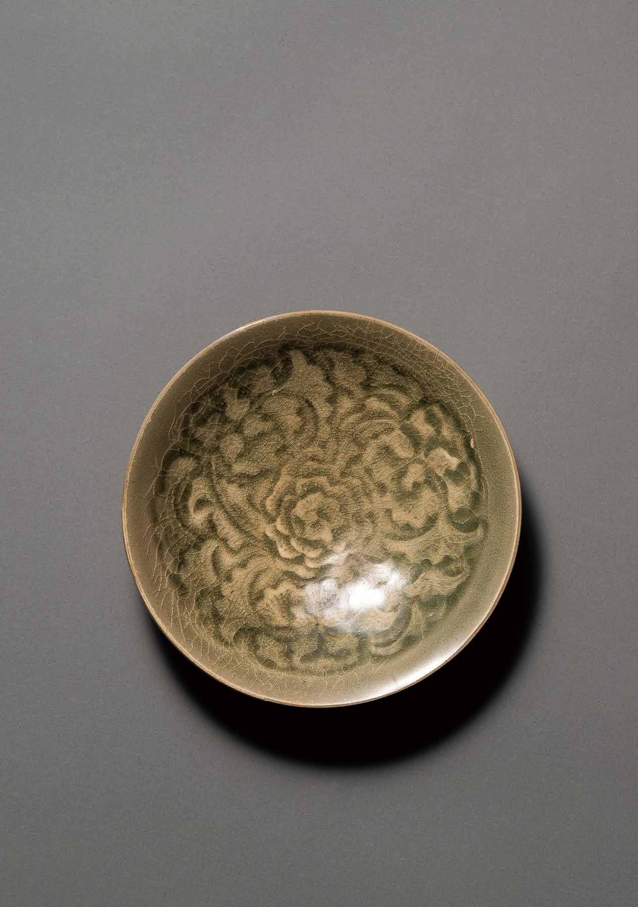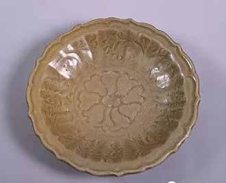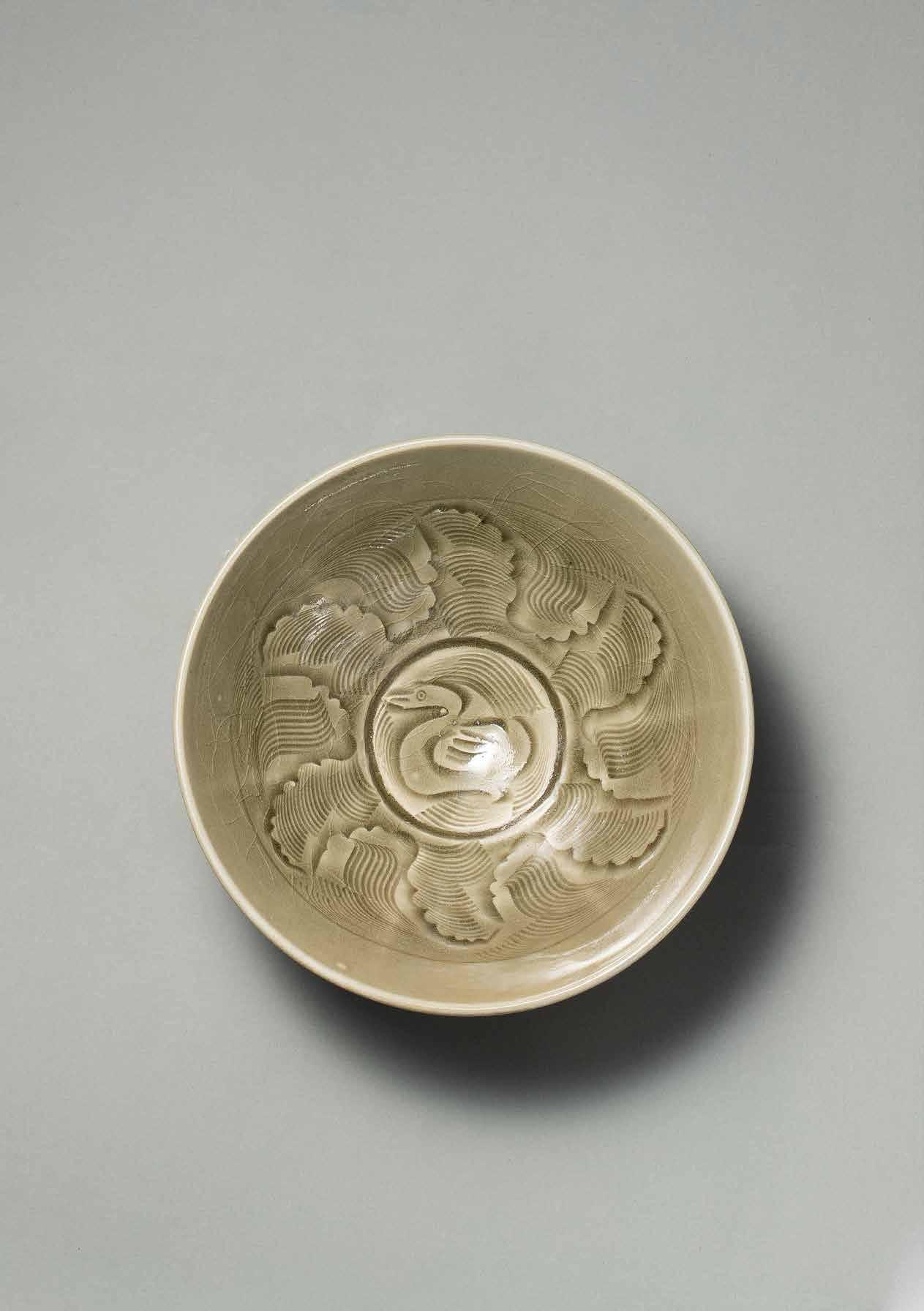 主題之三,五代宋初越窯及定窯瓷器,延續唐代「南青北白」的南北兩大青瓷、白 瓷主軸色釉系統,能工巧匠,運用漆器與金銀器刻花、劃花、印花、篦紋、珍珠地等工 藝表現技法和裝飾紋樣,創造官窯前身的貢瓷、五大名窯和南北八大窯系在內的「共享」