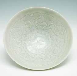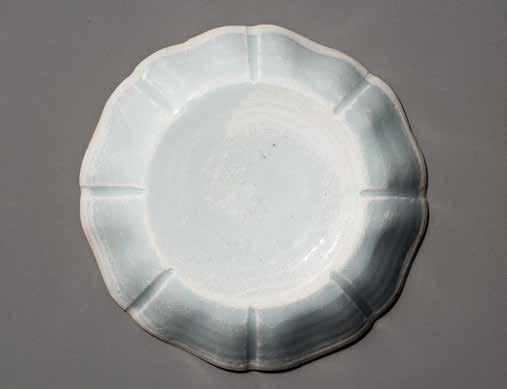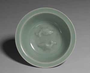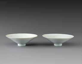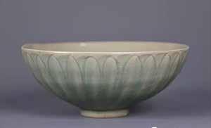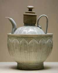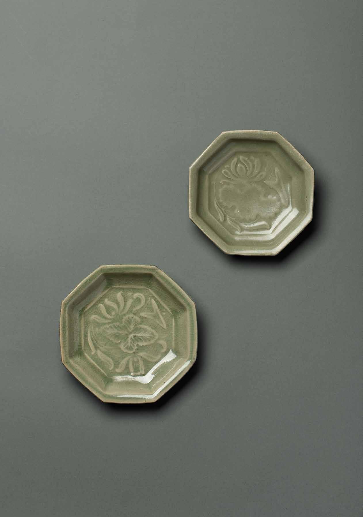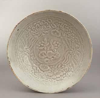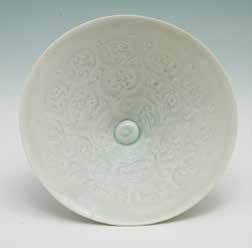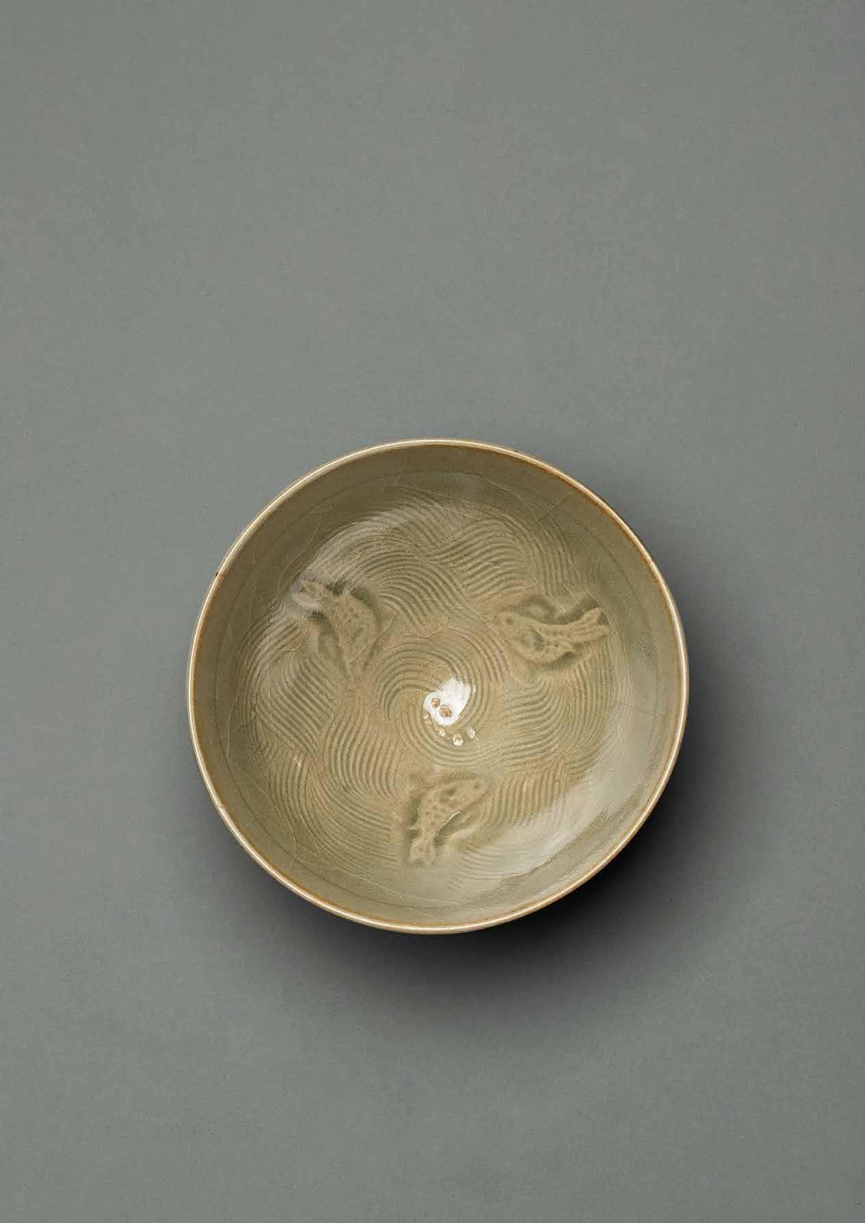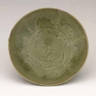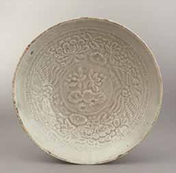 主題之三,五代宋初越窯及定窯瓷器,延續唐代「南青北白」的南北兩大青瓷、白 瓷主軸色釉系統,能工巧匠,運用漆器與金銀器刻花、劃花、印花、篦紋、珍珠地等工 藝表現技法和裝飾紋樣,創造官窯前身的貢瓷、五大名窯和南北八大窯系在內的「共享」
