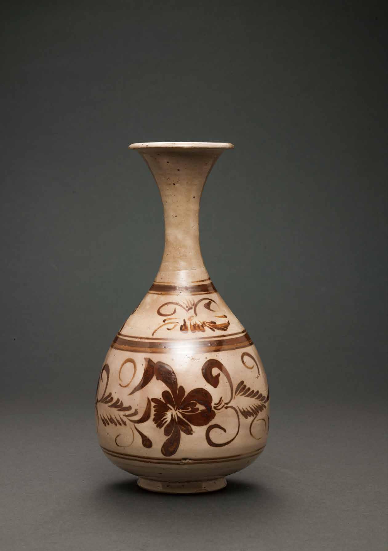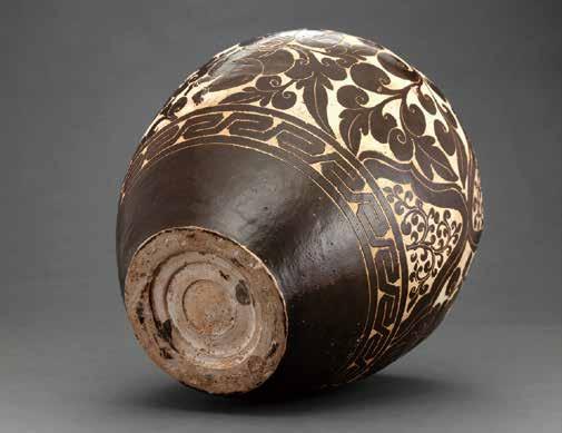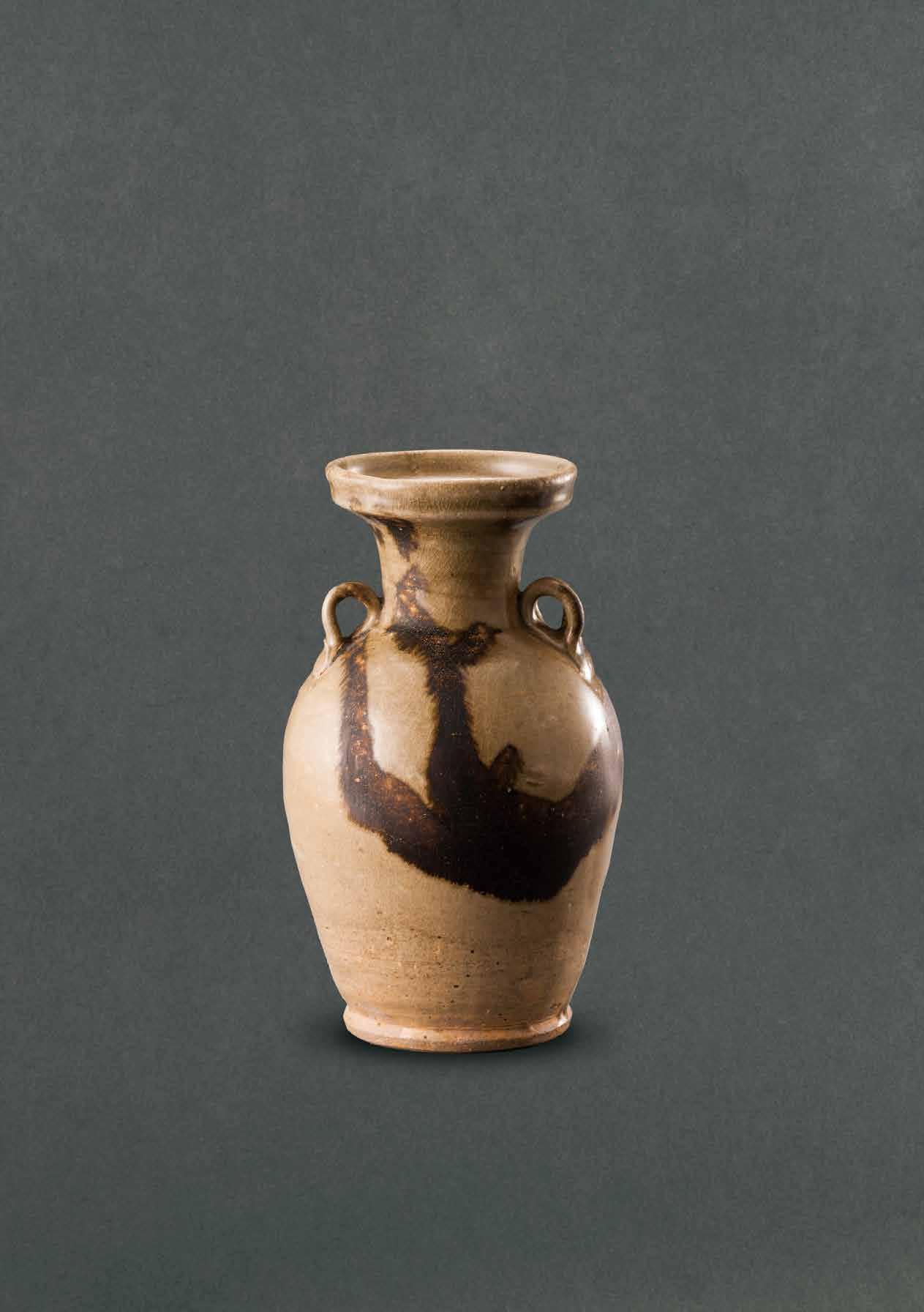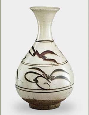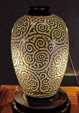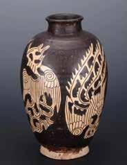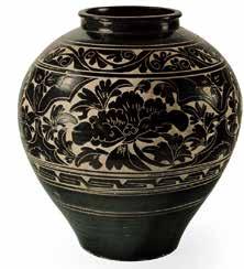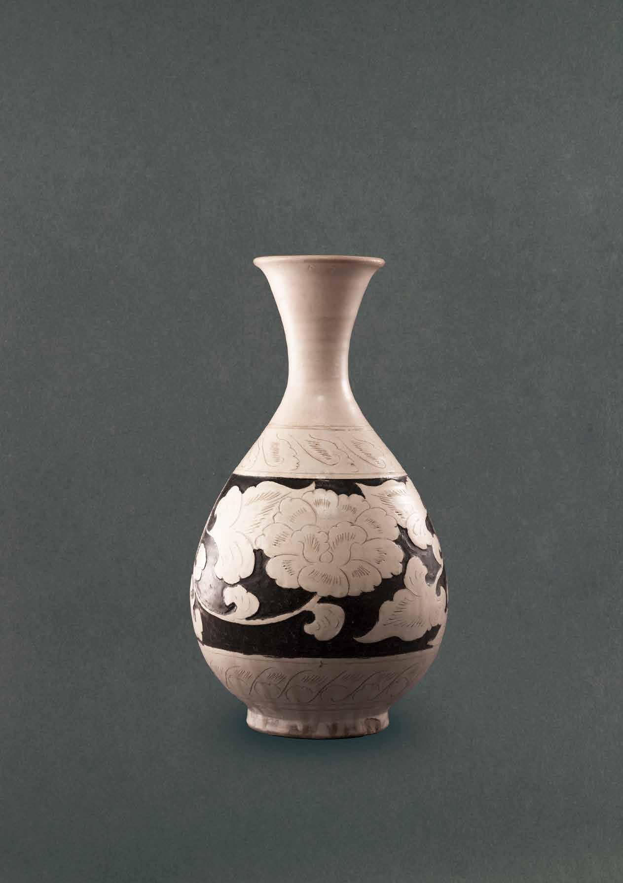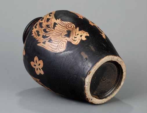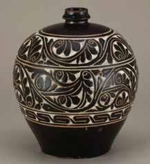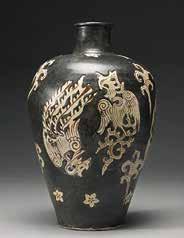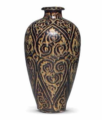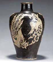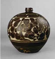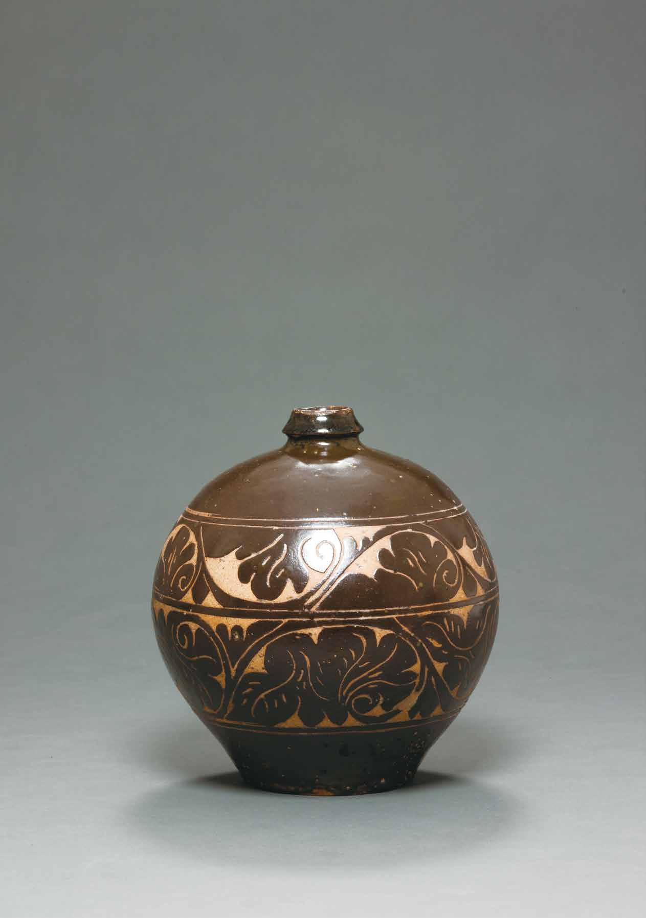 紋,以漆藝的剔花和線刻技法,將兩組延綿不絕、或呈側臥,或作蹲姿,寓意蓮生貴子主 題的嬰戲童子蓮紋,體態生動,活靈活現,臻於化境,類似的紀年「元大德九年」銘款、 嬰戲蓮紋童子小口罐,現藏於倫敦大英博物館。另外一件本書封面賞心悅目展品的南宋 吉 州窯剪紙貼花鳳紋瓶 (No.84 同樣造形的黑釉鳳凰紋梅瓶,參見Giuseppe Eskenazi, 展覽專書,圖版29《Eskenazi: Principal Wares of the Song Period from a Private Collection》, London, 2015年出版),以漆器、金銀器、織錦及緙絲圖案,結合蠟紙貼 印、褐彩 勾劃的剪紙貼花裝飾技法,靈活運用黑白對比,正反相間,上下重合,翻轉滾 動的「喜相 逢式」雙鳳迎喜的吉祥符號,同時「雙鳳呈祥」紋樣,也是成雙成對,相依