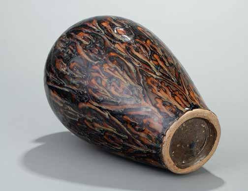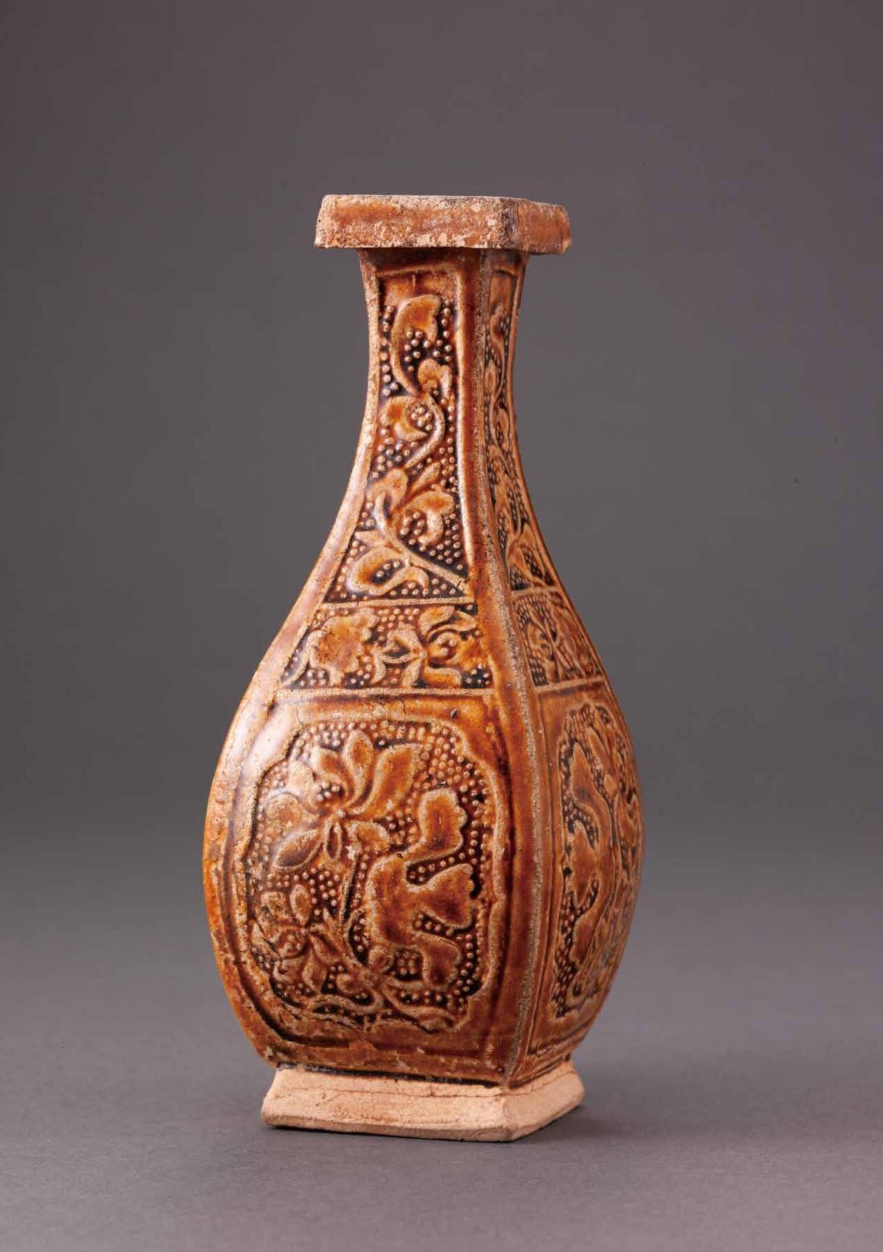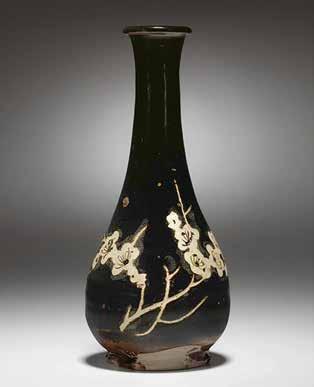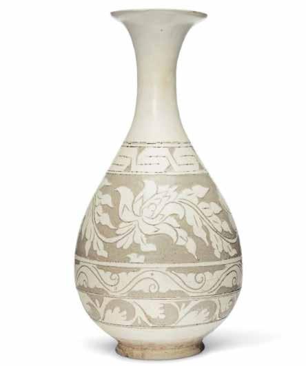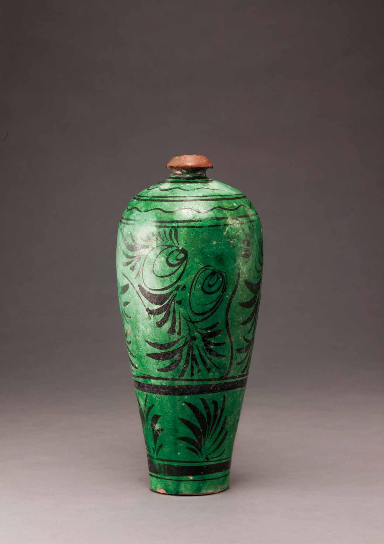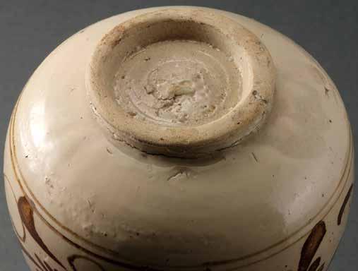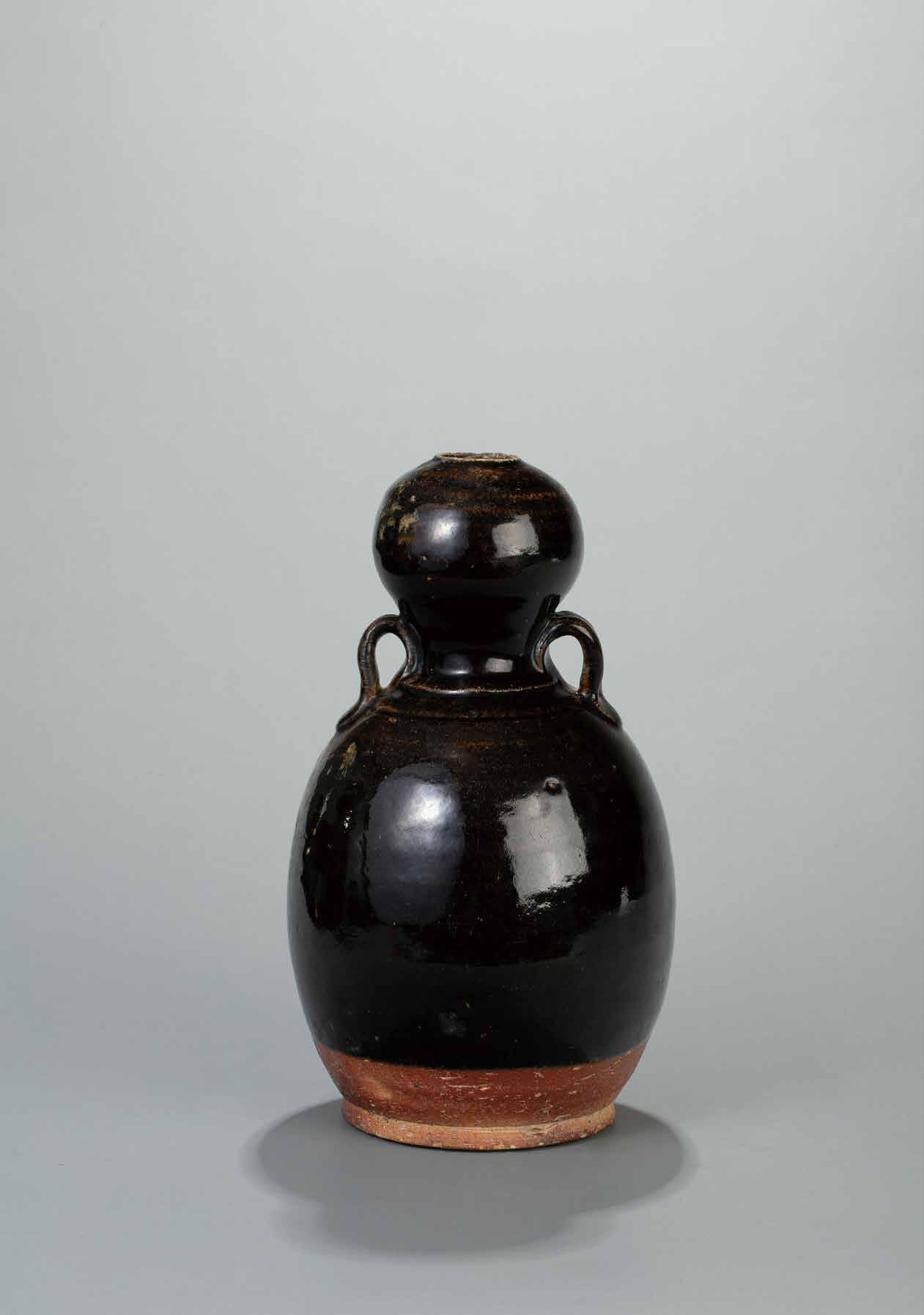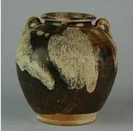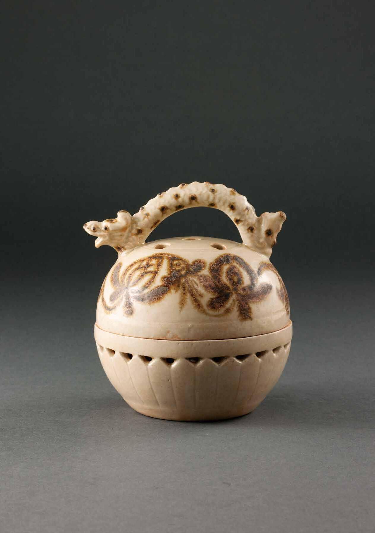 紋,以漆藝的剔花和線刻技法,將兩組延綿不絕、或呈側臥,或作蹲姿,寓意蓮生貴子主 題的嬰戲童子蓮紋,體態生動,活靈活現,臻於化境,類似的紀年「元大德九年」銘款、 嬰戲蓮紋童子小口罐,現藏於倫敦大英博物館。另外一件本書封面賞心悅目展品的南宋 吉 州窯剪紙貼花鳳紋瓶 (No.84 同樣造形的黑釉鳳凰紋梅瓶,參見Giuseppe Eskenazi, 展覽專書,圖版29《Eskenazi: Principal Wares of the Song Period from a Private Collection》, London, 2015年出版),以漆器、金銀器、織錦及緙絲圖案,結合蠟紙貼 印、褐彩 勾劃的剪紙貼花裝飾技法,靈活運用黑白對比,正反相間,上下重合,翻轉滾 動的「喜相 逢式」雙鳳迎喜的吉祥符號,同時「雙鳳呈祥」紋樣,也是成雙成對,相依