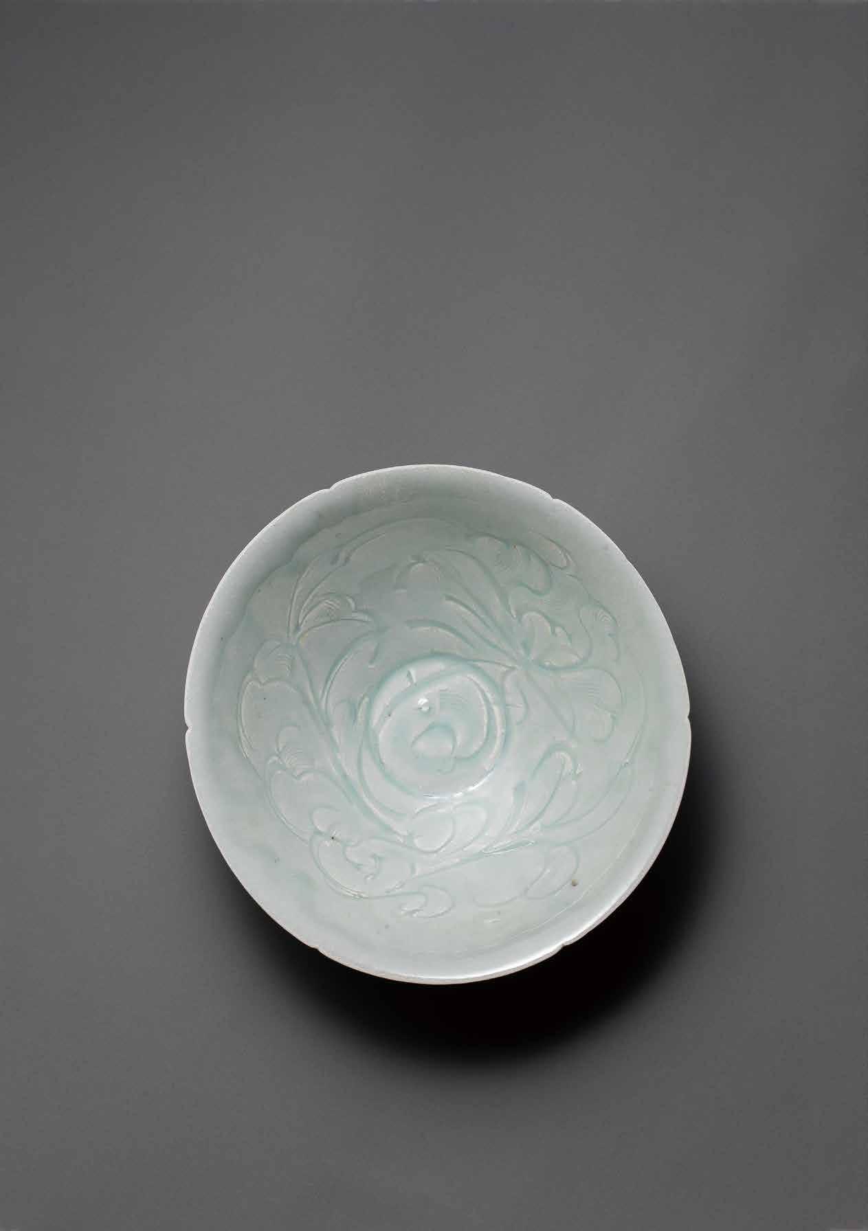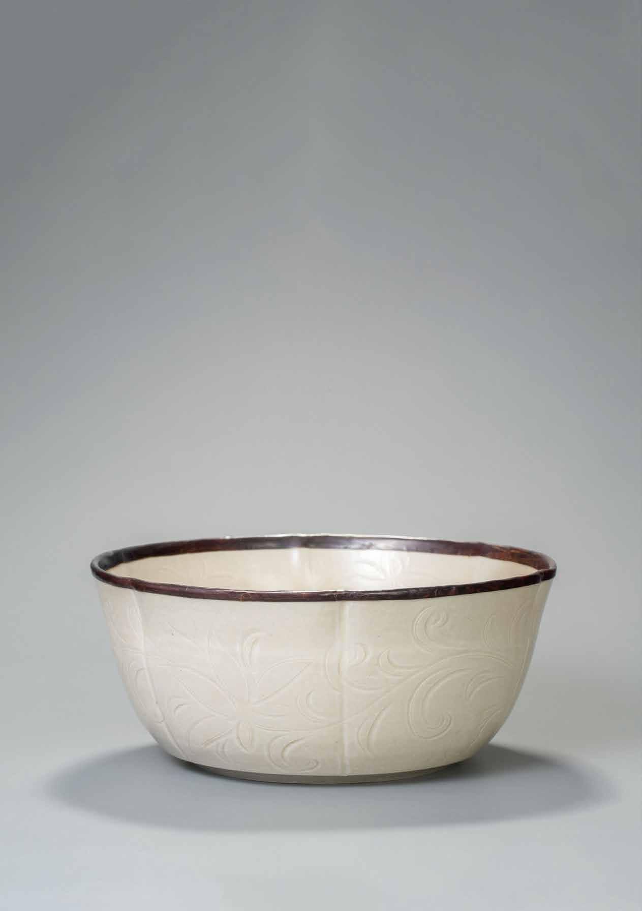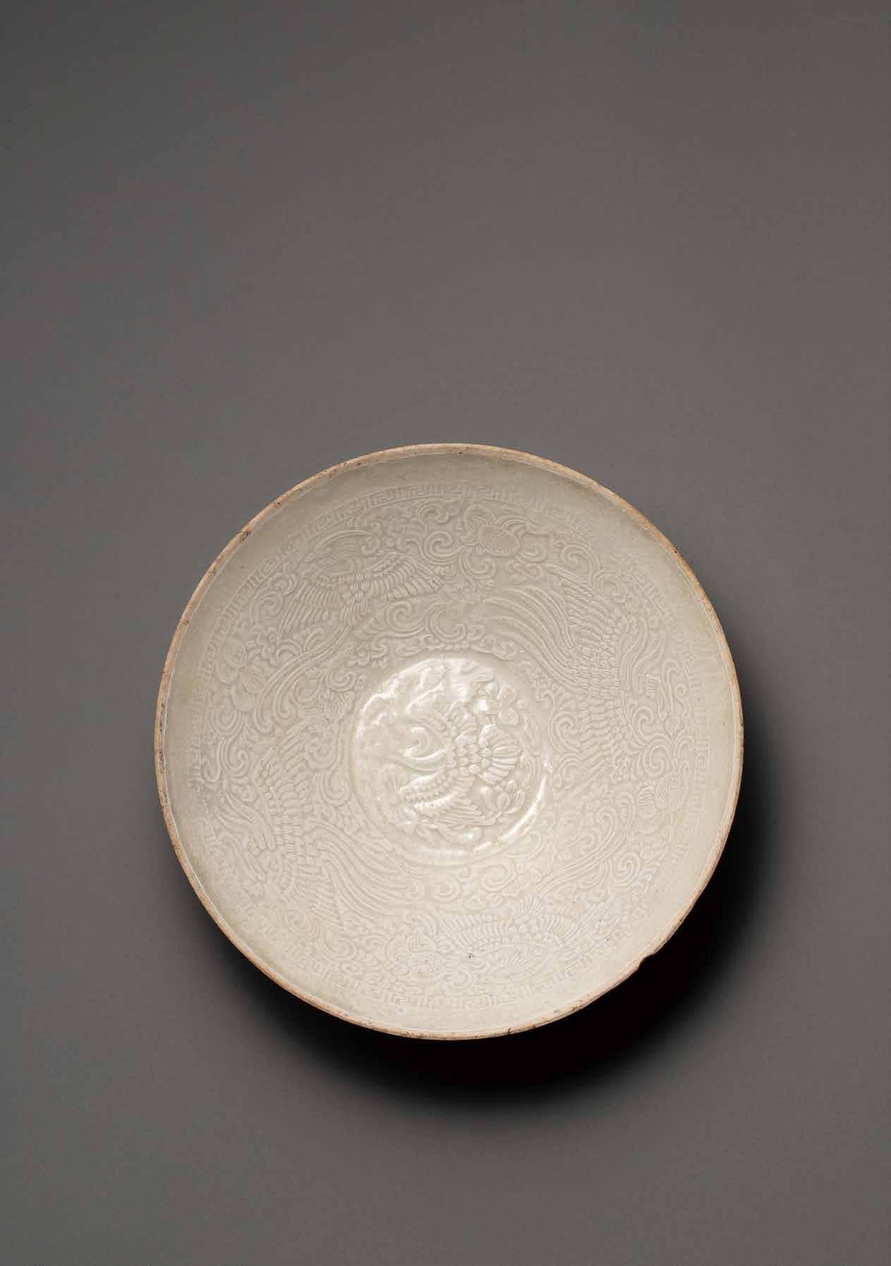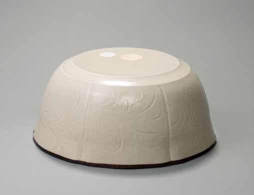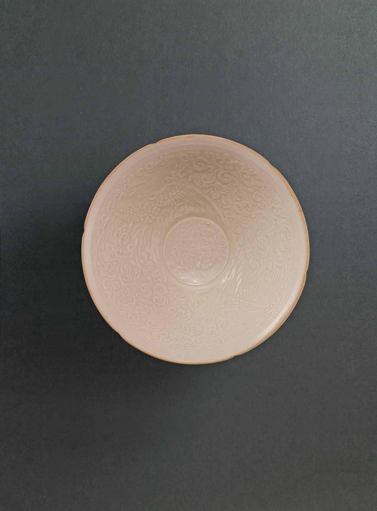 刻劃出兩組相對、不斷纏繞、孕育象徵圓滿生命的變形寶相花朵,外緣等距六棱,各有六 組蓮荷相間,直斜刀法并用,整體構圖設計,寓意長壽吉祥。定窯的美學歷史地位極高,