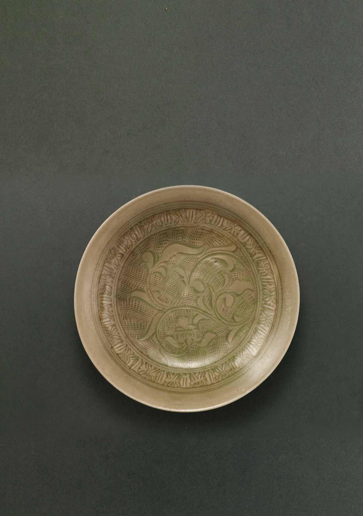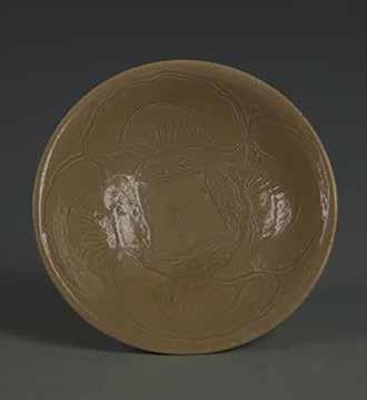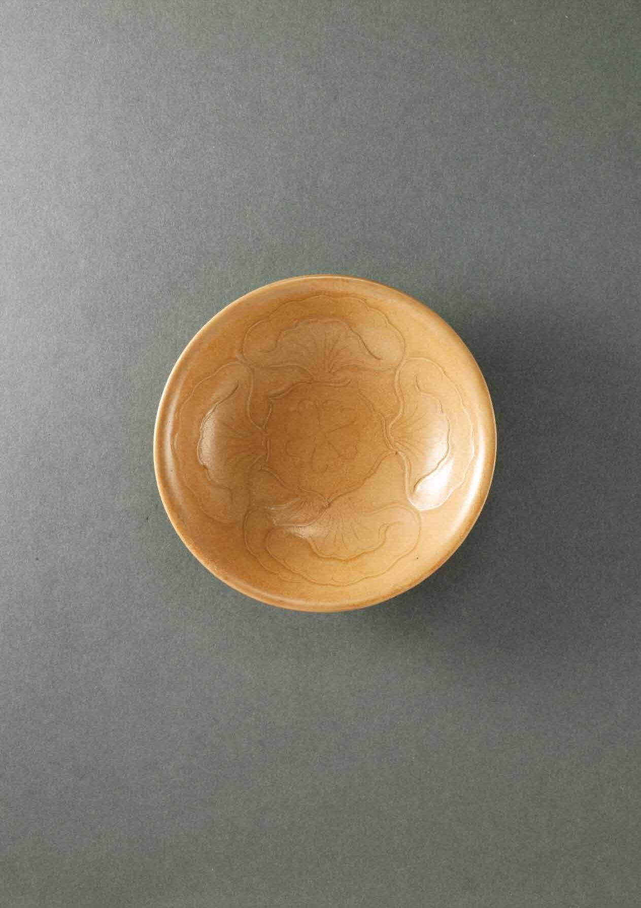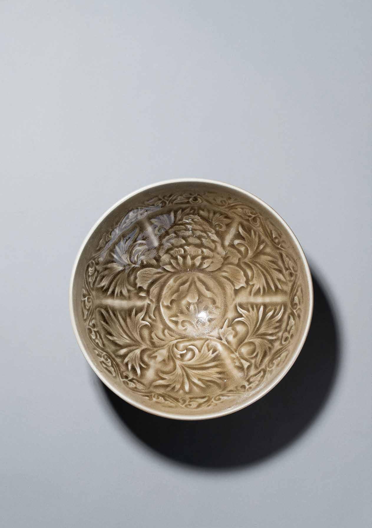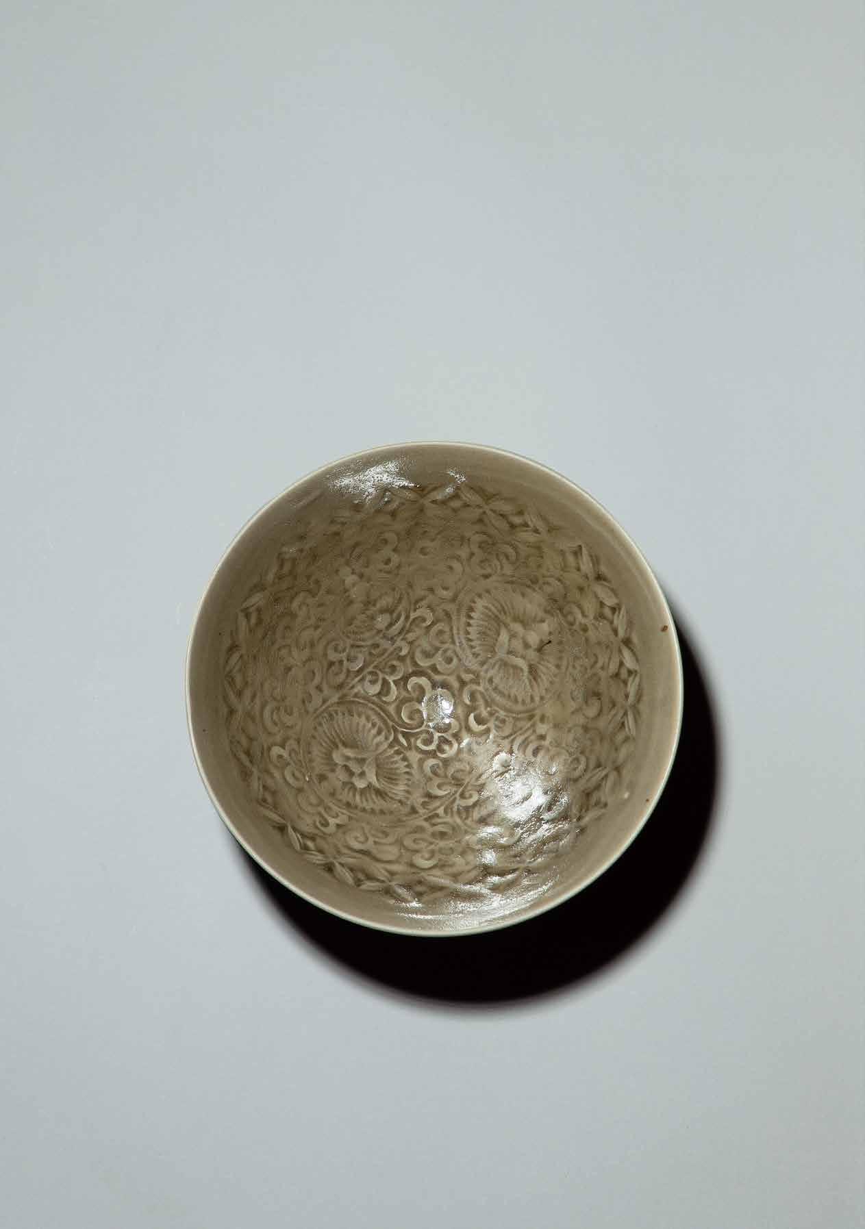 刻劃出兩組相對、不斷纏繞、孕育象徵圓滿生命的變形寶相花朵,外緣等距六棱,各有六 組蓮荷相間,直斜刀法并用,整體構圖設計,寓意長壽吉祥。定窯的美學歷史地位極高,