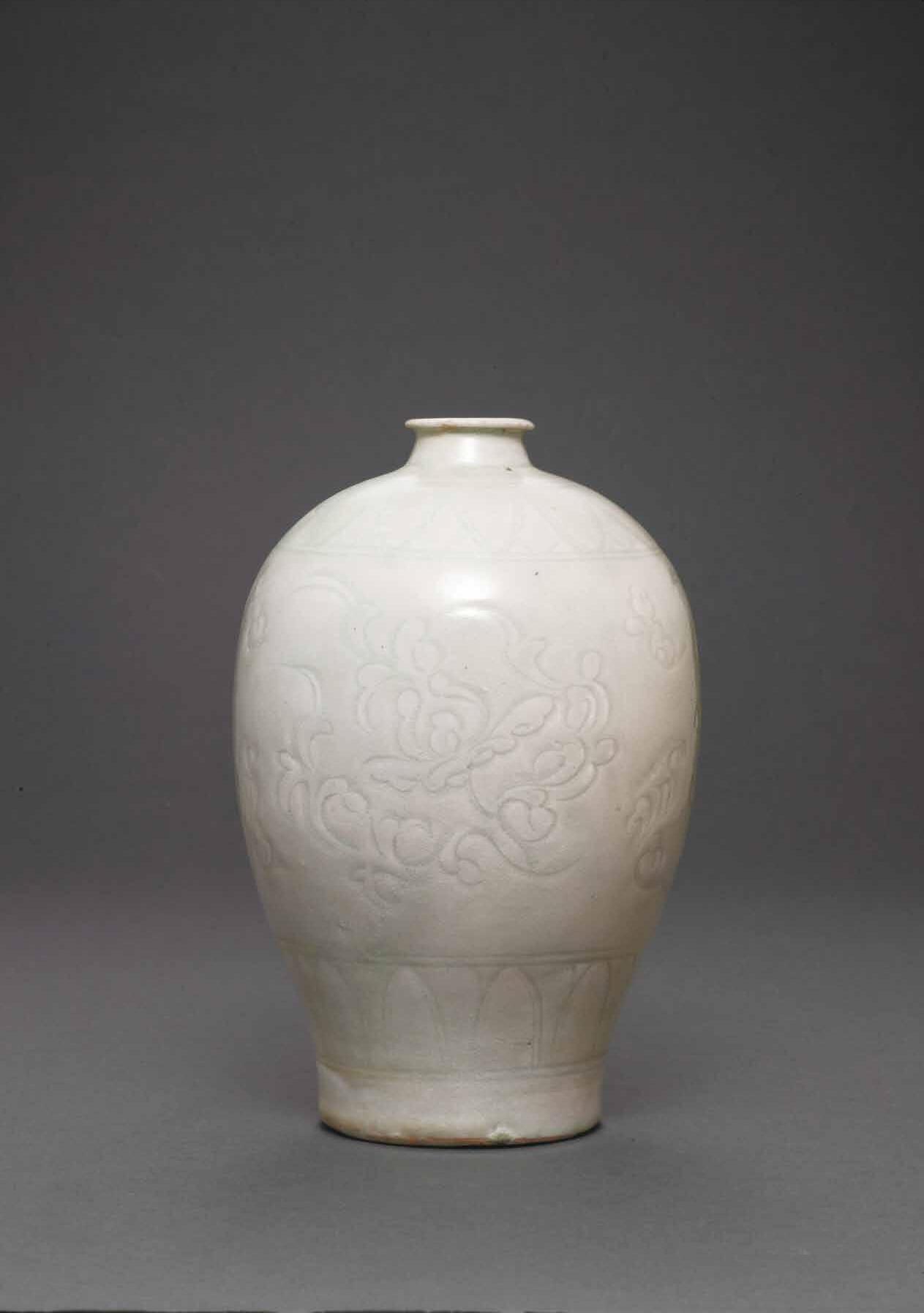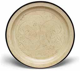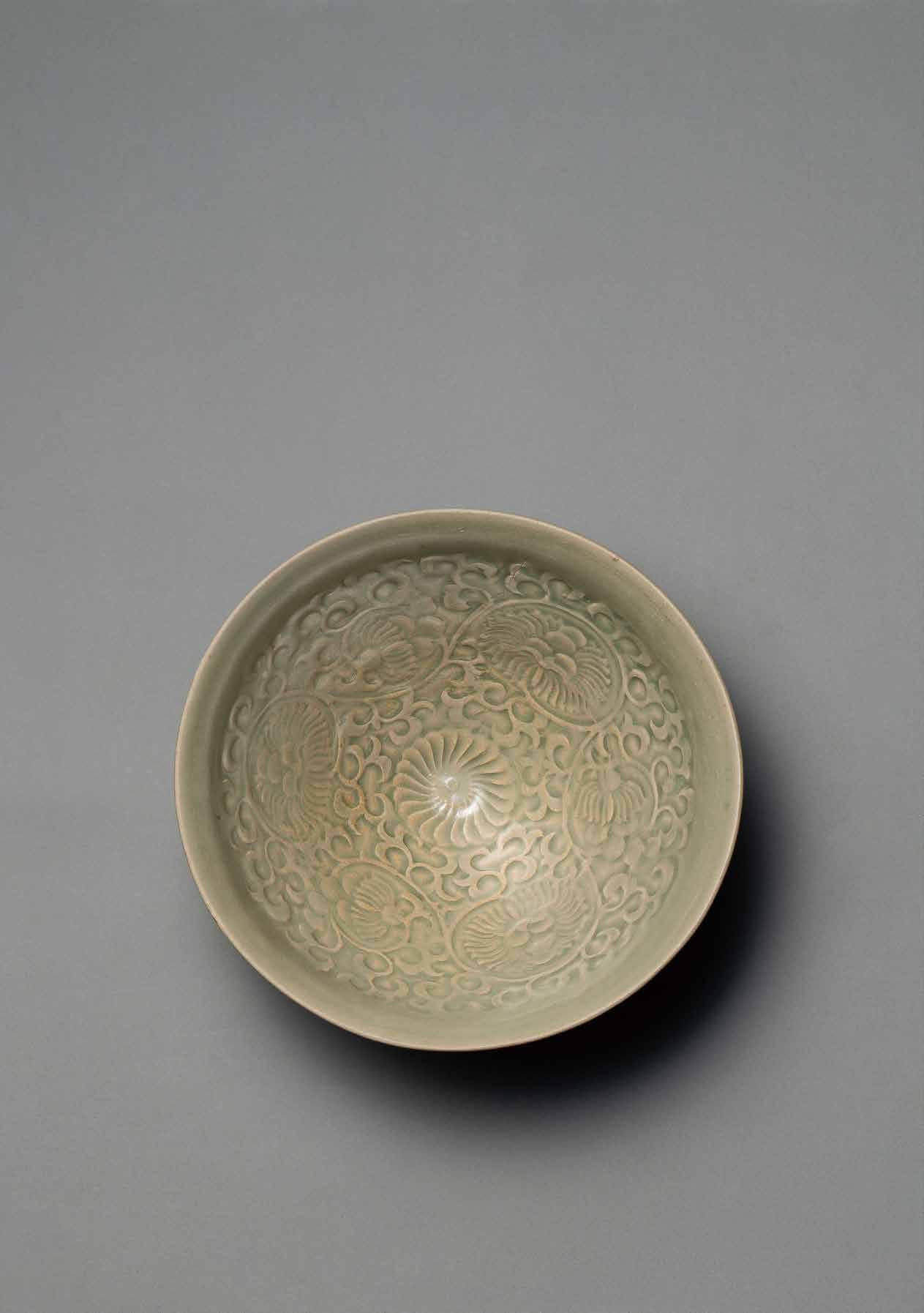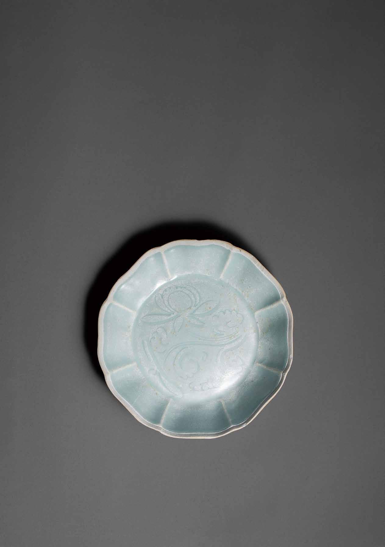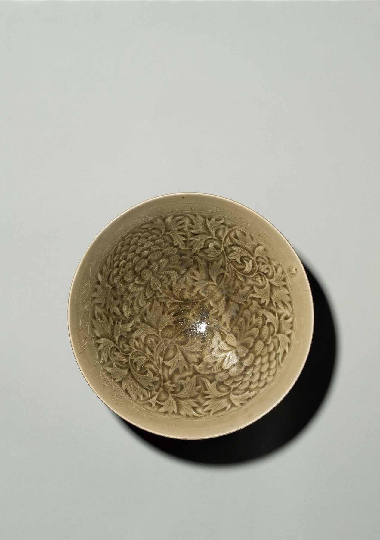 刻劃出兩組相對、不斷纏繞、孕育象徵圓滿生命的變形寶相花朵,外緣等距六棱,各有六 組蓮荷相間,直斜刀法并用,整體構圖設計,寓意長壽吉祥。定窯的美學歷史地位極高,