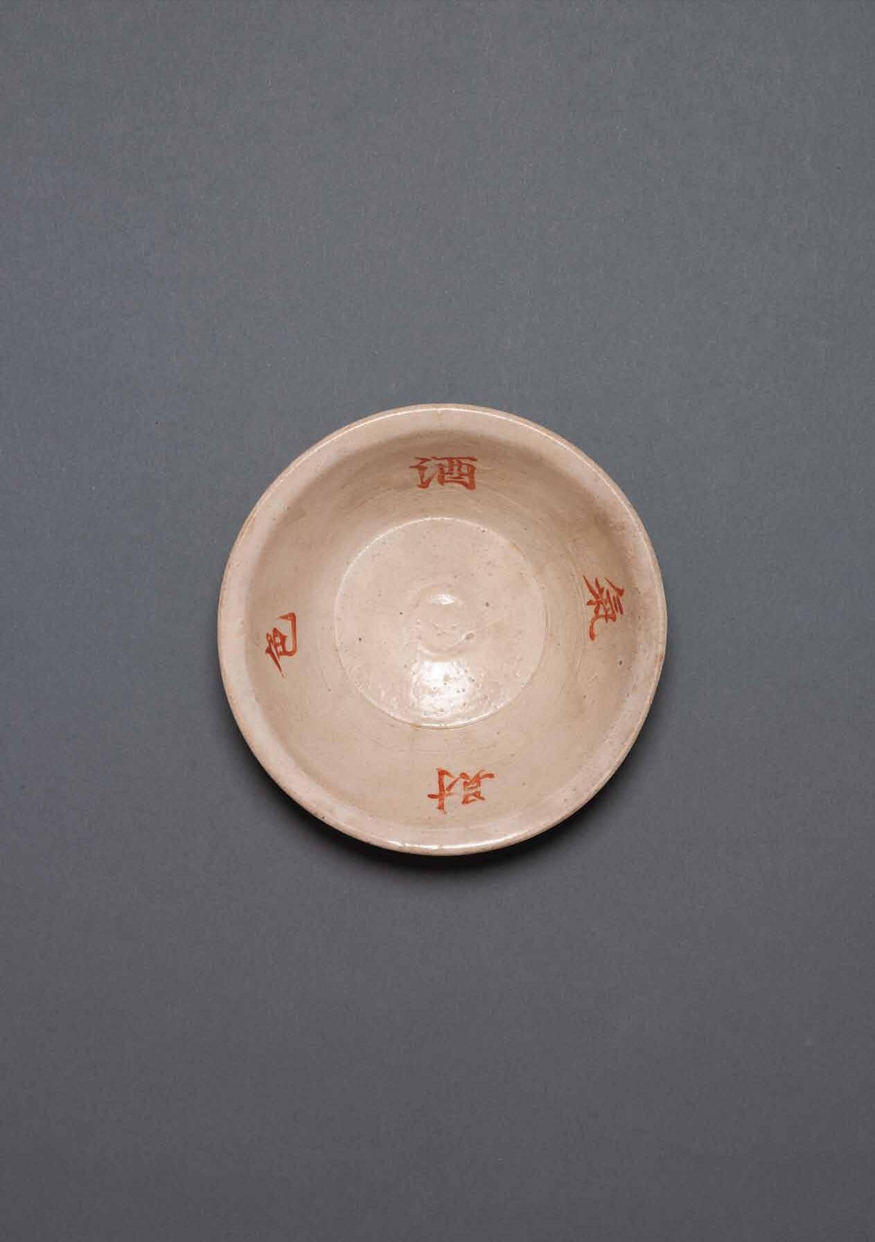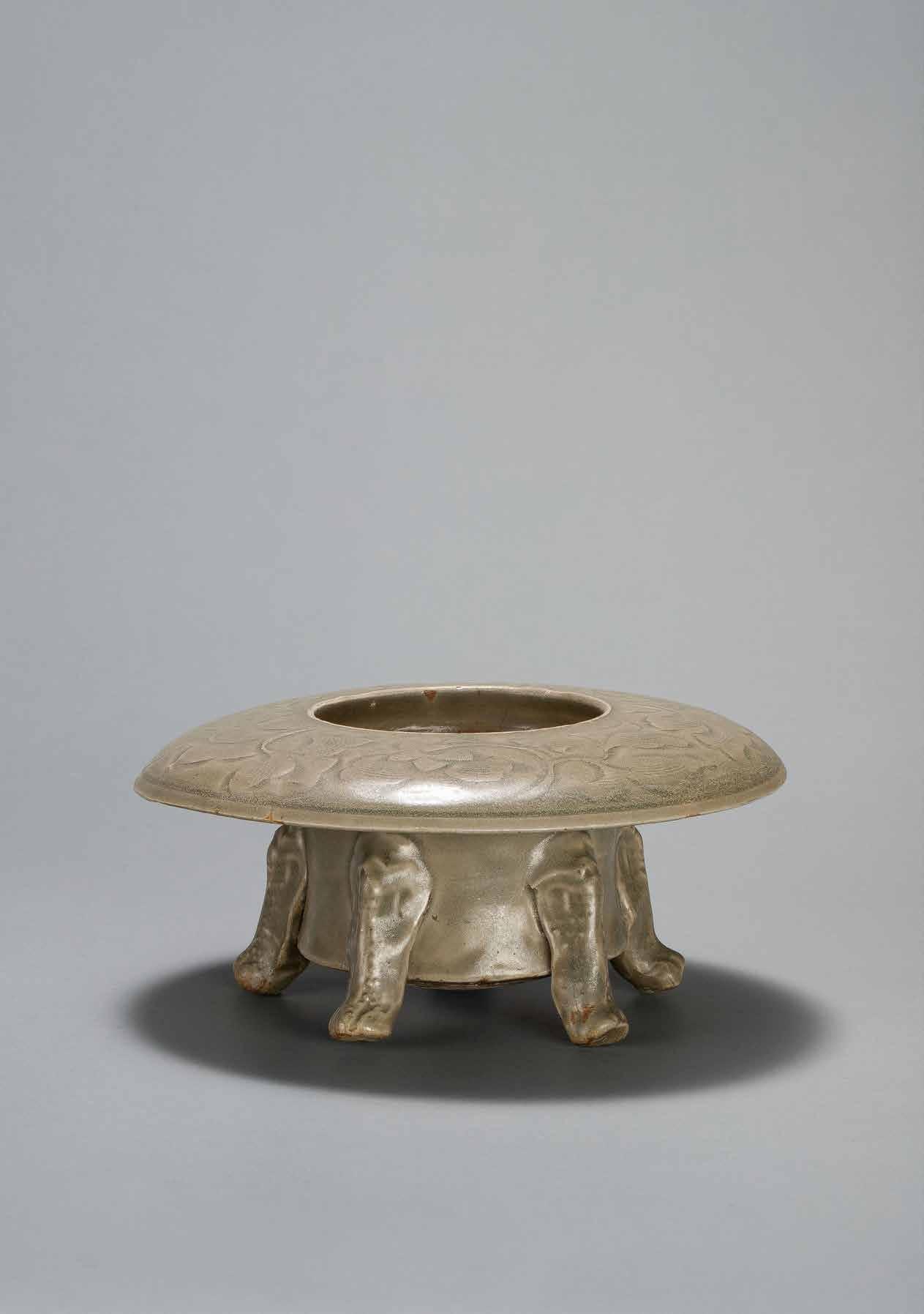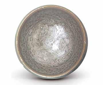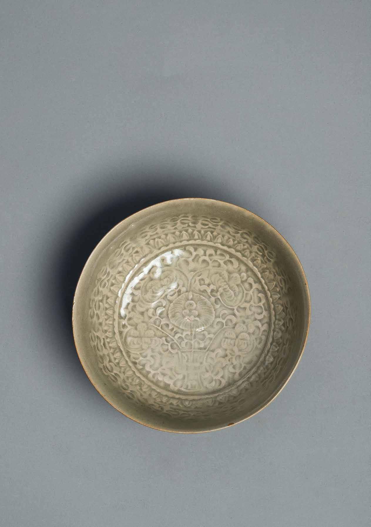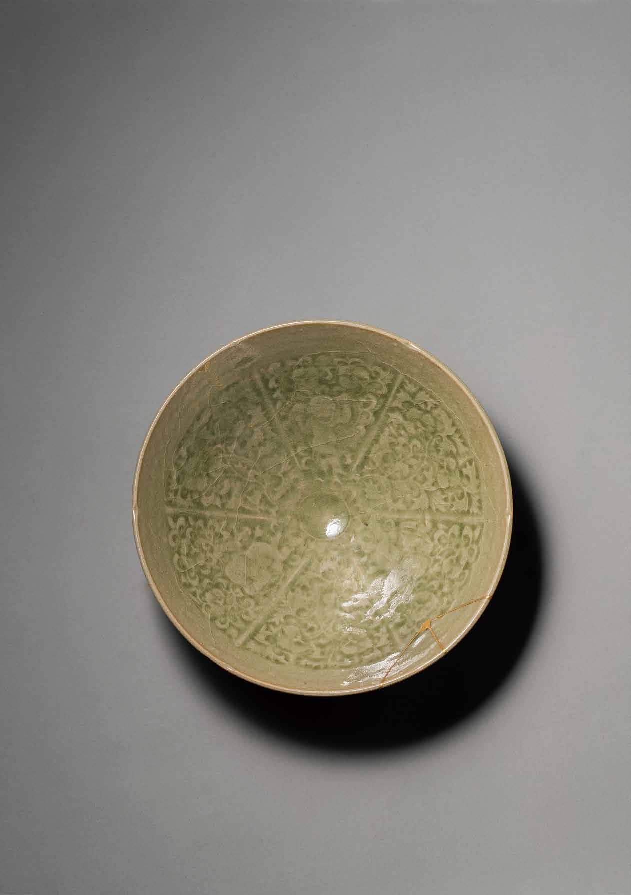 刻劃出兩組相對、不斷纏繞、孕育象徵圓滿生命的變形寶相花朵,外緣等距六棱,各有六 組蓮荷相間,直斜刀法并用,整體構圖設計,寓意長壽吉祥。定窯的美學歷史地位極高,