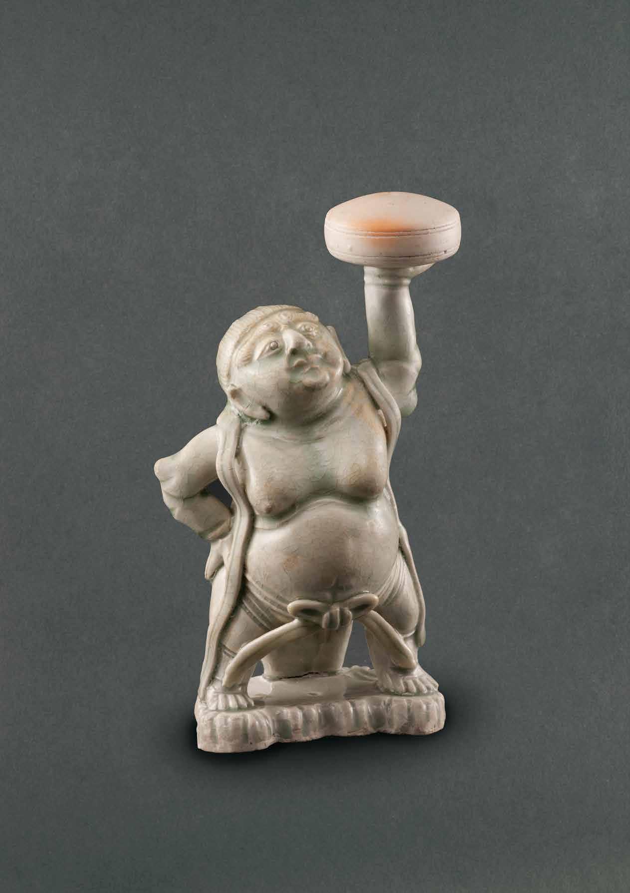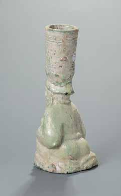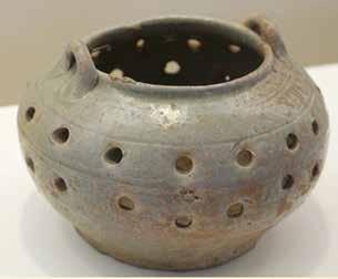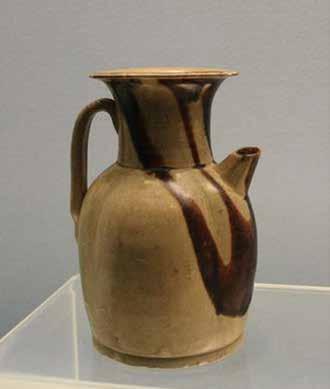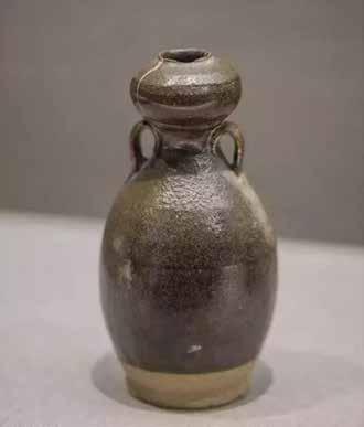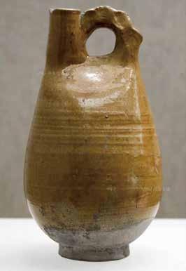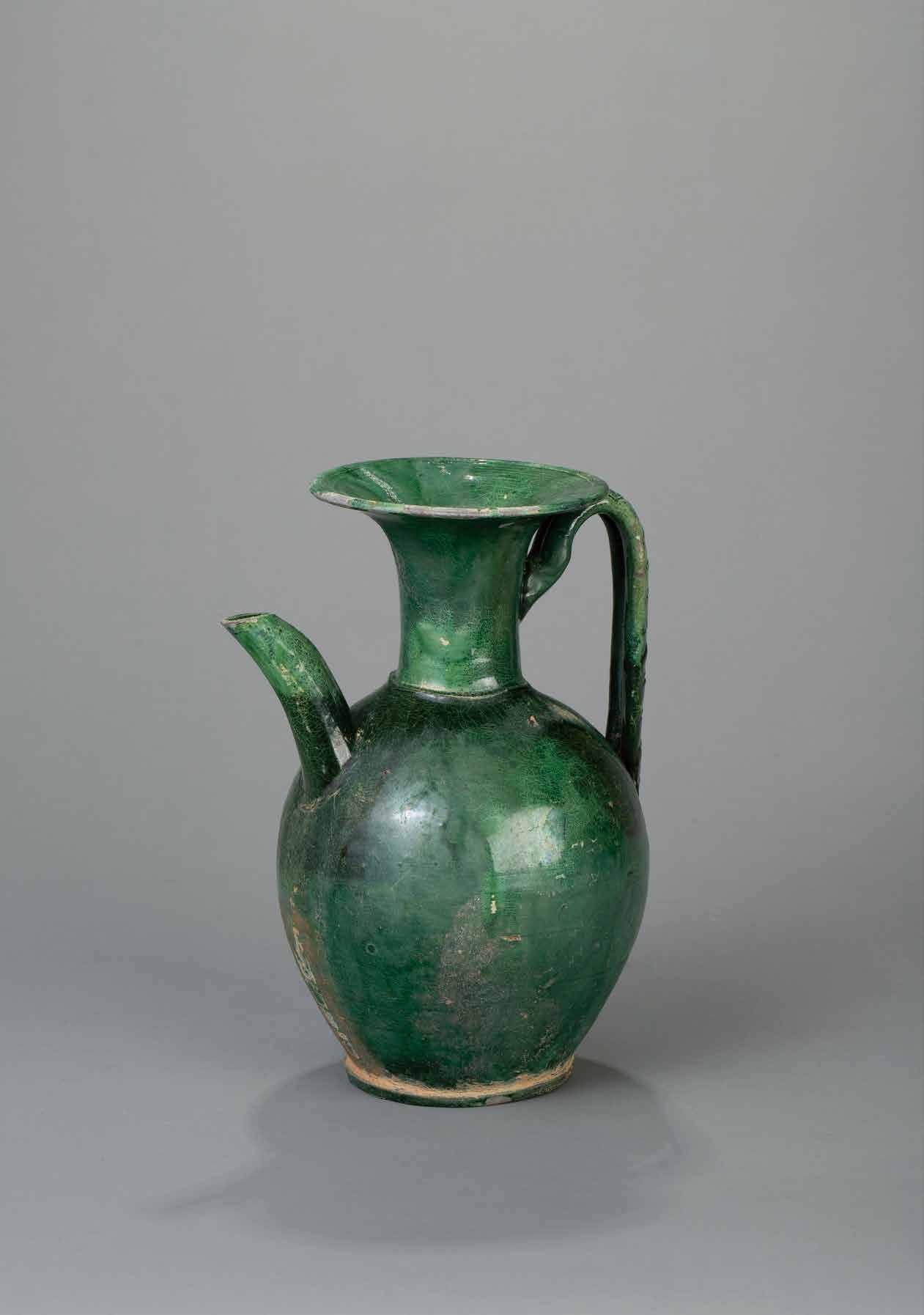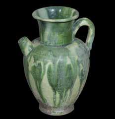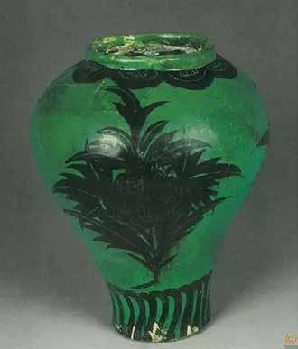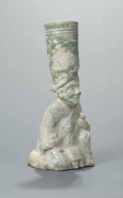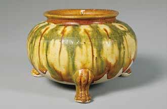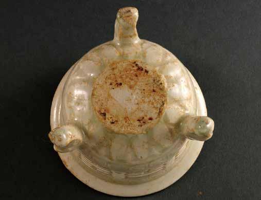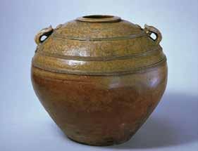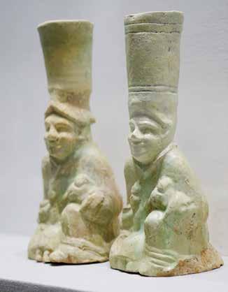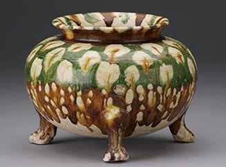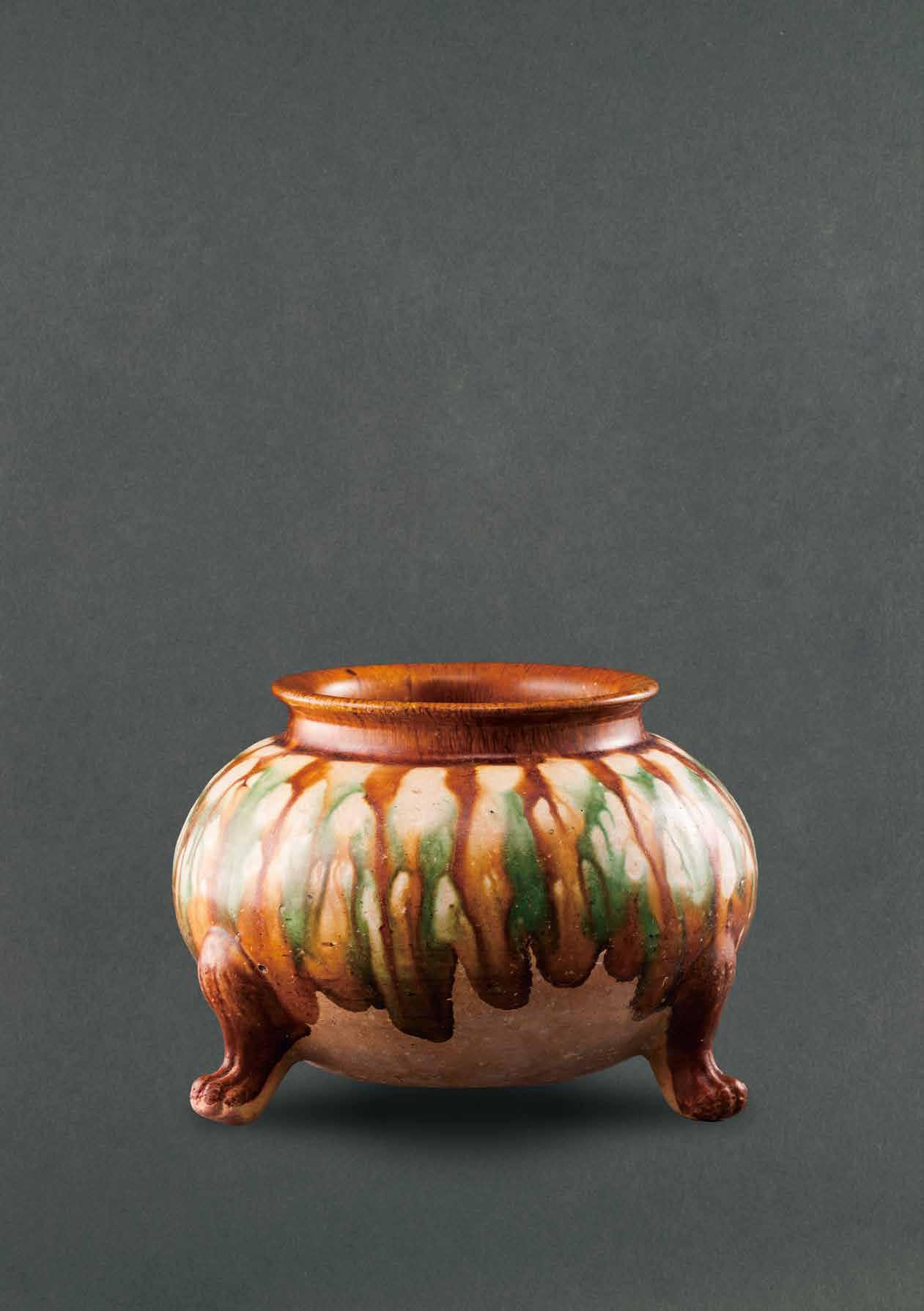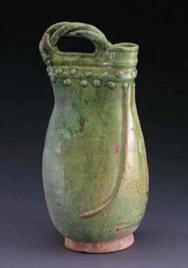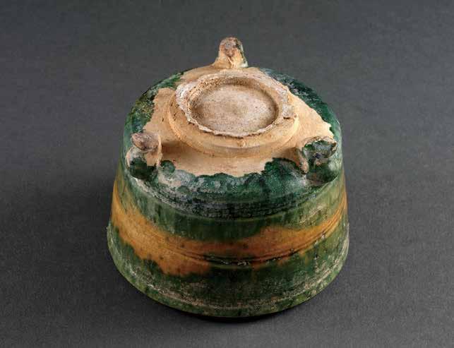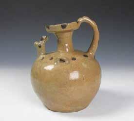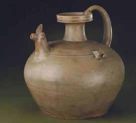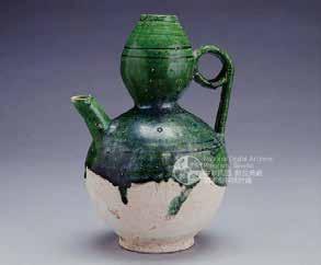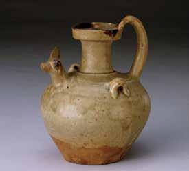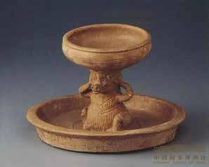 到黑色,反之,若含鐵量越加減低,色層越加變白。本書三件展品,可以充作青釉實例, 展品之一的漢代灰釉繩紋柄虎子(No.14),典型酒器,形似伏虎,故名虎子,肩腹施加紋飾, 因釉中含鐵量不均勻,色層呈現灰青色。展品之二的東晉青釉雞首壺(No.20),壺嘴雞首 狀,器形結合肖生動物造型,同類雞首器形,見諸北京故宮博物院藏品。展品之三東晉青 釉熊形燈(No.18),底部油盞和上方承盤之間,以蹲坐幼熊(黃帝夙以熊族部落的神話圖騰, 稱號有熊氏),塑成為油燈燈柱,幼熊寶貝,聳肩縮頭,兩手撐燈,彷彿去掉自我外在背景, 做出由靜到動,天真稚拙的瞬間自拍「停格」鏡頭,逗人喜愛。展品的漢代綠釉人物油燈 (No.12),跽坐俑像,深鼻高目,睇笑迎人,出現有趣的化學現象銀斑。本件漢代綠釉人物 俑燈,和展品的唐代三彩三足爐(No.35),都是屬於低溫鉛釉燒造,根據X射線衍生儀及 岩相分析結果,綠釉人物俑燈,係以氧化銅為呈色劑的低溫鉛釉,易於在南方多雨墓葬地 層,將鉛釉中的微量金屬元素,漸次溶蝕吸附器表釉層,形成深淺層次變化的古樸銀斑。