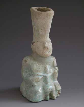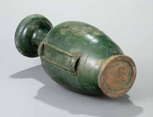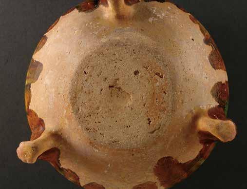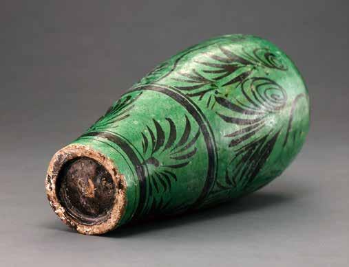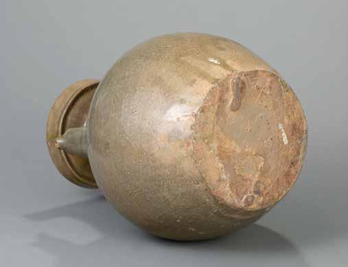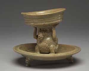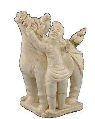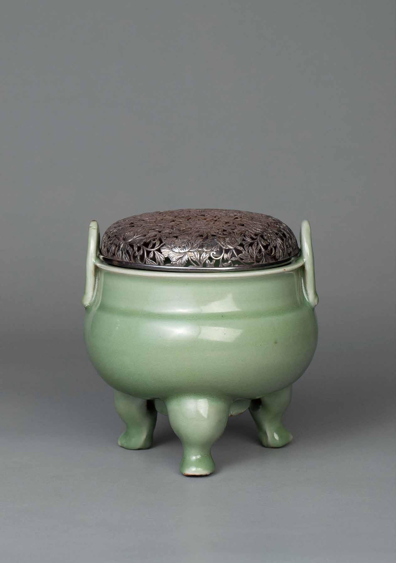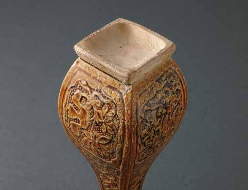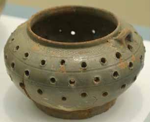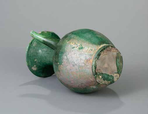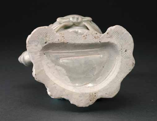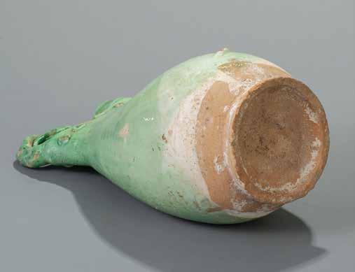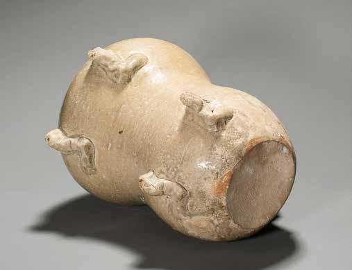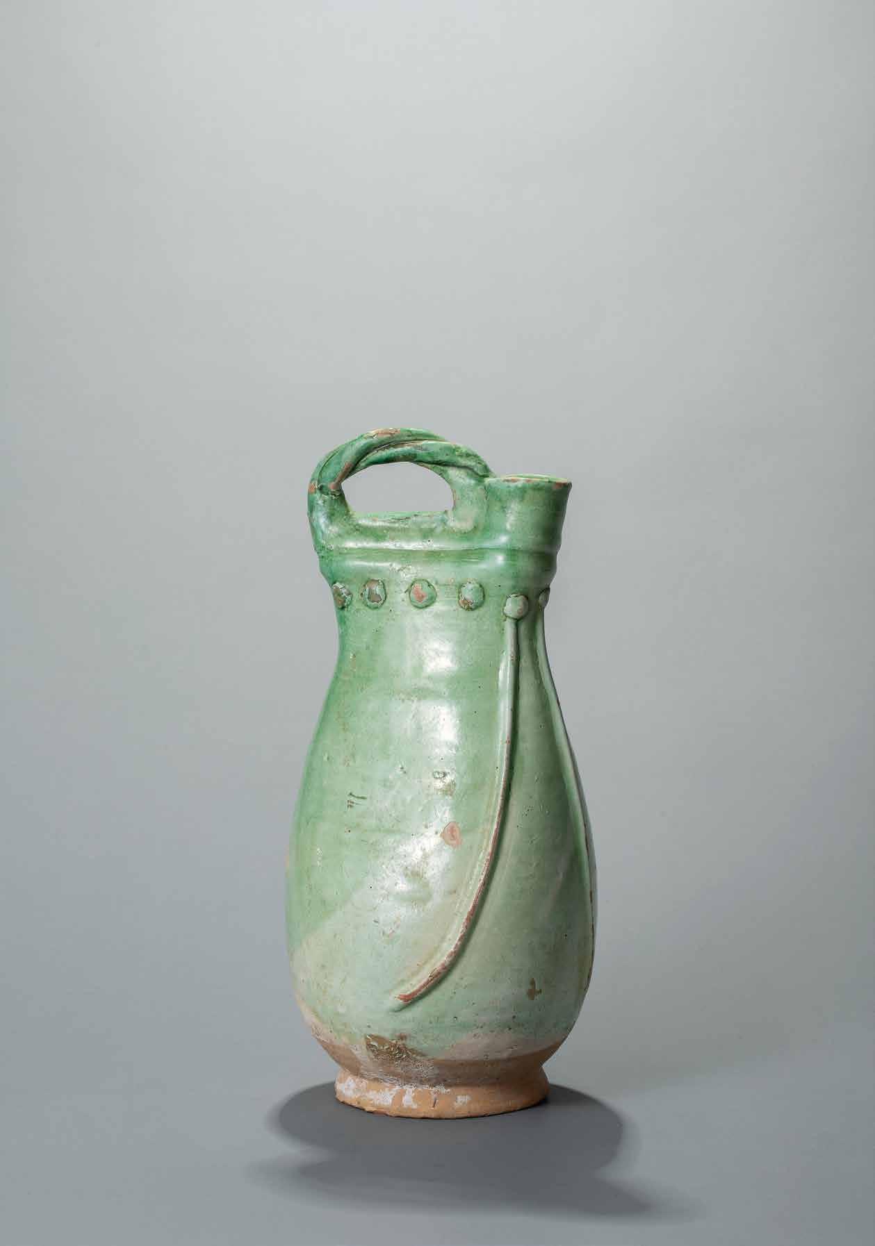 到黑色,反之,若含鐵量越加減低,色層越加變白。本書三件展品,可以充作青釉實例, 展品之一的漢代灰釉繩紋柄虎子(No.14),典型酒器,形似伏虎,故名虎子,肩腹施加紋飾, 因釉中含鐵量不均勻,色層呈現灰青色。展品之二的東晉青釉雞首壺(No.20),壺嘴雞首 狀,器形結合肖生動物造型,同類雞首器形,見諸北京故宮博物院藏品。展品之三東晉青 釉熊形燈(No.18),底部油盞和上方承盤之間,以蹲坐幼熊(黃帝夙以熊族部落的神話圖騰, 稱號有熊氏),塑成為油燈燈柱,幼熊寶貝,聳肩縮頭,兩手撐燈,彷彿去掉自我外在背景, 做出由靜到動,天真稚拙的瞬間自拍「停格」鏡頭,逗人喜愛。展品的漢代綠釉人物油燈 (No.12),跽坐俑像,深鼻高目,睇笑迎人,出現有趣的化學現象銀斑。本件漢代綠釉人物 俑燈,和展品的唐代三彩三足爐(No.35),都是屬於低溫鉛釉燒造,根據X射線衍生儀及 岩相分析結果,綠釉人物俑燈,係以氧化銅為呈色劑的低溫鉛釉,易於在南方多雨墓葬地 層,將鉛釉中的微量金屬元素,漸次溶蝕吸附器表釉層,形成深淺層次變化的古樸銀斑。