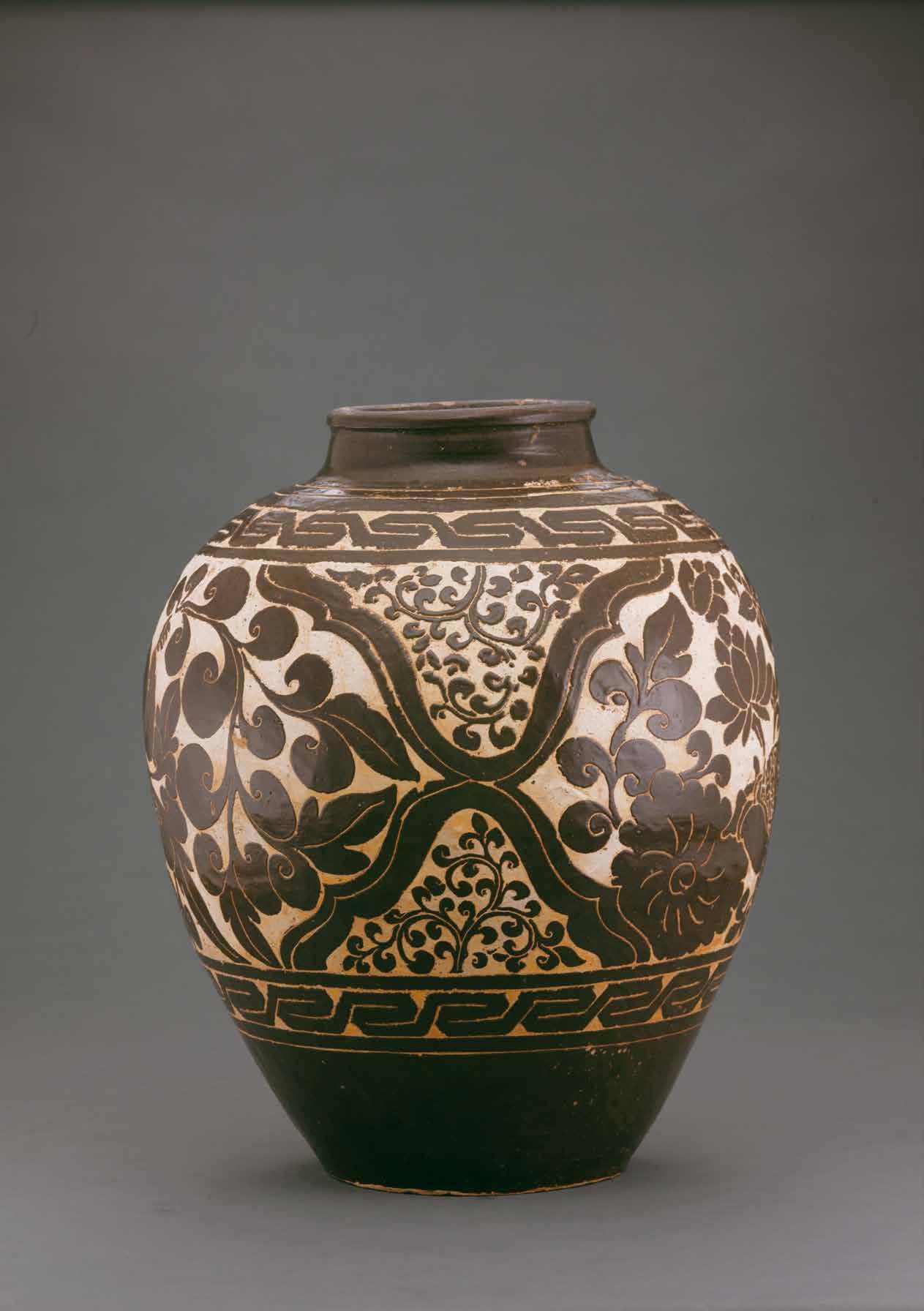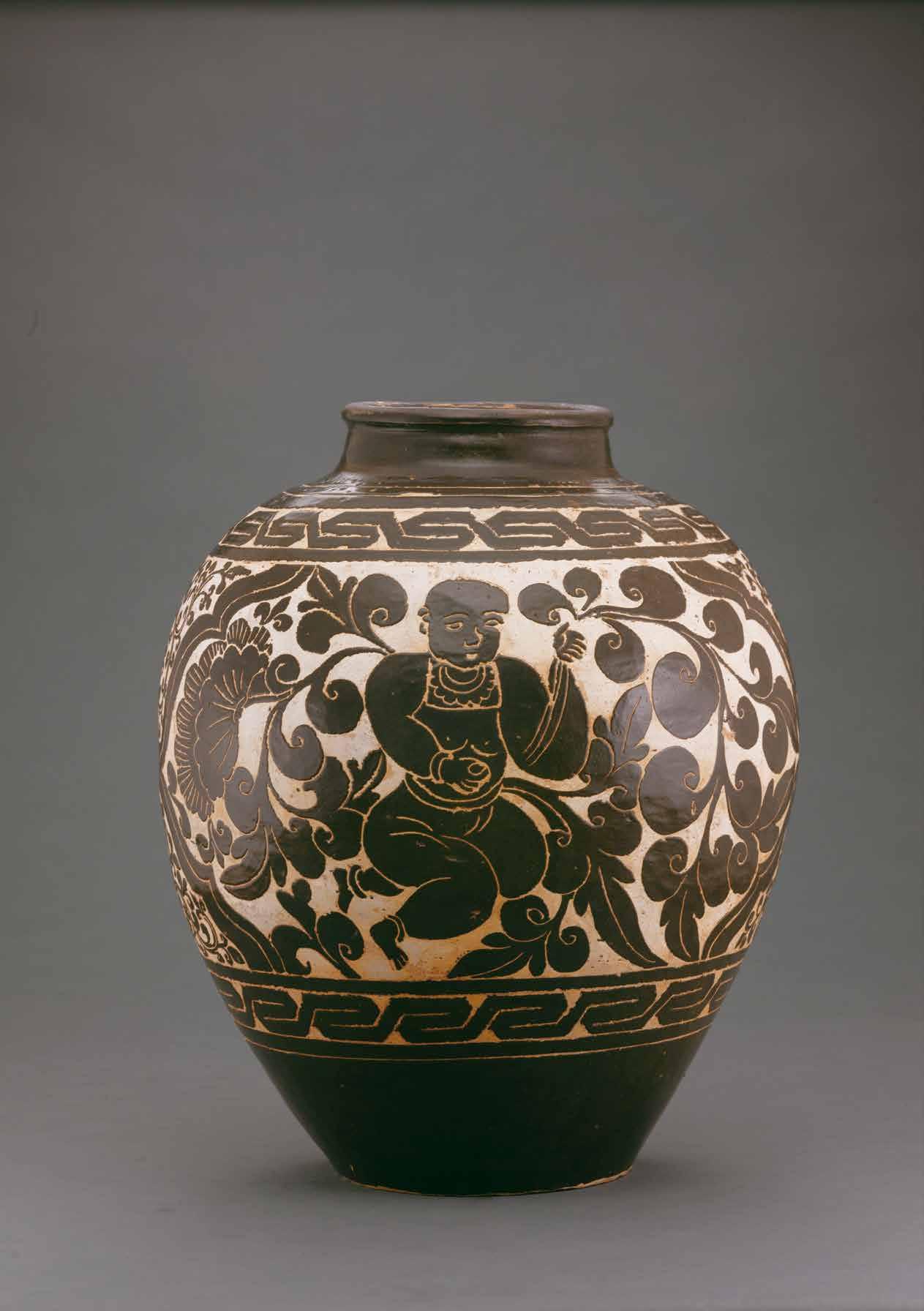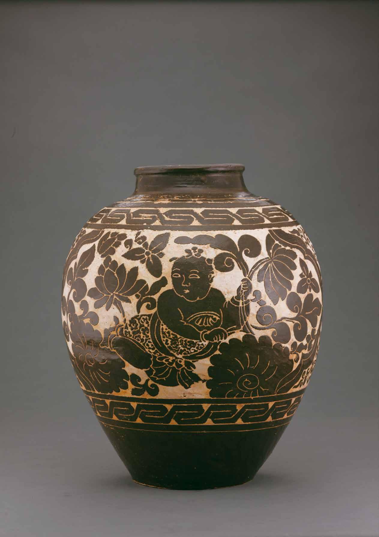 名品之一的金代磁州窯剔花嬰戲蓮紋罐展品 (No.31),器形碩大,圓肩鼓腹,上下分飾回
