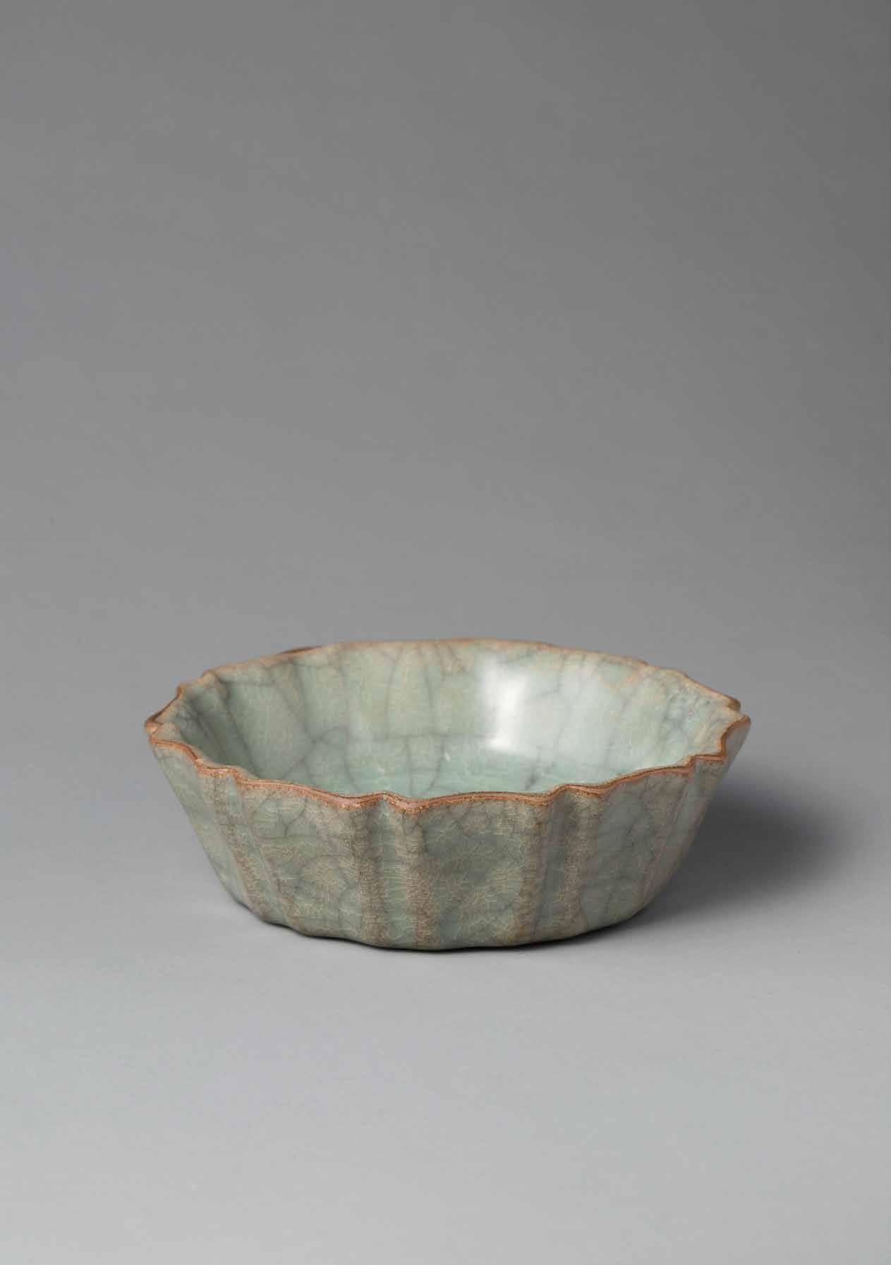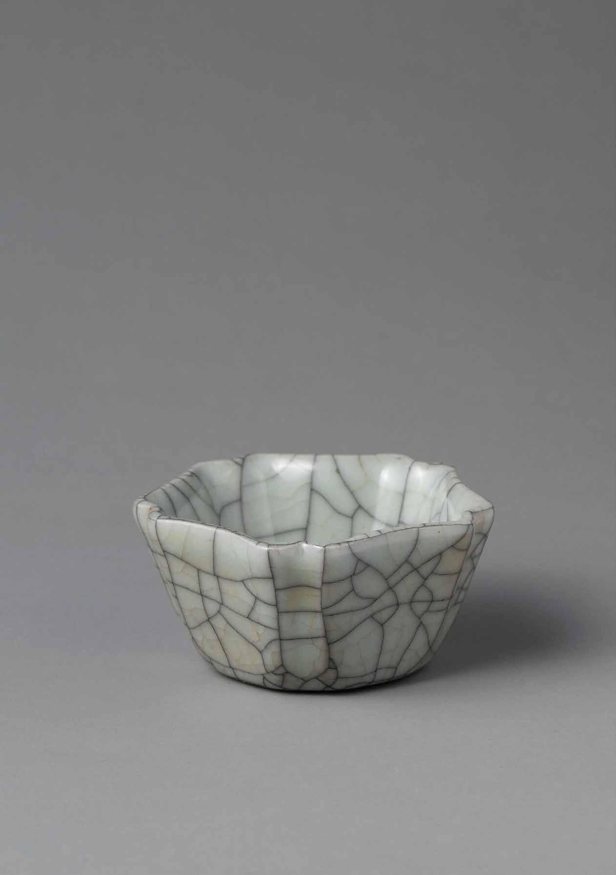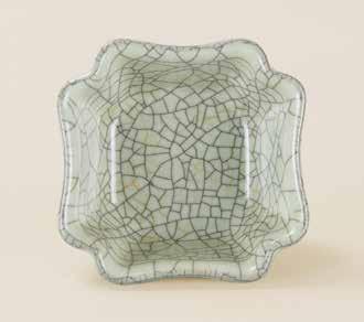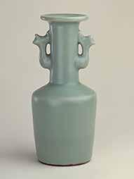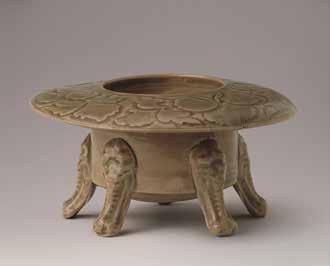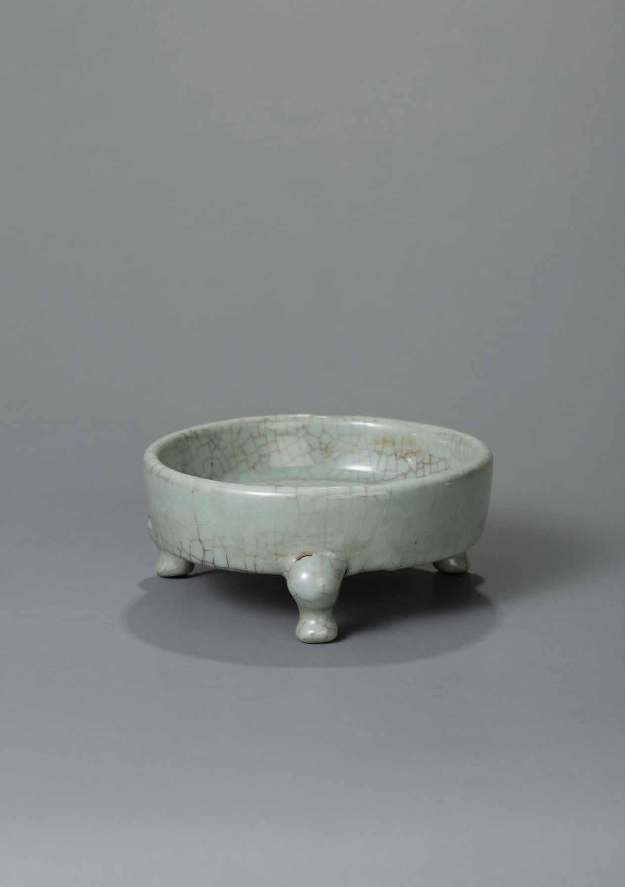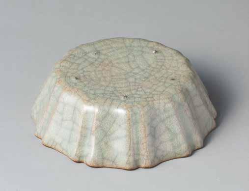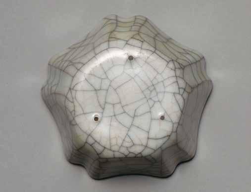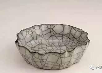 異同、比較關係。哥窯的最大特徵為「金絲鐵線」,燒造胎釉時的釉層膨脹收縮比例不同, 會有黃色細碎開片的「金絲」,和黑色大開片的「鐵線」,釉面呈現大小不一,不同深 淺層次開片,如本書展品的元代哥窯花口杯 (No.62)。官窯胎體較薄,可採吹釉法多次上 釉,因燒造時釉層的不同膨脹系數,產生各種不同美感趣味的開片和胎釉間的「紫口鐵足 現象」,而龍泉窯胎骨厚重,能夠一次黏附厚釉,胎釉收縮的斜線紋釉裂,不像官窯開片 般的鑑賞美感趣味,如南宋龍泉窯青釉雙耳三足爐 (No.59) 展品,宋龍泉窯青鳳紋耳瓶