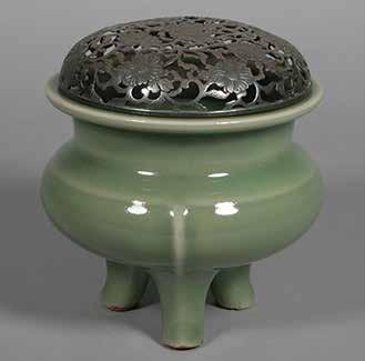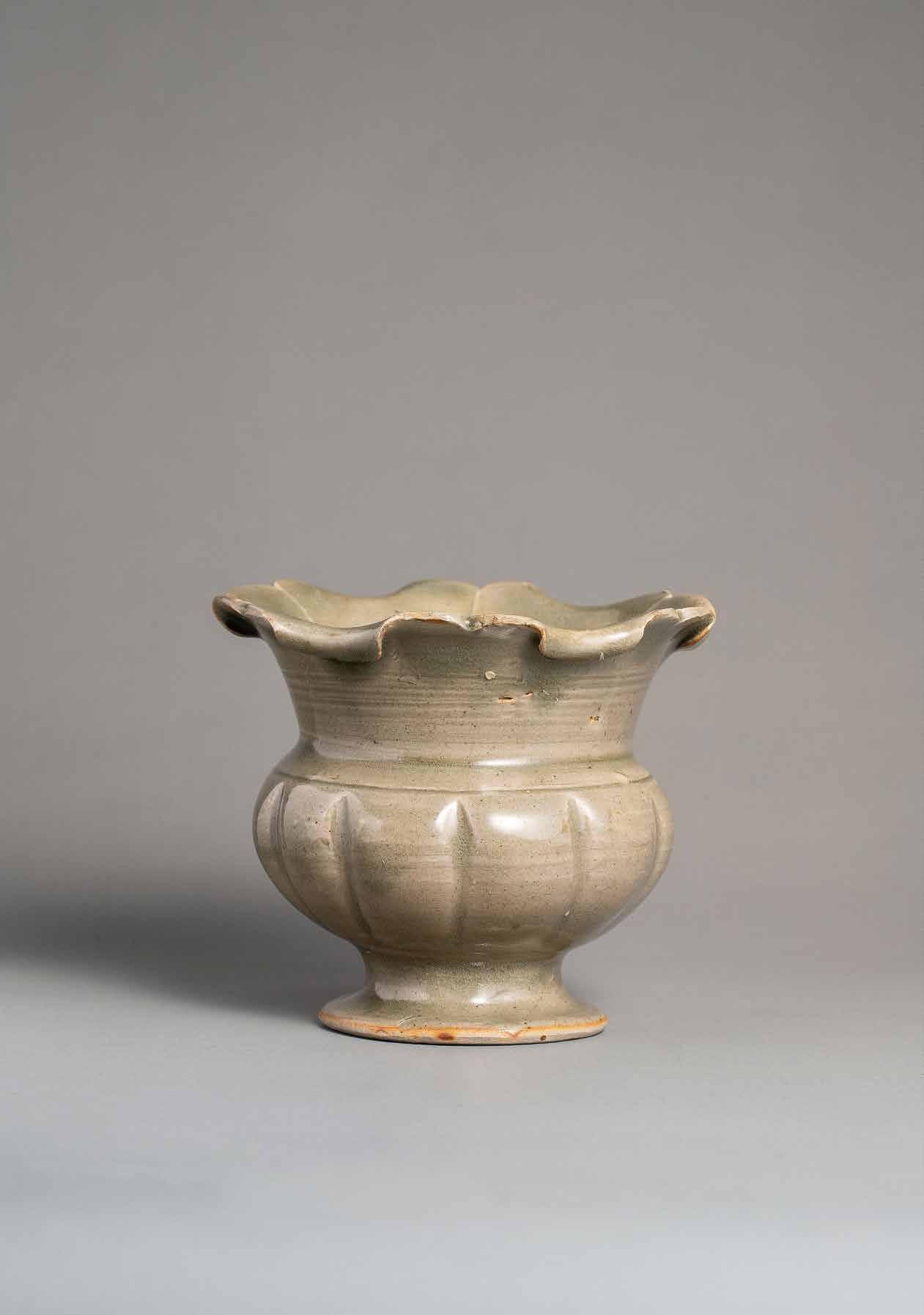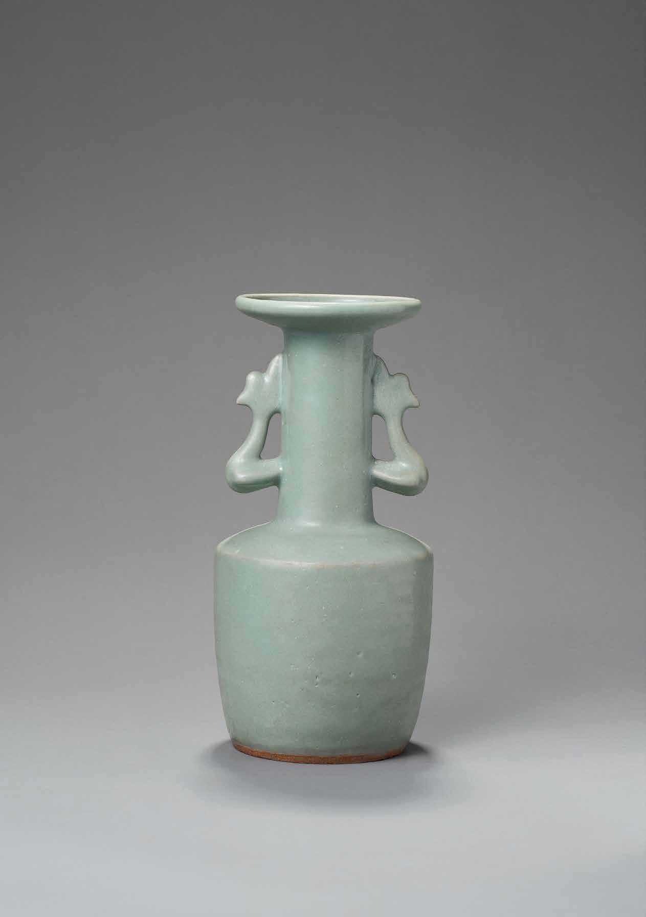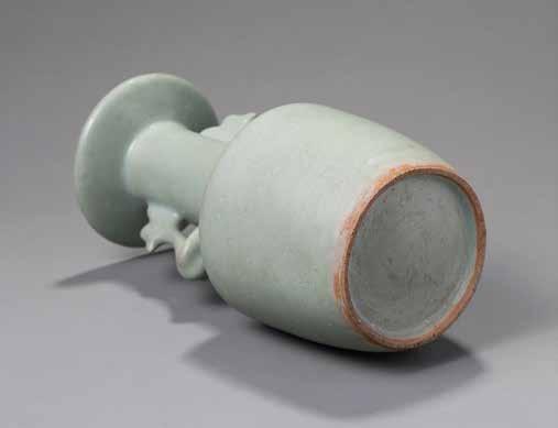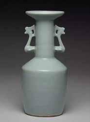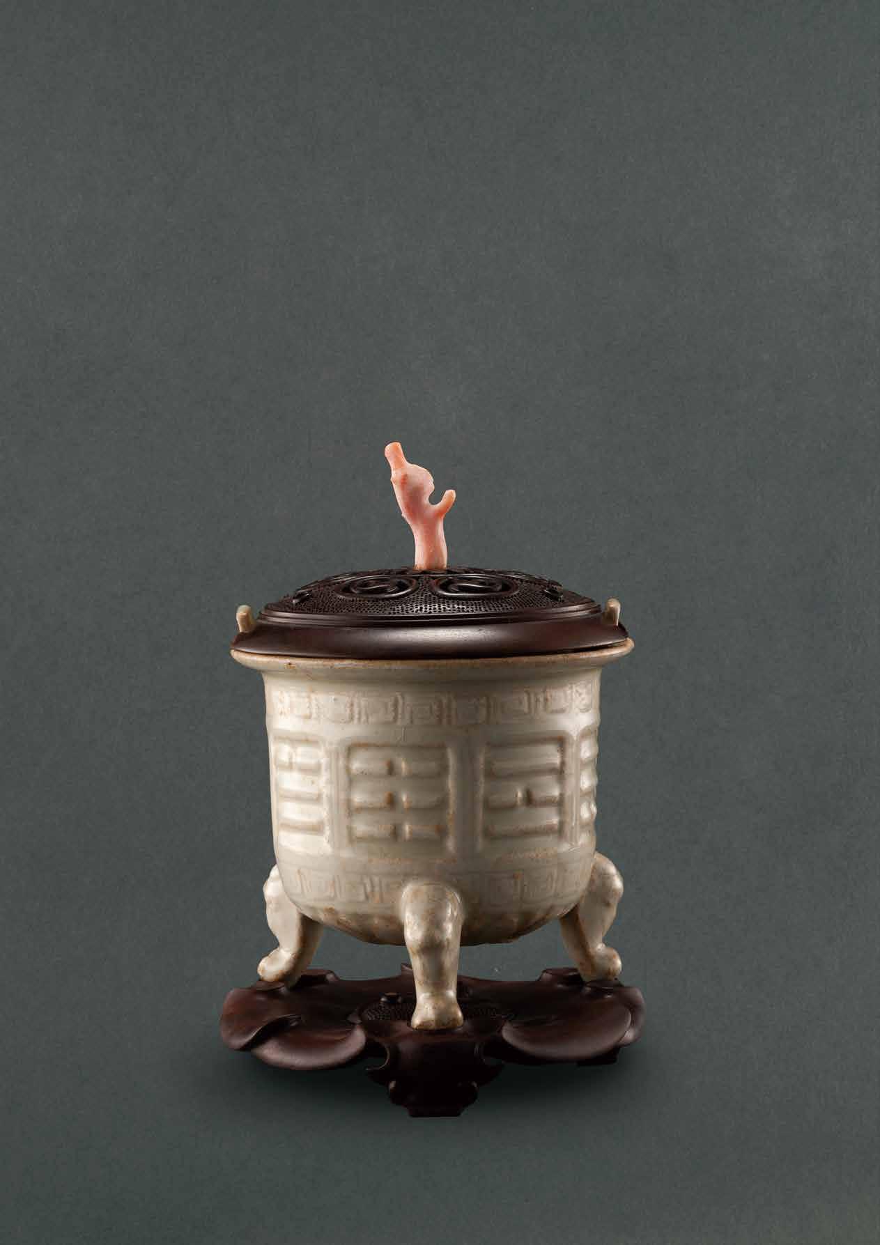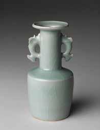 異同、比較關係。哥窯的最大特徵為「金絲鐵線」,燒造胎釉時的釉層膨脹收縮比例不同, 會有黃色細碎開片的「金絲」,和黑色大開片的「鐵線」,釉面呈現大小不一,不同深 淺層次開片,如本書展品的元代哥窯花口杯 (No.62)。官窯胎體較薄,可採吹釉法多次上 釉,因燒造時釉層的不同膨脹系數,產生各種不同美感趣味的開片和胎釉間的「紫口鐵足 現象」,而龍泉窯胎骨厚重,能夠一次黏附厚釉,胎釉收縮的斜線紋釉裂,不像官窯開片 般的鑑賞美感趣味,如南宋龍泉窯青釉雙耳三足爐 (No.59) 展品,宋龍泉窯青鳳紋耳瓶