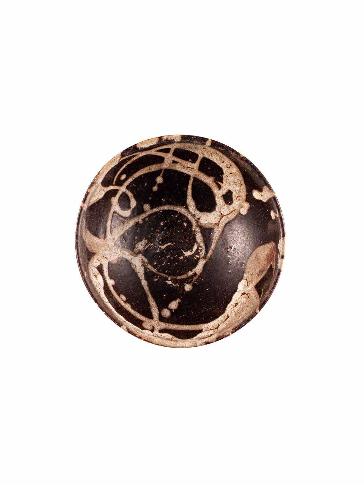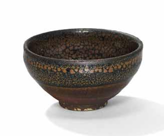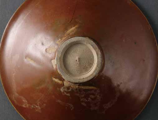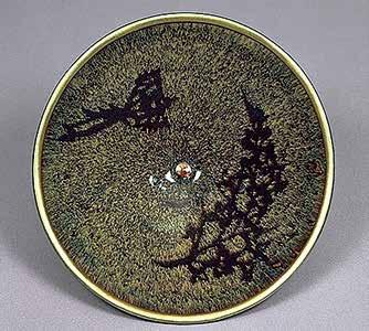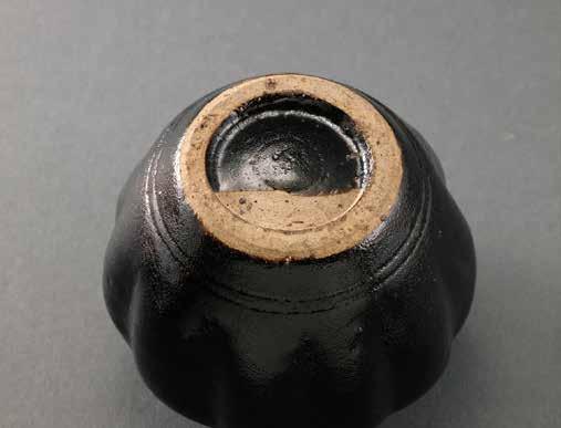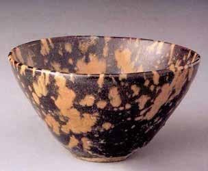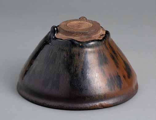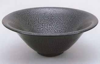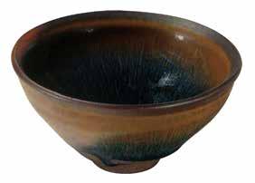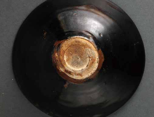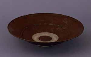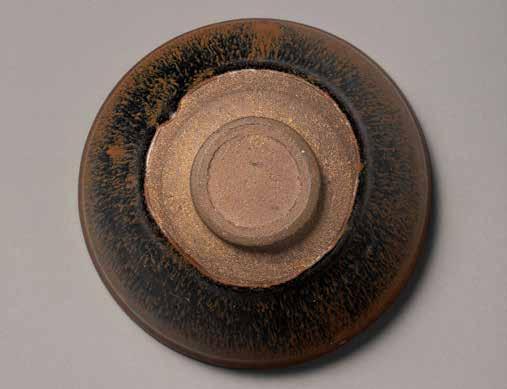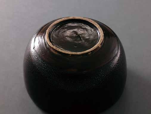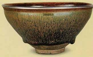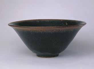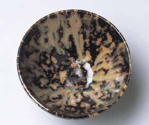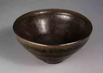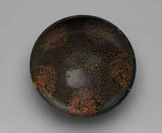 宋代茶道風靡全國,上至君王,下至士大夫、貴族文人,鬥茶風氣盛行,相對應於鈞 窯變色釉層的瑰麗斑塊,另一相關獨創性的飲茶黑釉盞具,成為冠絕一時的宮廷御用「供 御」、「進盞」等燒造器皿。我們可將多數宋代黑釉茶道盞具,區分為兩大系列:( 一 ) 依 據燒造條件的釉層表面變化,( 二 ) 依不同附加製作程序的化妝手法。宋代燒造系列之一的 黑釉茶具,不論其是鹼性或是酸性長石釉,常會混雜其他變異性的微量化學金屬原素,又 依各自燒造條件,產生不同的美學趣味變化。南北窯系不同黑釉,有的含微量的錳,釉面 變化微閃紫光,有的含少量的鈷,釉面微閃藍光,有的含微量的鉻,釉色黑中帶綠,形成 的黑色釉茶具,如兔毫紋、油滴斑、鷓鴣斑、鐵紅釉、鱔皮釉、星盞、曜變等。宋代系列