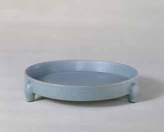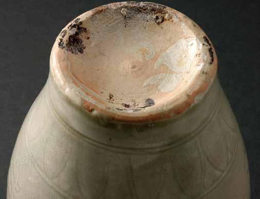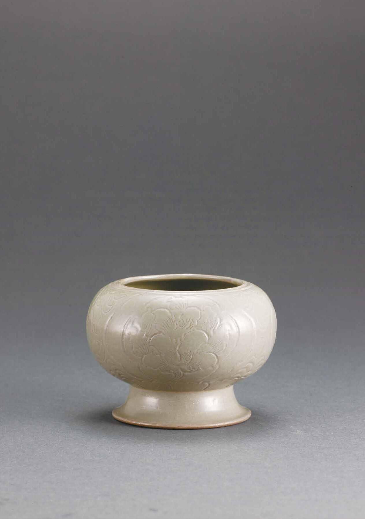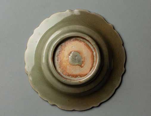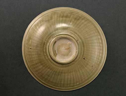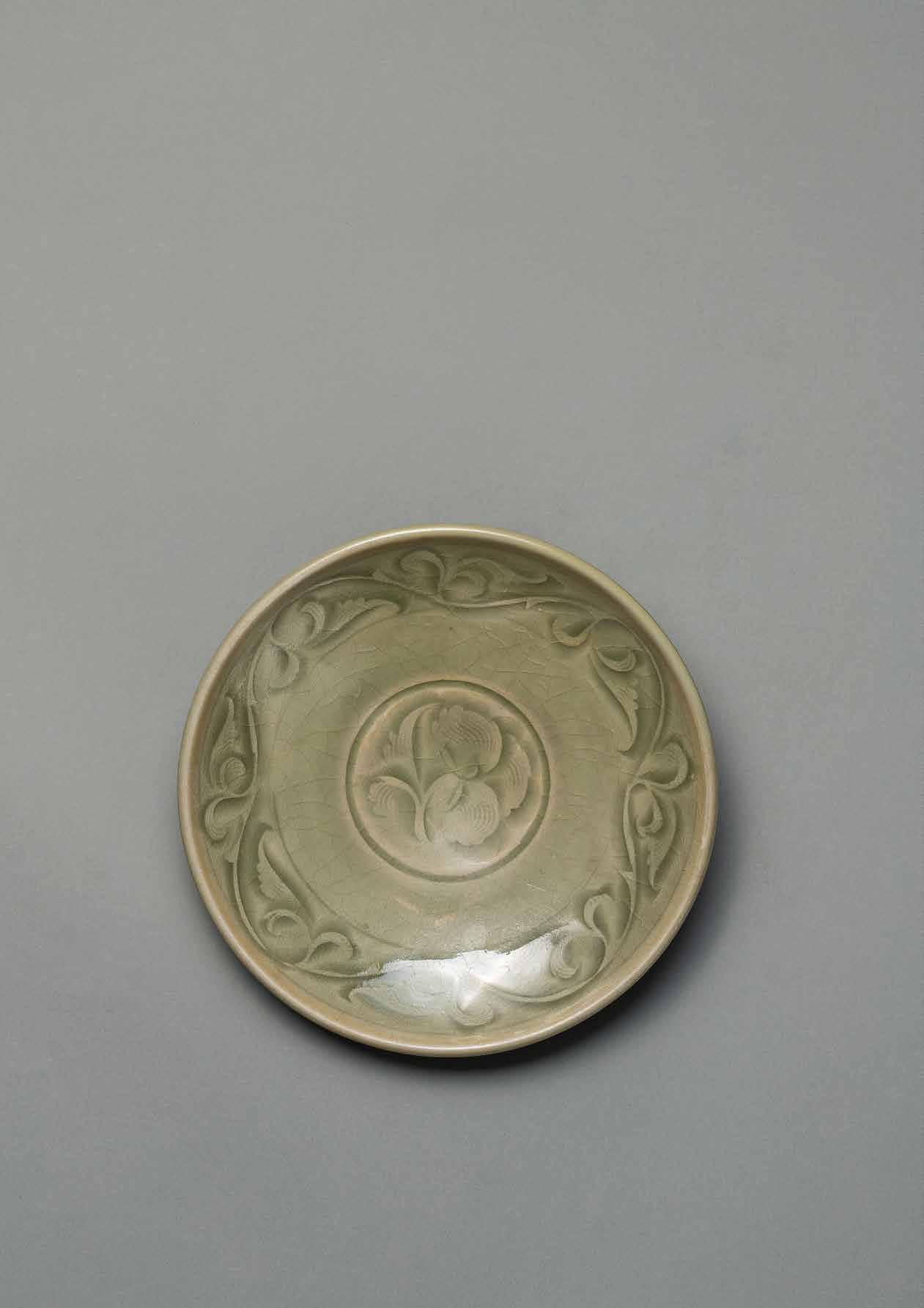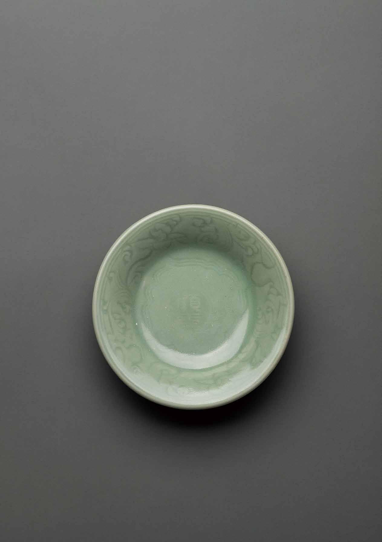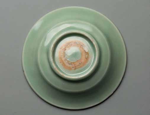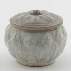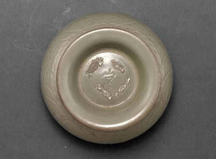 豆形小罐 (No.53),器身圓腹劃花,三朵寶相牡丹,圈足墊燒刻「官」字銘款,本件越 窯官字款豆形罐的天青釉色,與法門寺出土的青釉瓷器色調、上海博物館所藏秘色瓷刻蓮 瓣紋蓋罐,及英國牛津大學阿希莫林博物館的青釉蓋罐,屬於同類秘色瓷釉系統。五代越