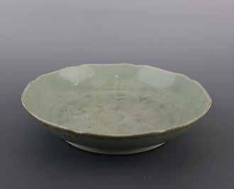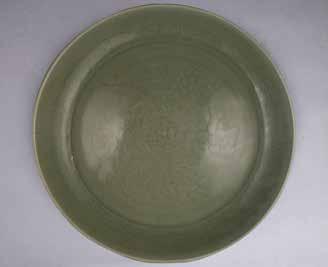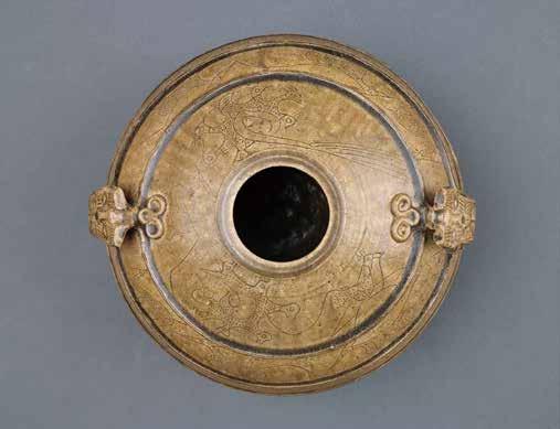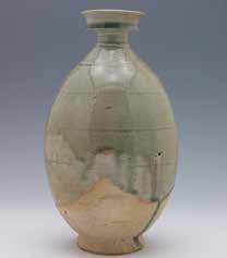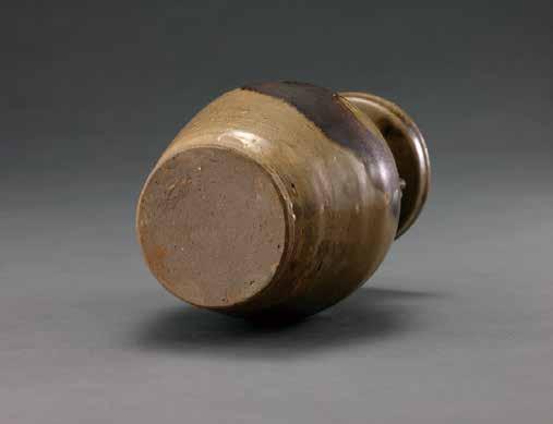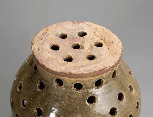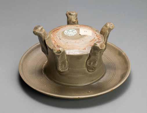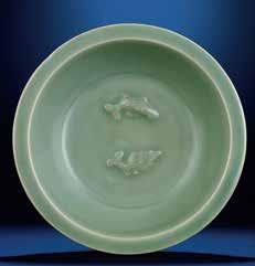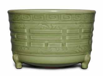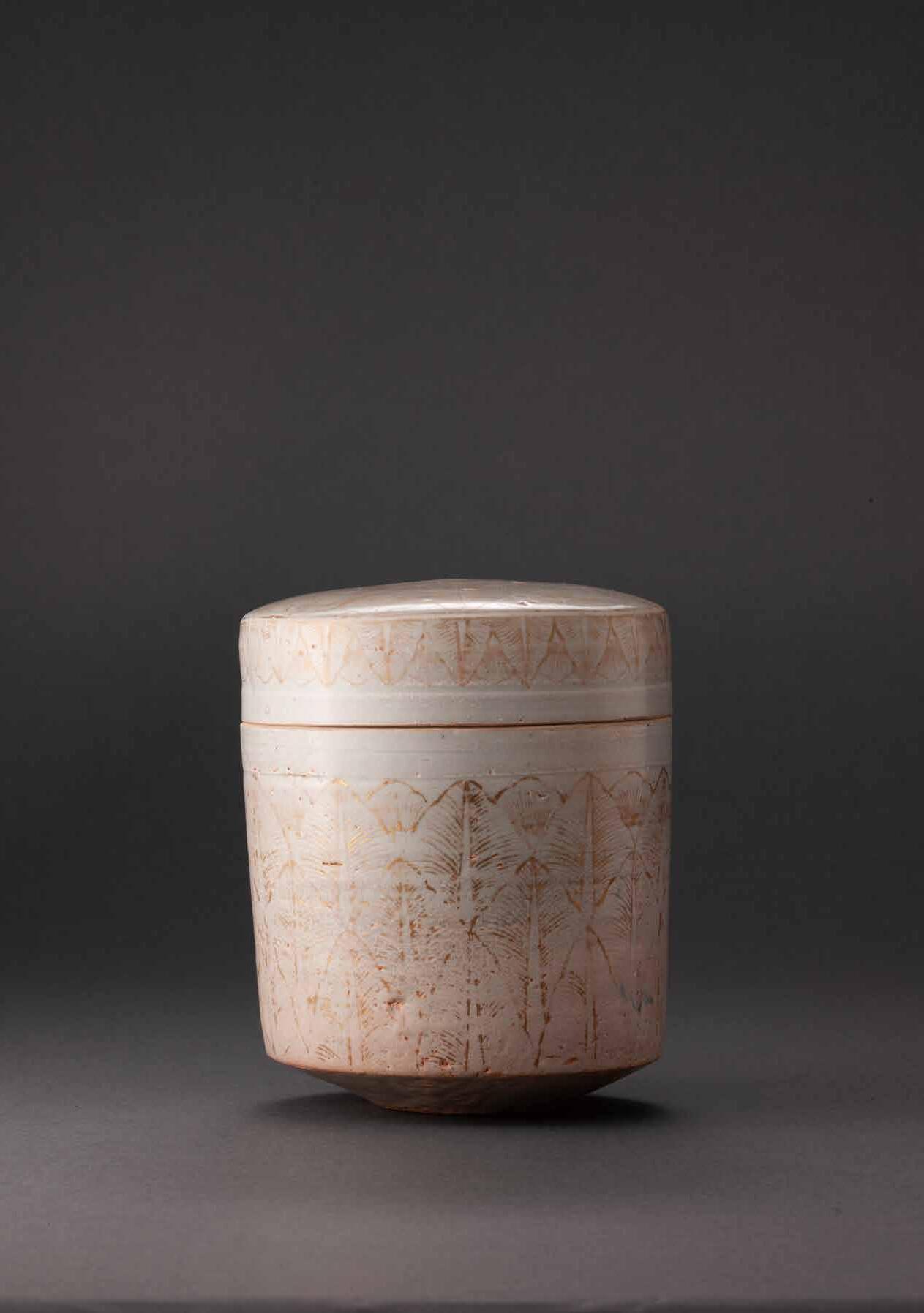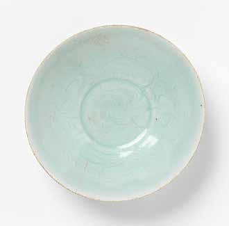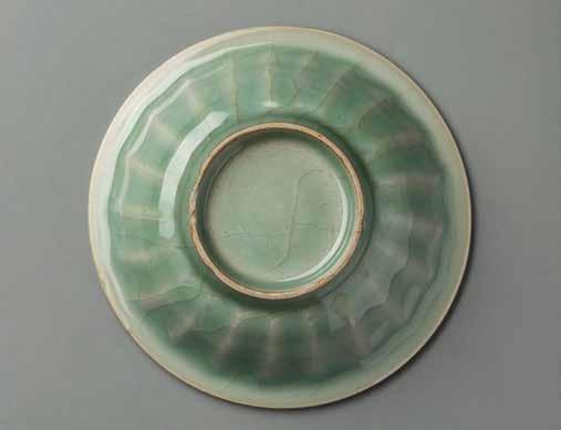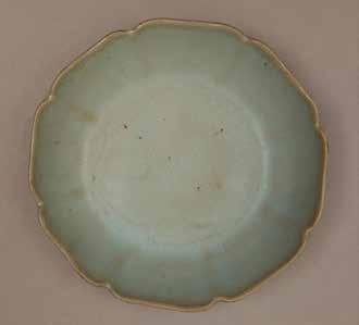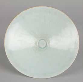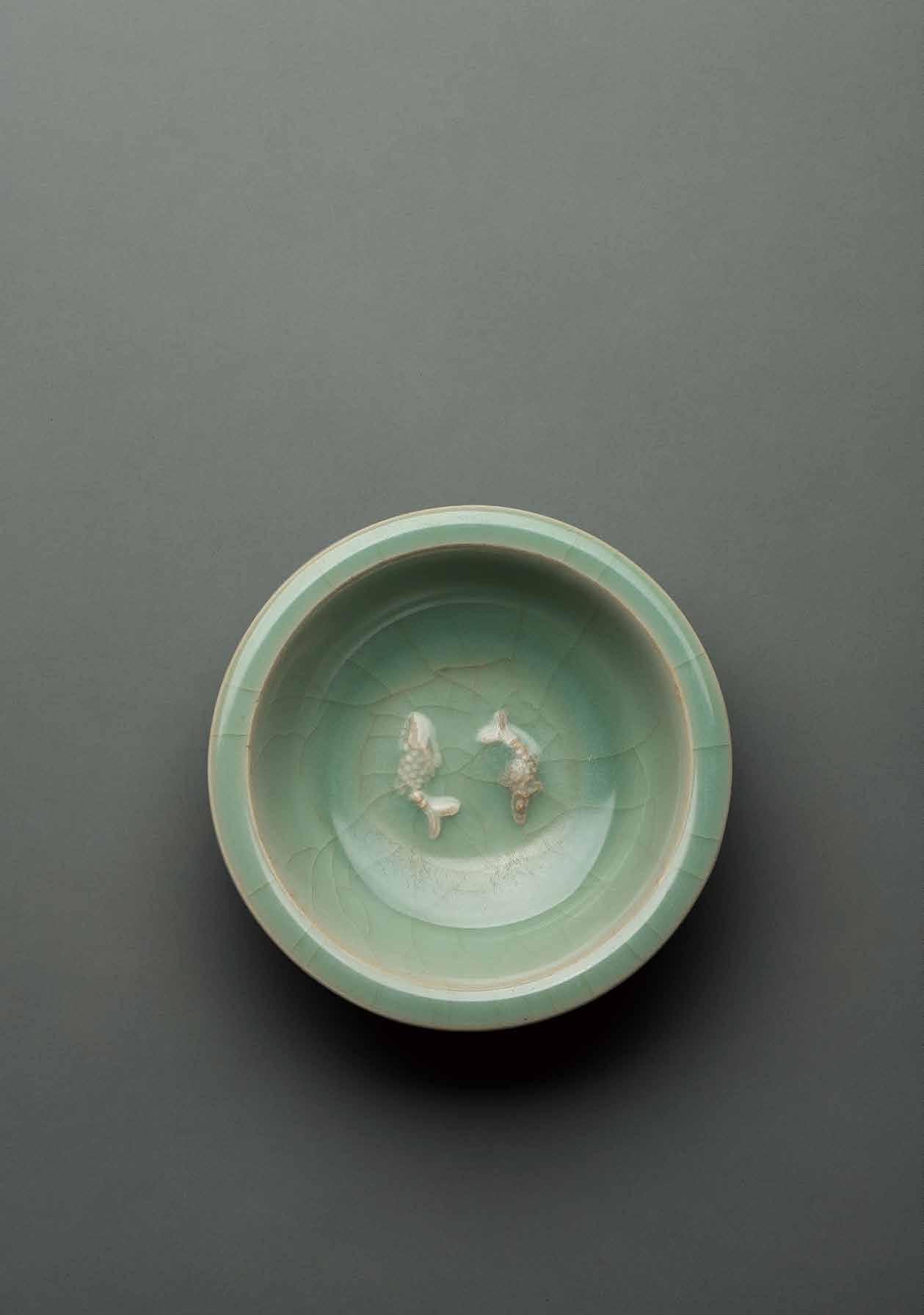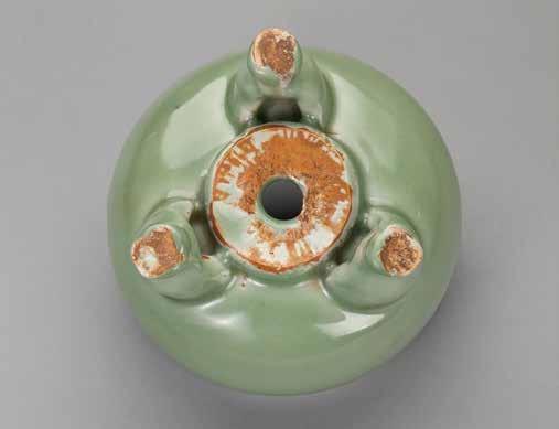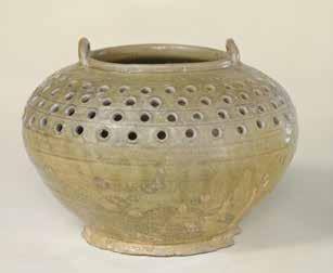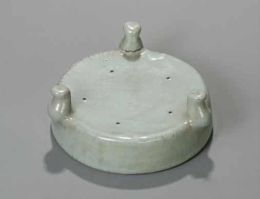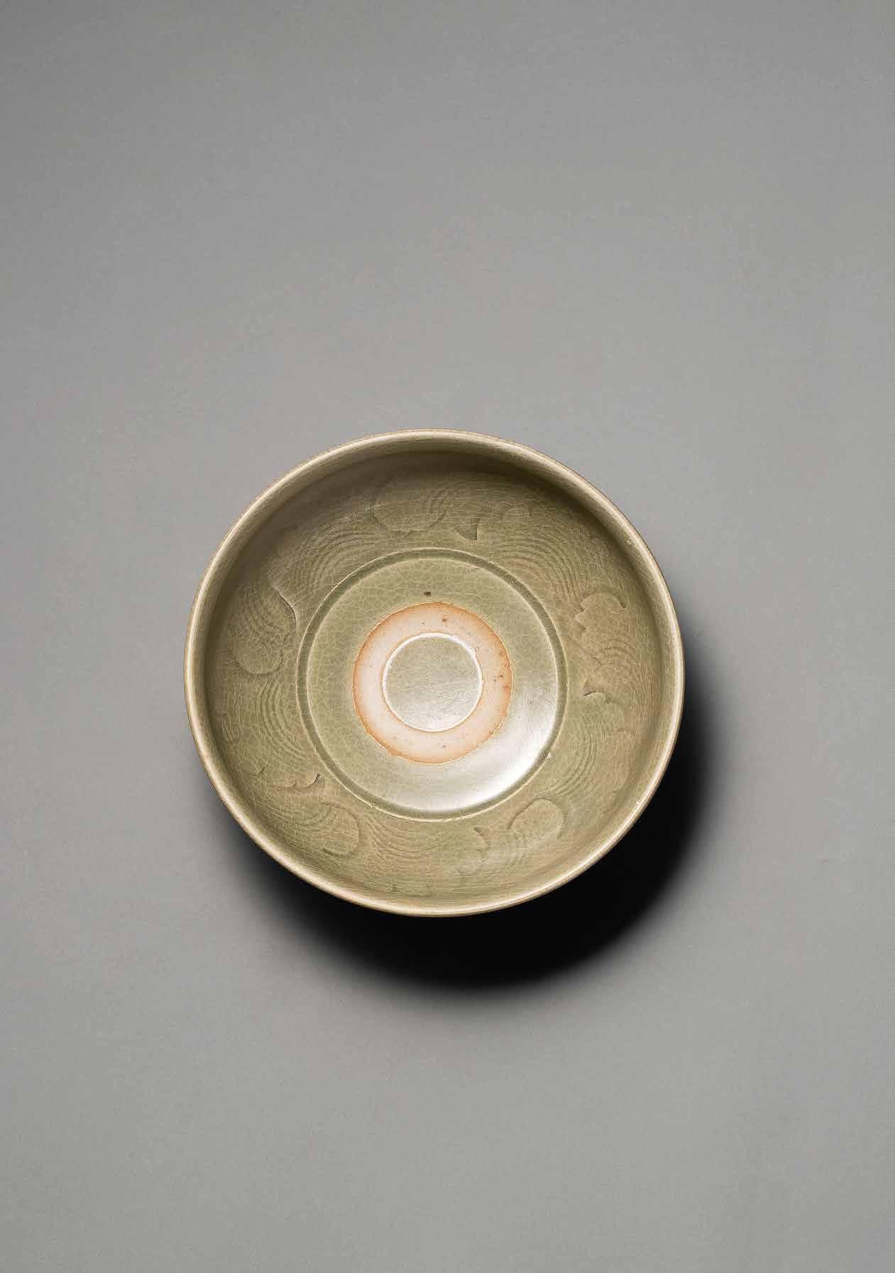 豆形小罐 (No.53),器身圓腹劃花,三朵寶相牡丹,圈足墊燒刻「官」字銘款,本件越 窯官字款豆形罐的天青釉色,與法門寺出土的青釉瓷器色調、上海博物館所藏秘色瓷刻蓮 瓣紋蓋罐,及英國牛津大學阿希莫林博物館的青釉蓋罐,屬於同類秘色瓷釉系統。五代越