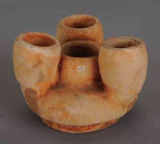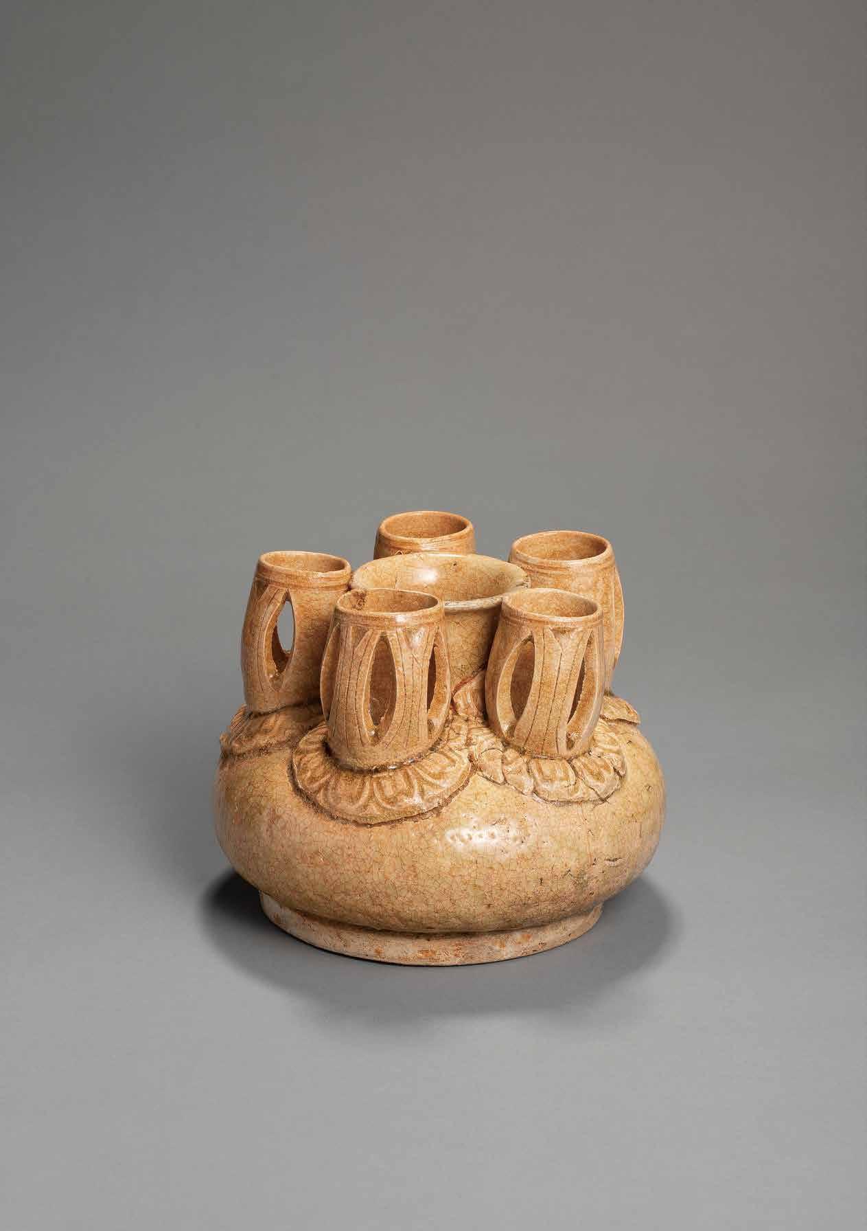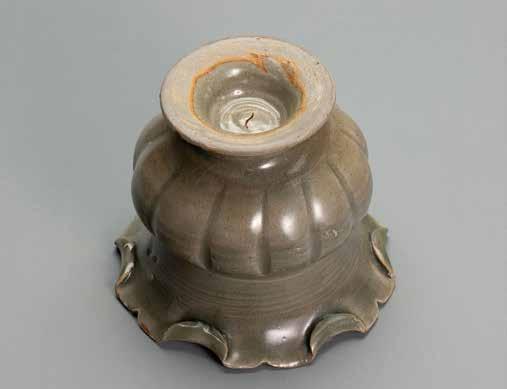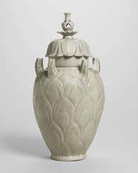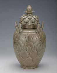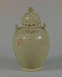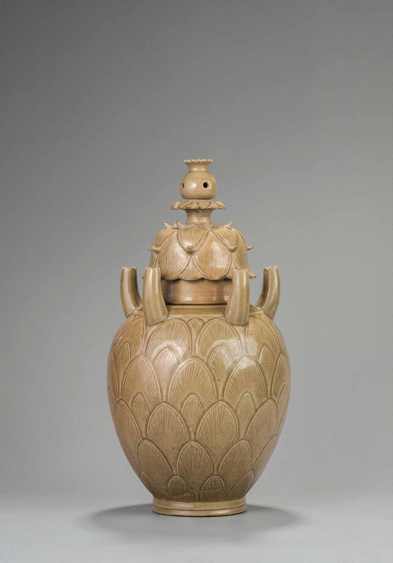 窯蓮瓣五管瓶展品 (No.52),造型結合盤口瓶和多管瓶特徵,器身刻劃多層蓮瓣紋飾,蓋 頂加飾塔剎寶珠紐,類似風格的越窯瓷瓶,見諸 2015 年紐約三月份養德堂專拍,和北京