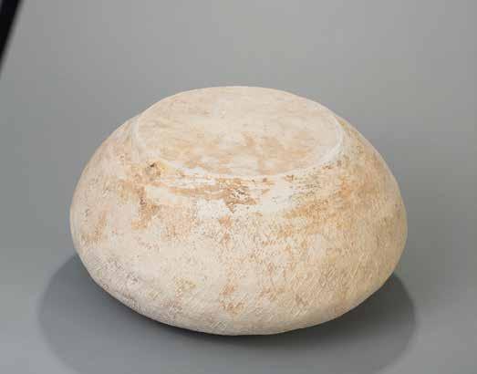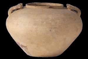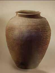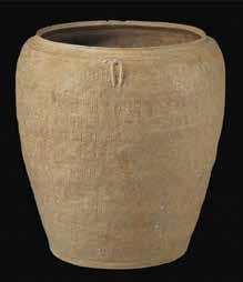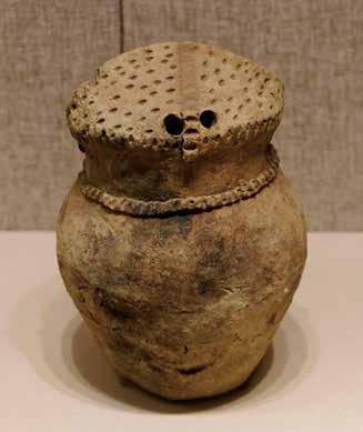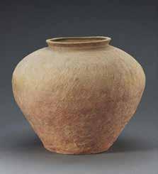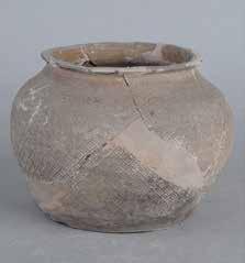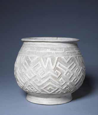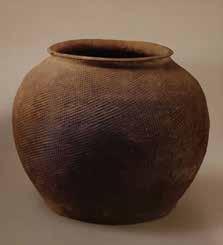 展品商代 白陶印布紋罐 (No.4),以泥條盤築器胎,模印拍打絲麻布紋,展現原始古陶濃 厚的裝飾 藝術趣味。