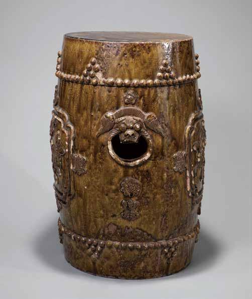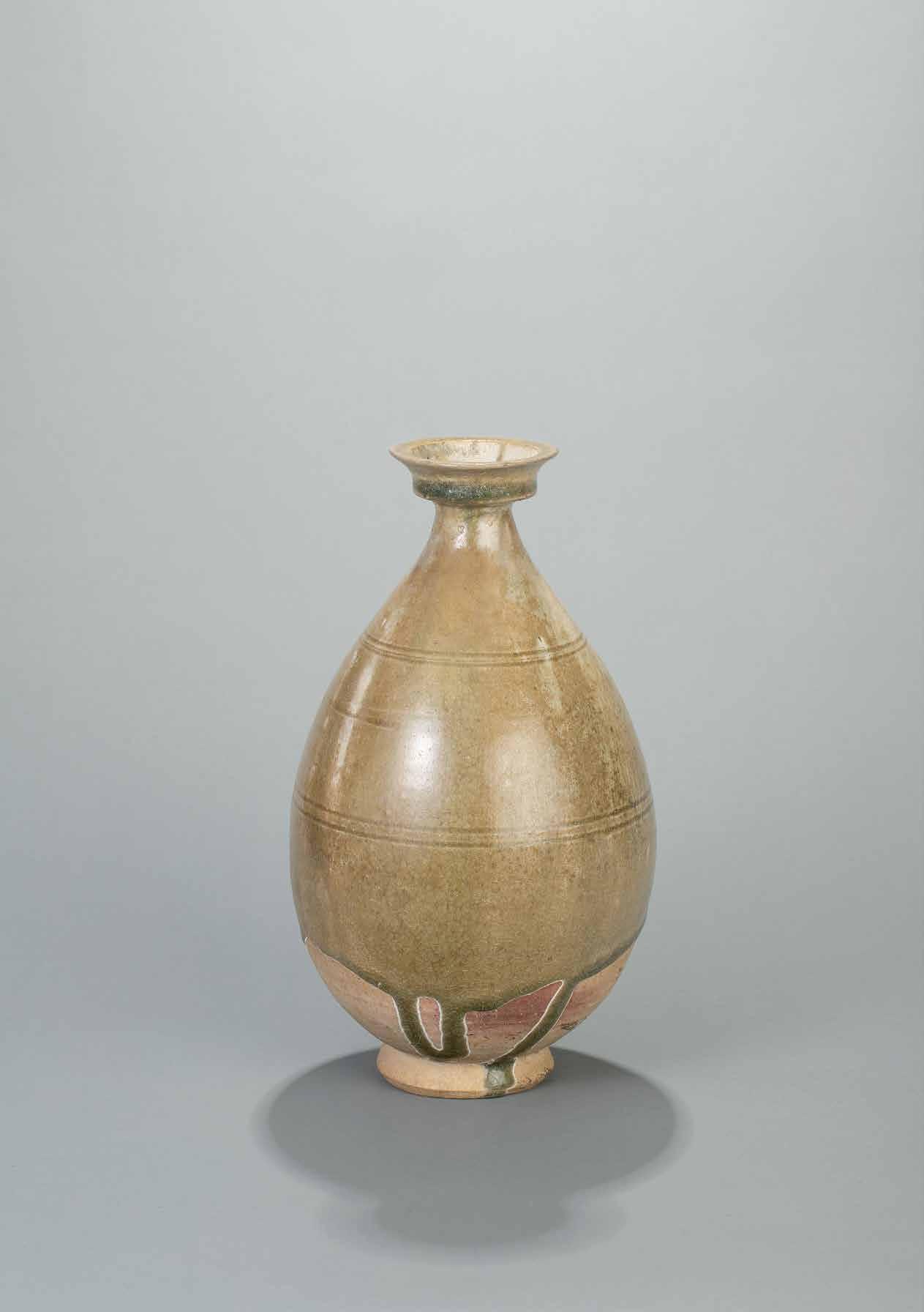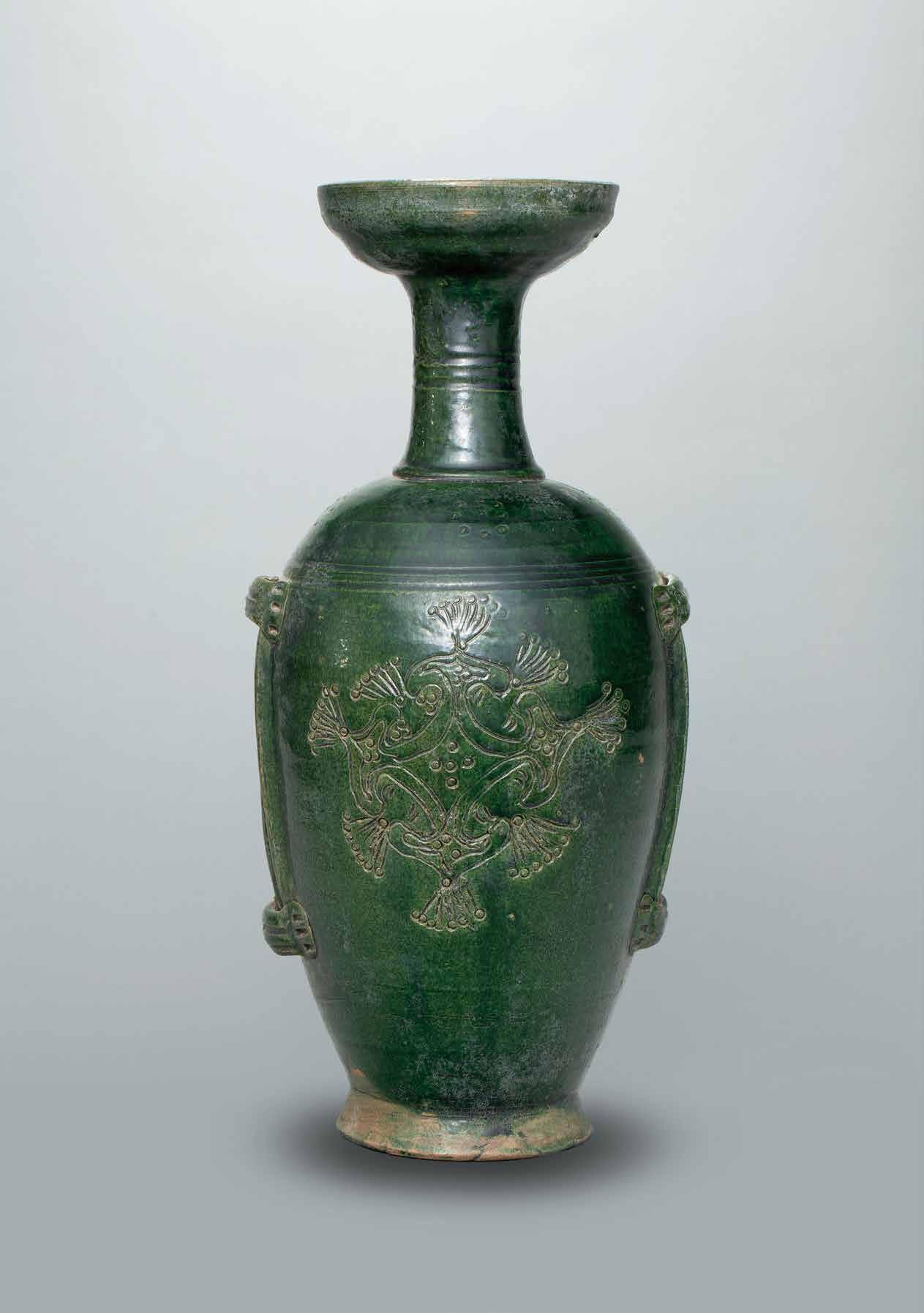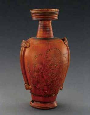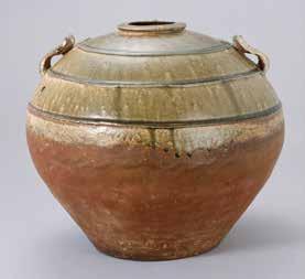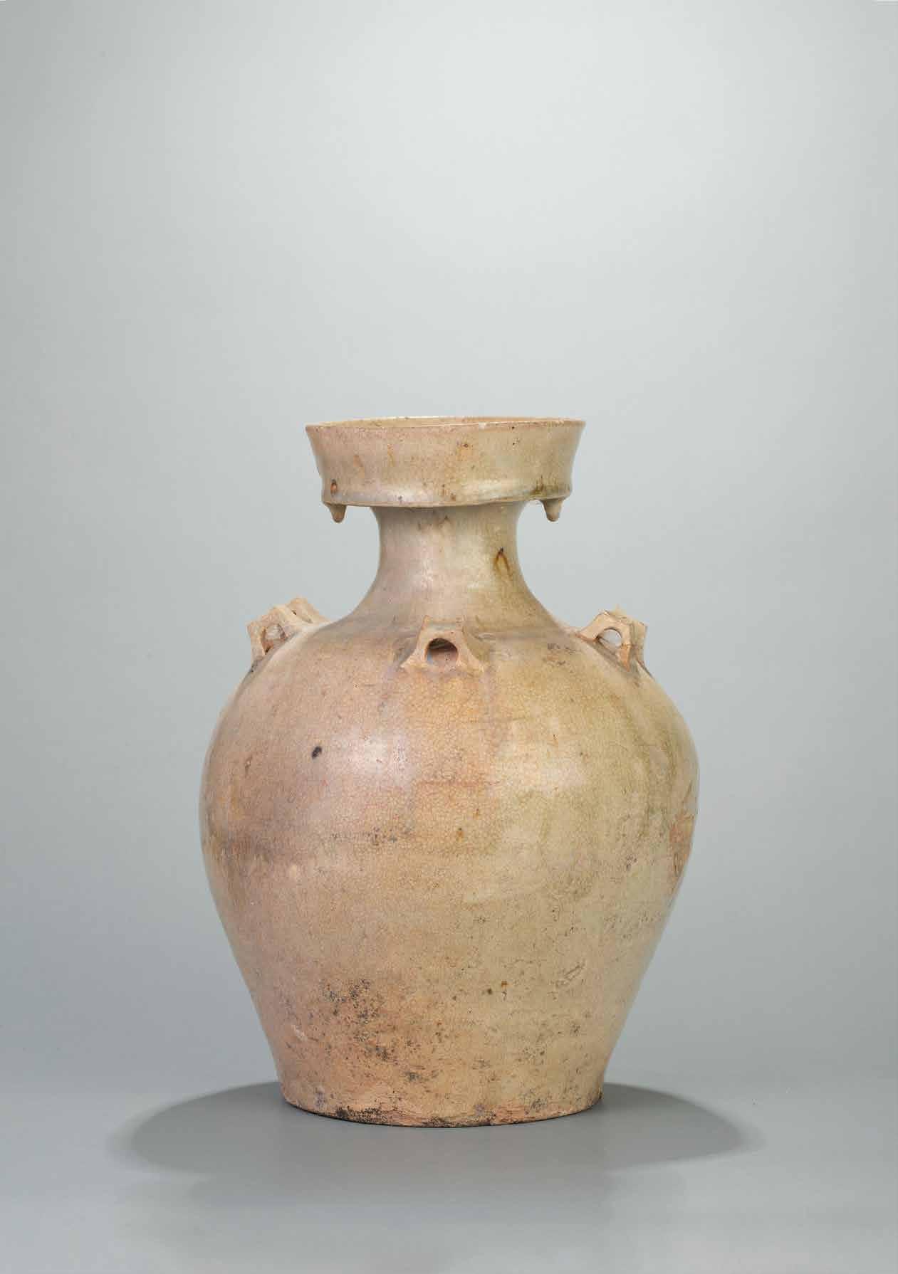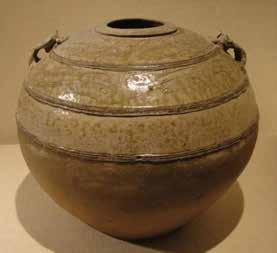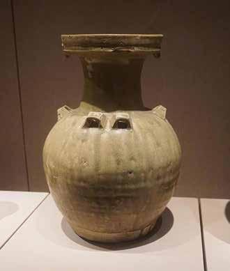 的 (No.10) 戰國原始青瓷鋪首尊,採用瓷土製胎,器表施加鹼性石灰釉,釉中含微量鐵質, 自高溫硬陶發展而來。瓷器到了漢代以後,釉料突飛猛進的改良,存在不同施釉方式,凡