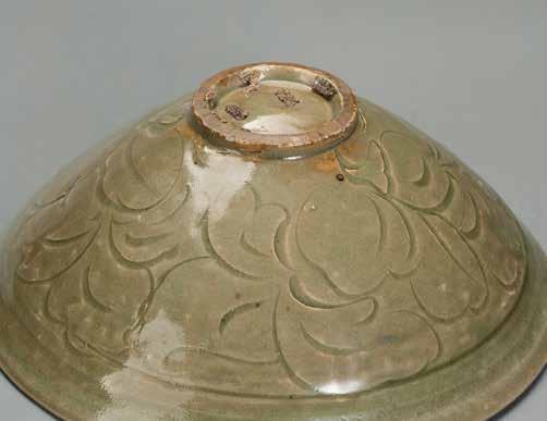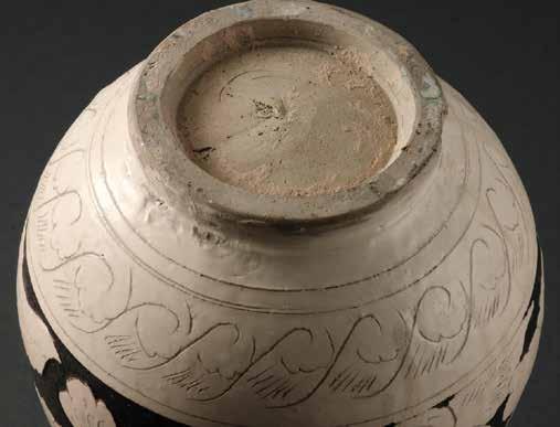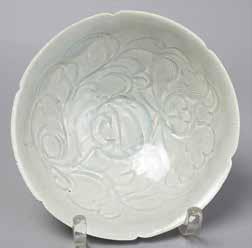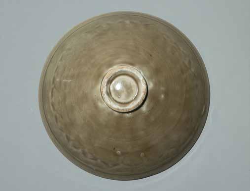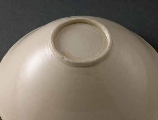 刀劃開素體胎面,再以大斜刀法切割,削剔去除紋樣外緣胚土,刻劃出所要表現的牡丹花 紋,形成饒富光影變化的視覺面向美學,此等直角偏刀深刻紋飾,仿自唐代雕漆的匠心獨 運刀法,別出心裁,引人入勝。本書白釉官造風格的北宋定窯大碗實例展品 (No.46,其