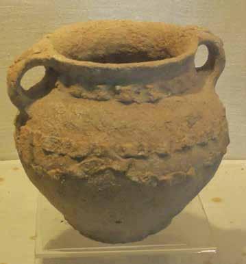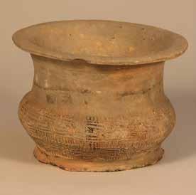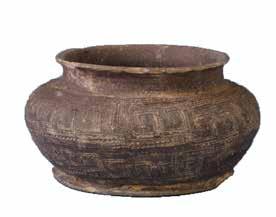 尊 (No.5) 展品,灰褐胎質,頸飾弦紋,腹部飾仿銅器雲雷紋,加飾箆紋,迄周代晚期展品