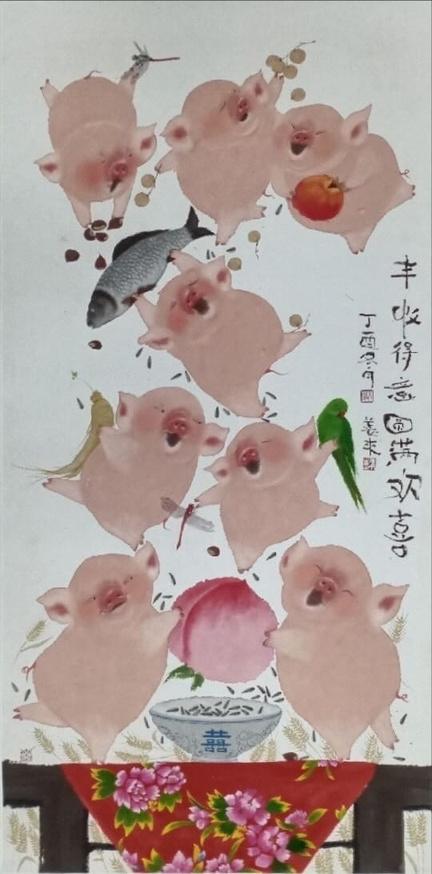 姜來擅⻑⽔墨沒⾻畫法,中國傳統的沒⾻畫法多以⼭⽔花⿃為主,她卻 獨闢蹊徑多以豬為主題,畫⾵既保留了中國⽔墨畫的精氣神,也融合了 西⽅的技法,造型簡單,顏⾊乾淨,給⼈⼀種舒適、愜意的感覺。姜來 的小豬明亮通透,簡潔乾淨。小豬的造型千姿百態:戲⽔的小豬,⾶翔 的小豬,戲蝶逗弄蟋蟀的小豬……姜來認為⾃⼰畫豬其實是在畫⾃⼰的 ⽣活態度。「⾃古以來『豬』在中國⼈⼼中的地位很⾼,⺠間有『諸事 順利』之說,豬代表了財富、奉獻、感恩、福氣,是⼀切幸福的基礎, 同時也是財富的象徵。我們中國的存錢罐就是豬的形狀,而國外,存錢 罐的英⽂也是piggybank。我畫的是豬,但我想表達的更多的是⽣活 狀態,與其說穩定不如說富⾜,說富⾜不如說滿⾜。」