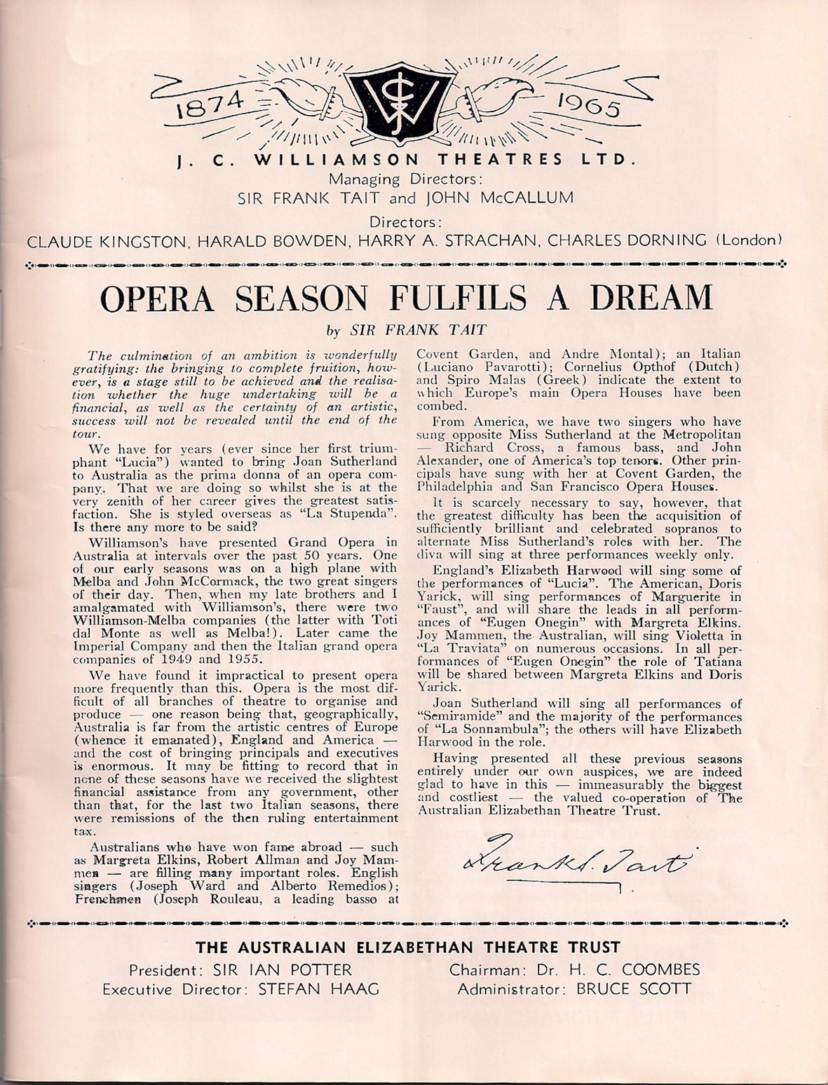 InRichard Bonynge’s words: “Sir Frank Tait has done the greatest service to Australian Theatre and to the arts of anyone we know.”