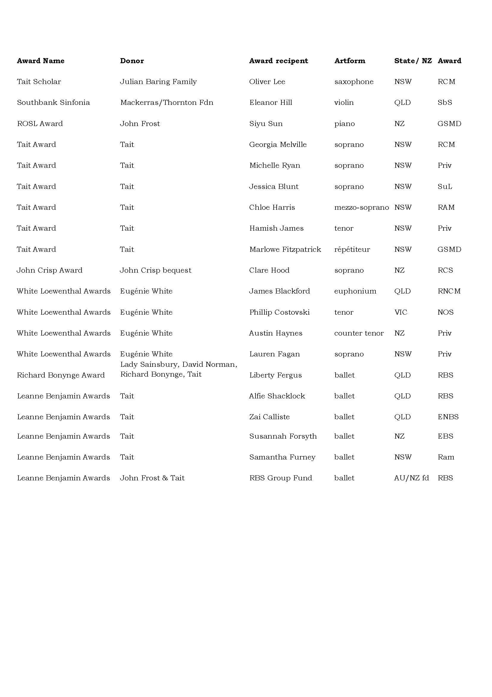 Award Name Donor Award recipient Artform State/NZ AwardJohn Crisp