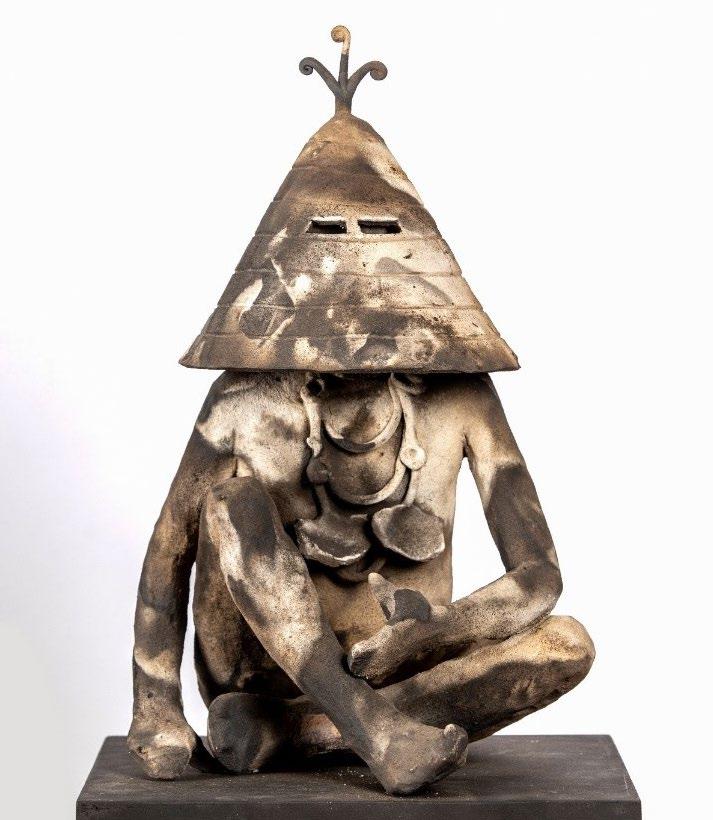 李永明以陶塑為主要創作形式,從蘭嶼田 野調查出發,關注達悟族的生活與文化, 以土與火淬鍊出自然與人文交融的溫度。 作品〈憩〉描繪達悟男子戴上銀盔、曲膝端 坐的姿態,神秘而優雅。經高溫 1240℃ 燒製,表面肌理留有火紋與素土的質樸色 澤,流露出島嶼居民恬淡悠然的氣息。那 是將萬千雜慮坦然釋懷的瞬間,讓心在遼 闊天地間,靜靜歇息。